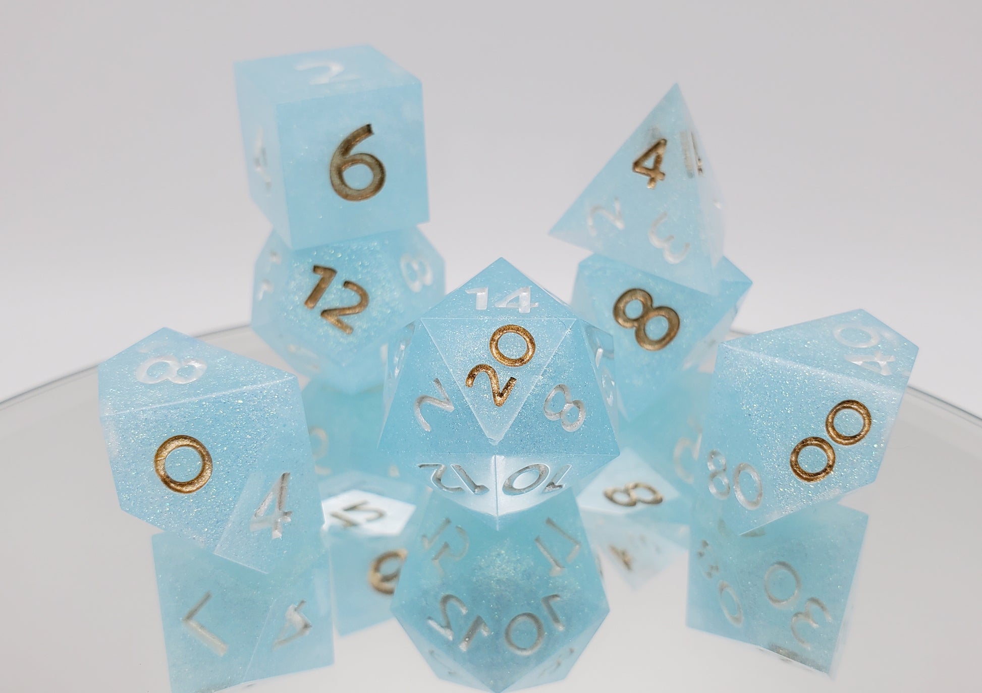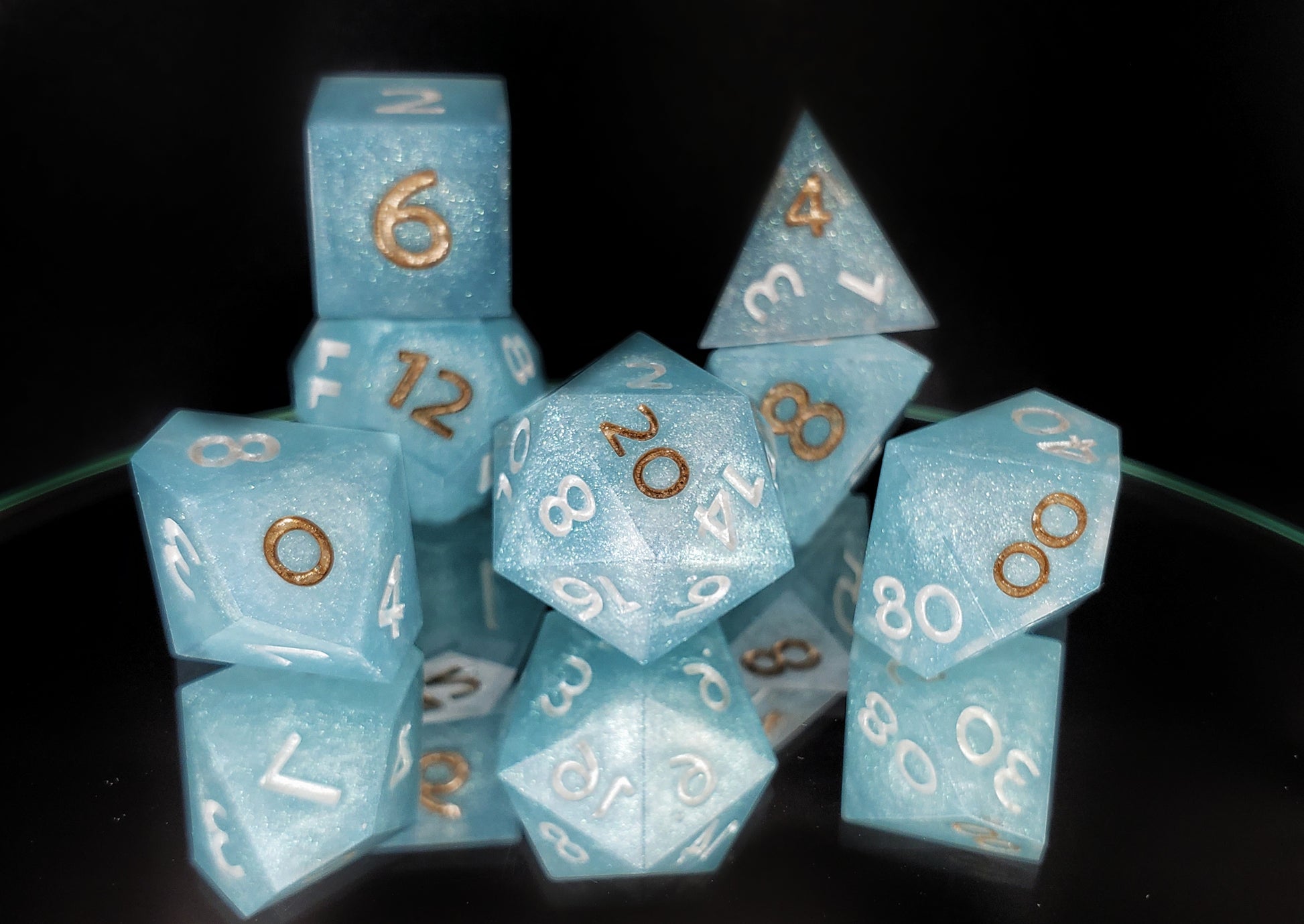 *Dice are entirely handmade from start to finish and therefore may have minor imperfections or color variations. Pictures are representative of the color and style but your exact set may vary. Please note color calibration of your screen may also vary. While they are just as balanced as commercially produced dice, it is recommended handmade dice be used for casual play only.