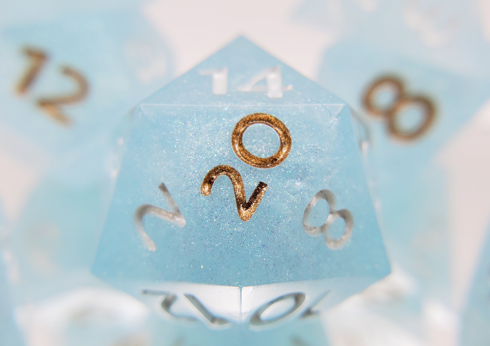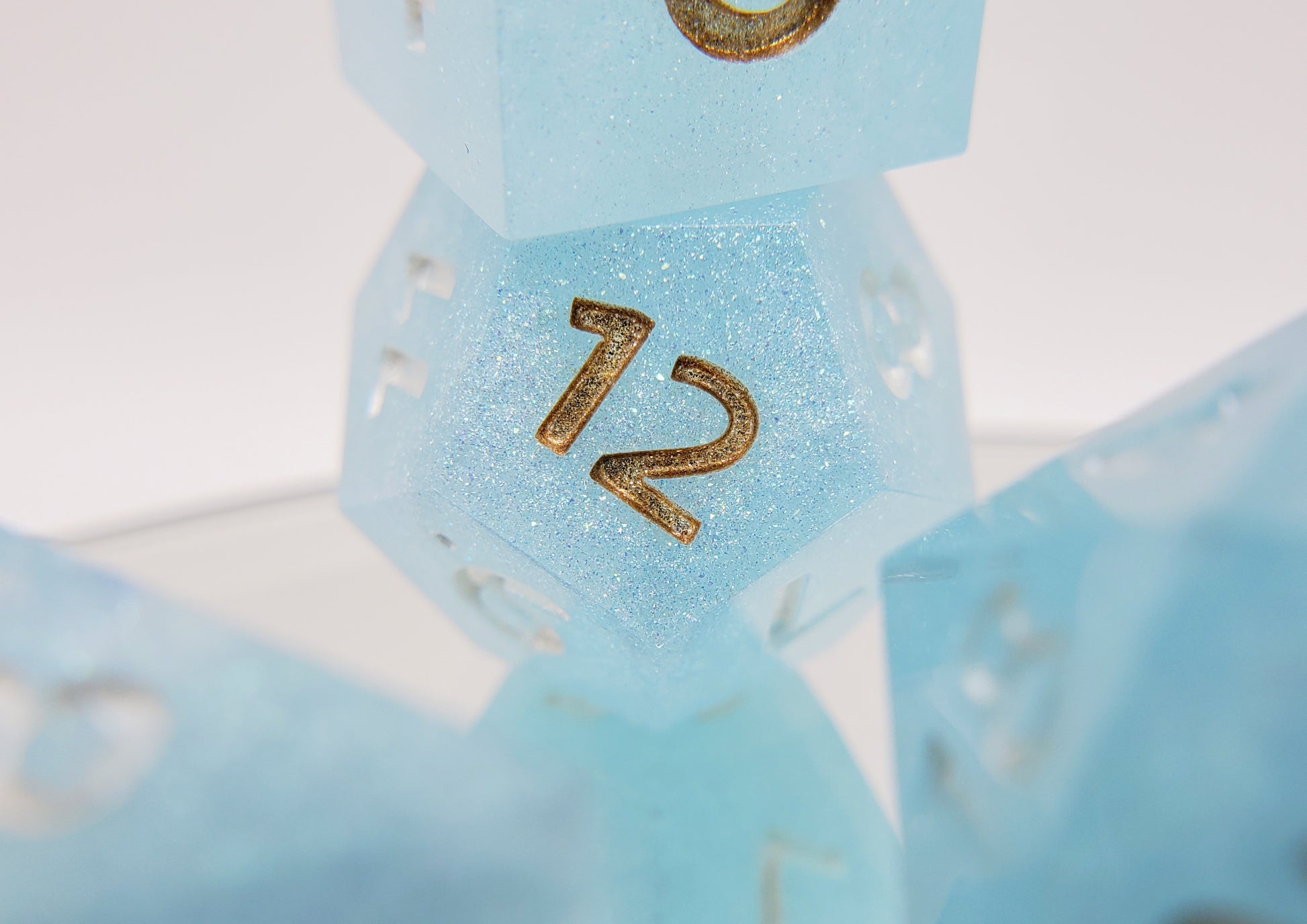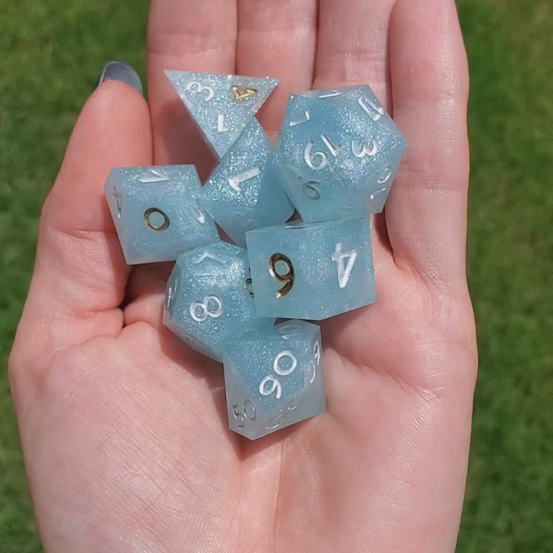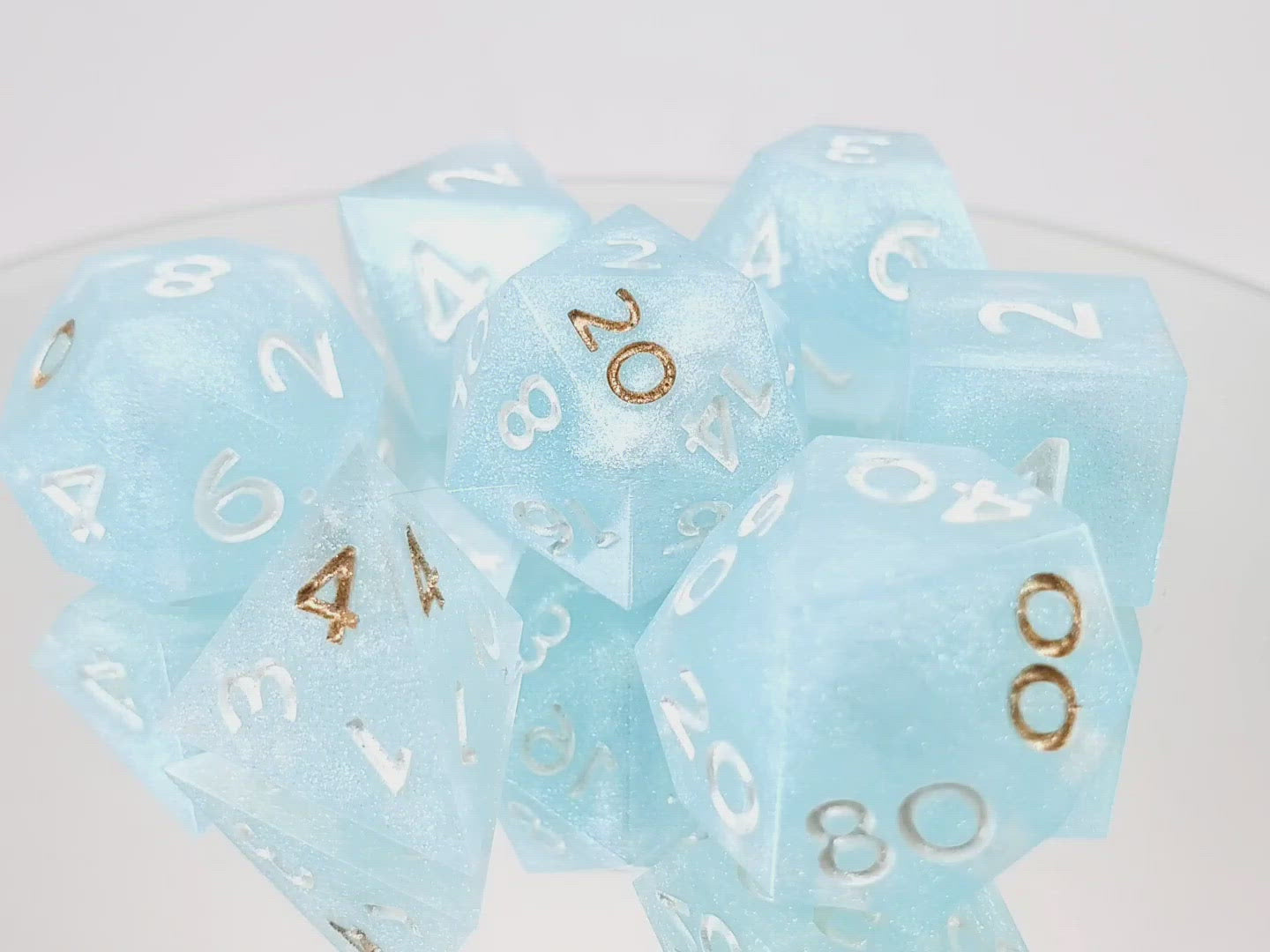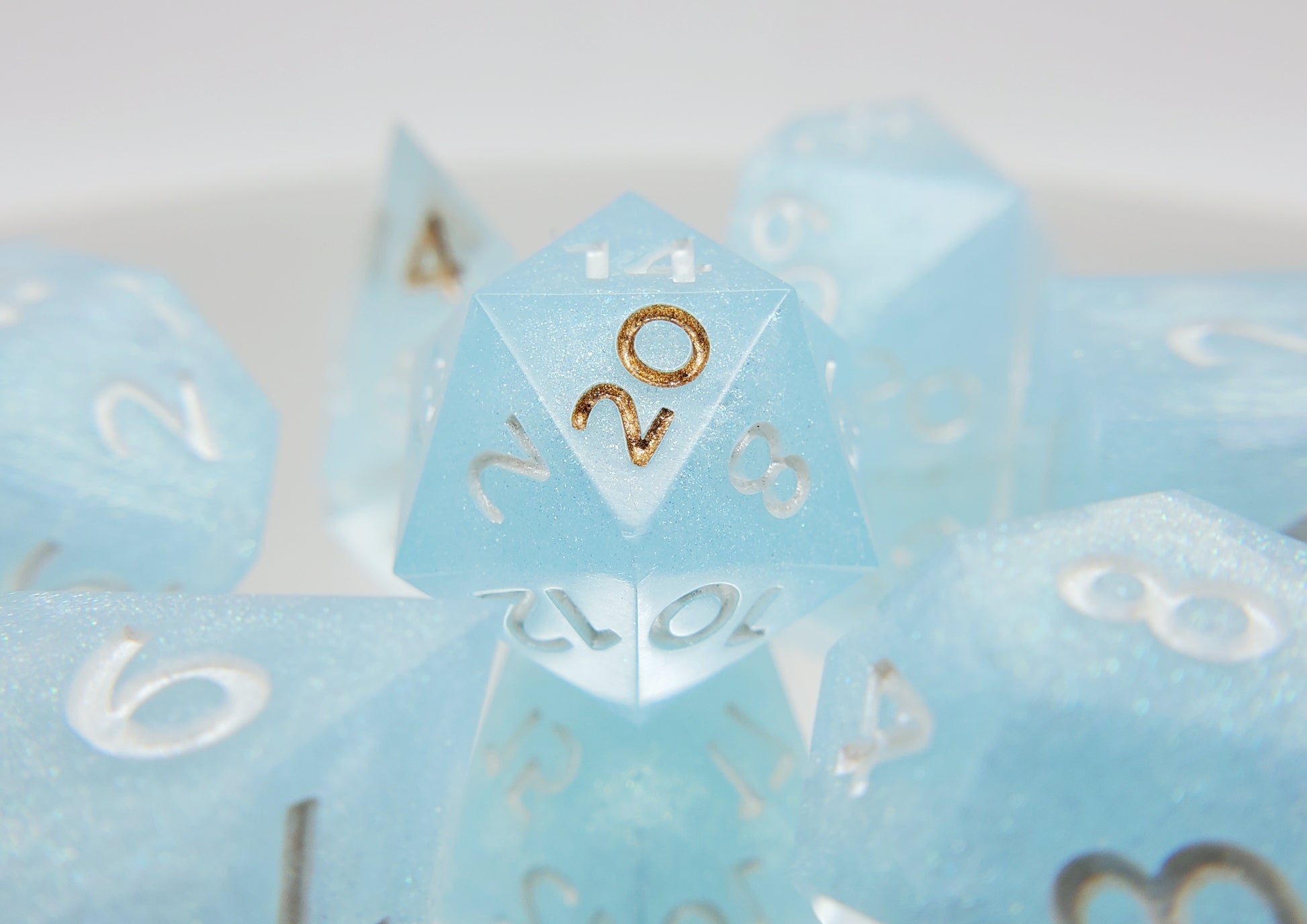 A full standard 7 piece polyhedral set (d20, d12, d%, d10, d8, d6, and d4) of shimmering light blue dice with pearl white and gold numbering.