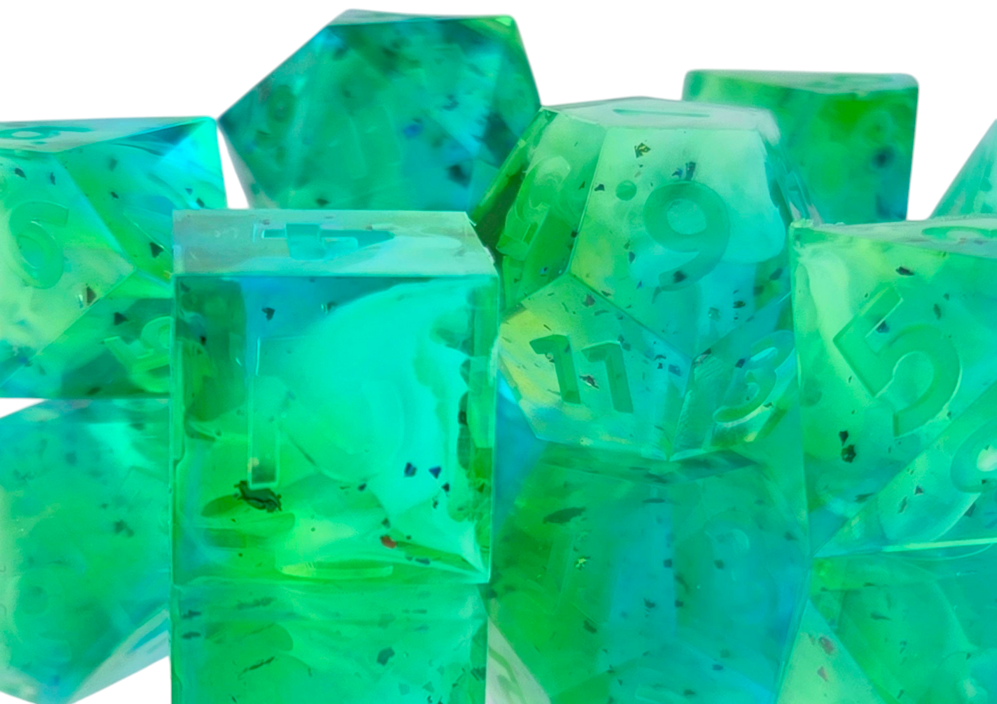 A full standard 7 piece polyhedral set (d20, d12, d%, d10, d8, d6, and d4) of a technique test set. I don't have a more elegant explanation, they just didn't do what I wanted. The set is totally fine and usable! I just simply don't have time to spend on finishing sets I'm not excited about.