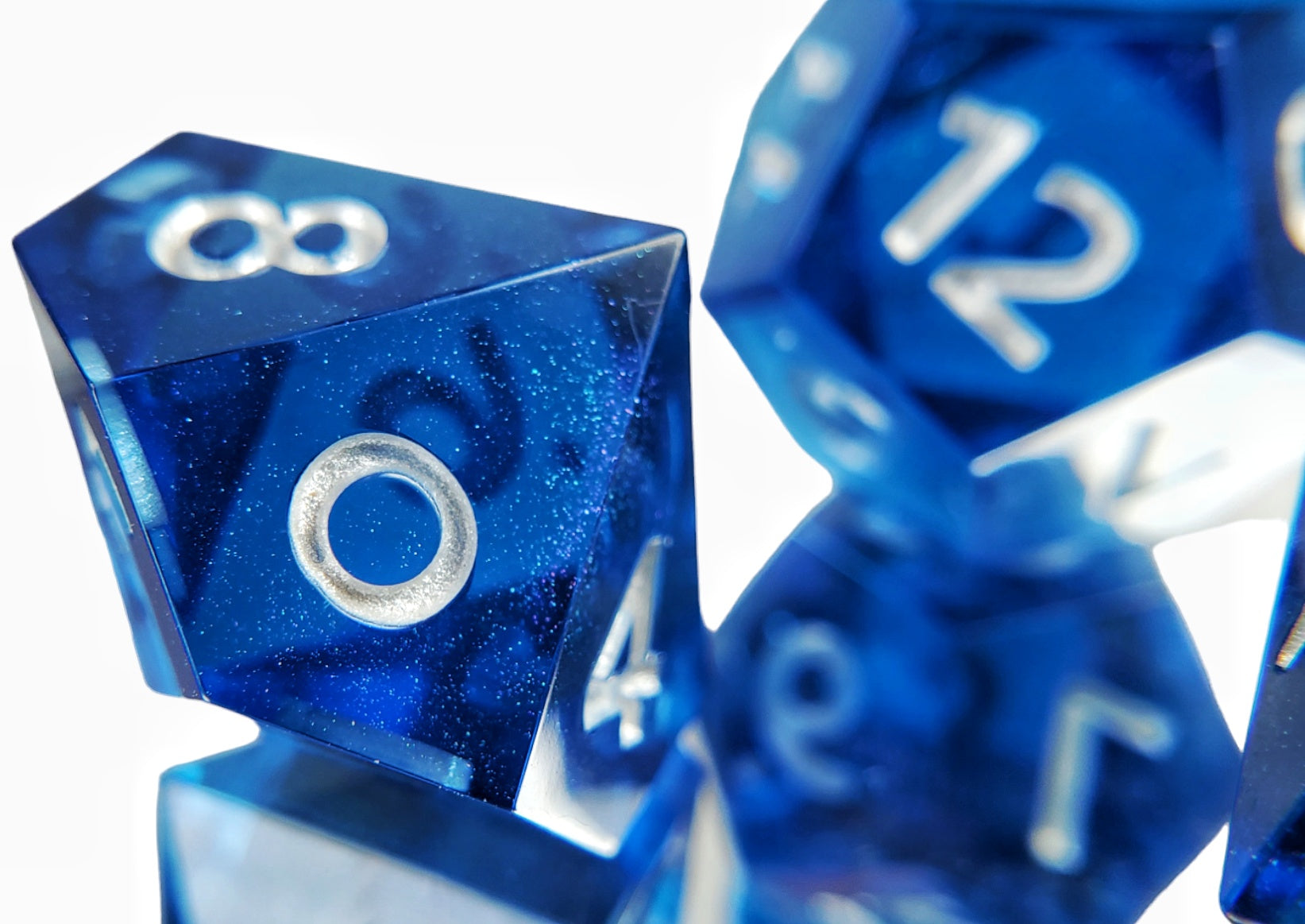 A full standard 7 piece polyhedral set (d20, d12, d%, d10, d8, d6, and d4) of dark blue resin with subtle teal/purple colorshift shimmer and silver numbers.