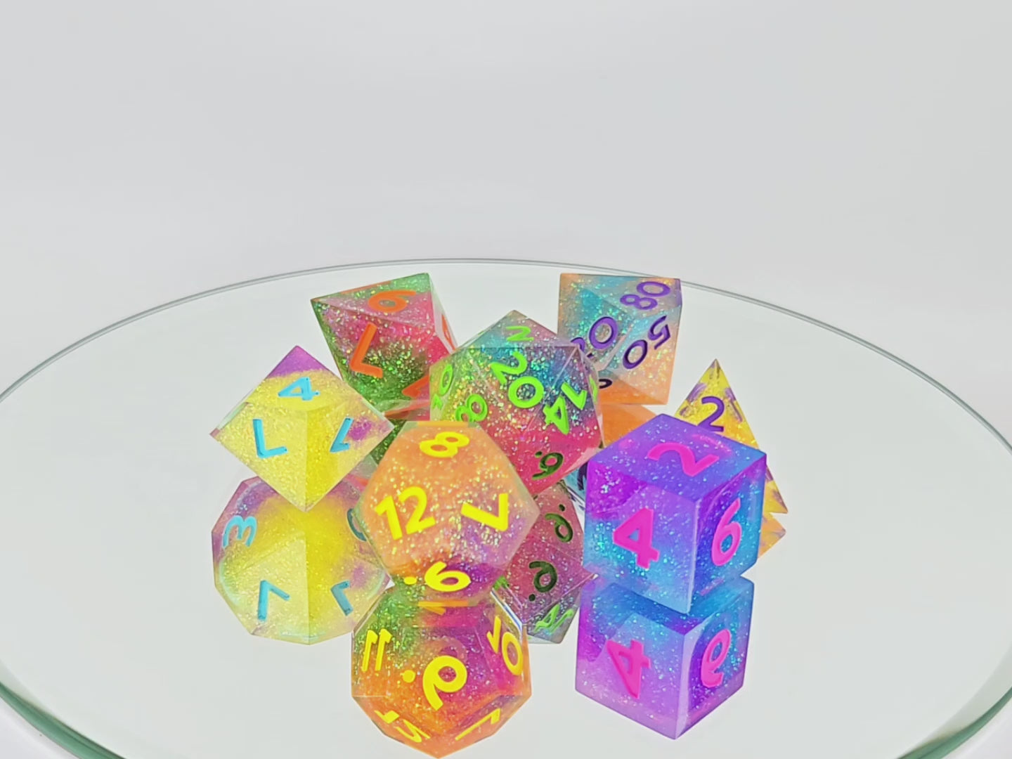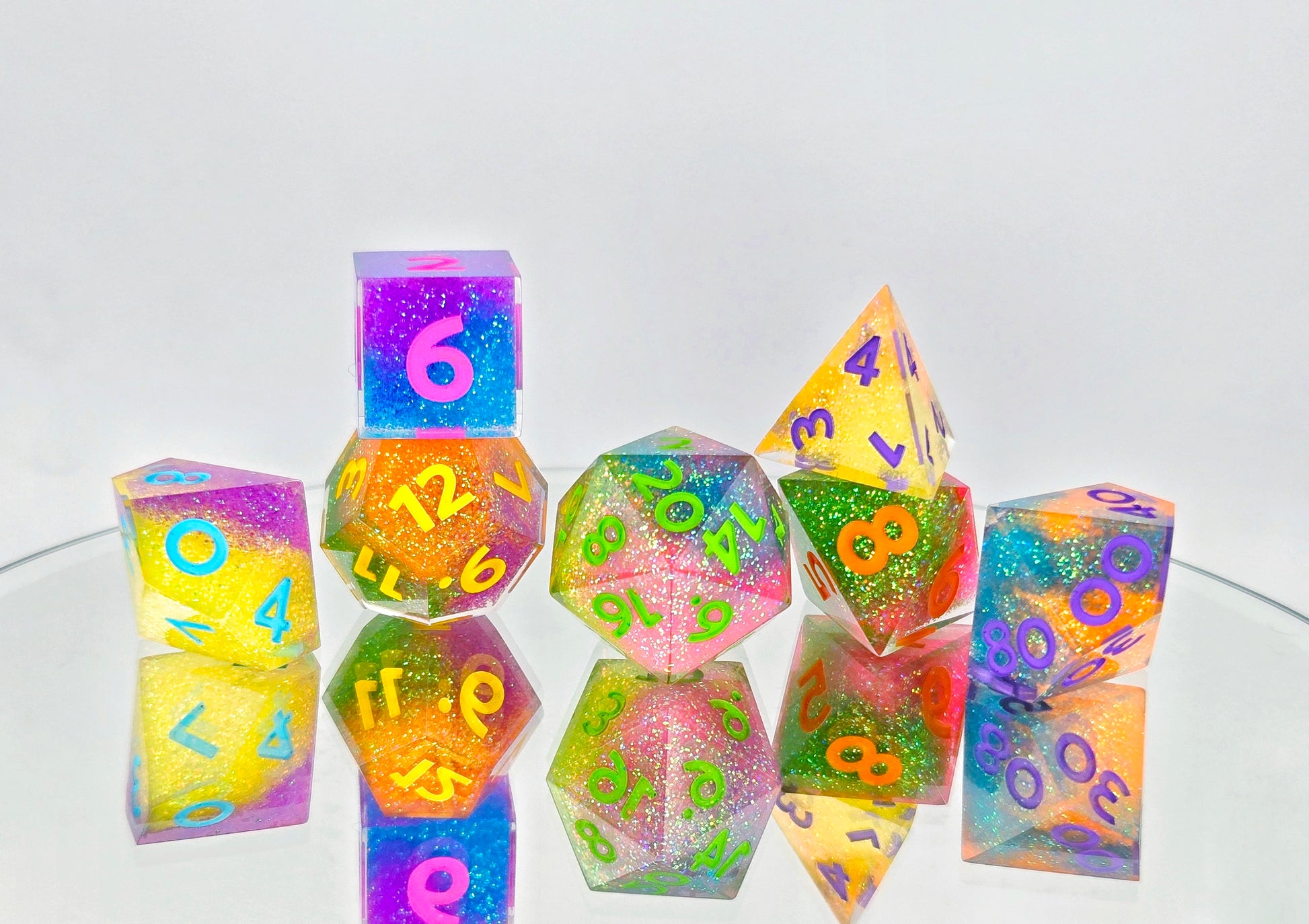 A full standard 7 piece polyhedral set (d20, d12, d%, d10, d8, d6, and d4) of neon glitter dice with bright numbering. Every set is unique and no color combination is the same.