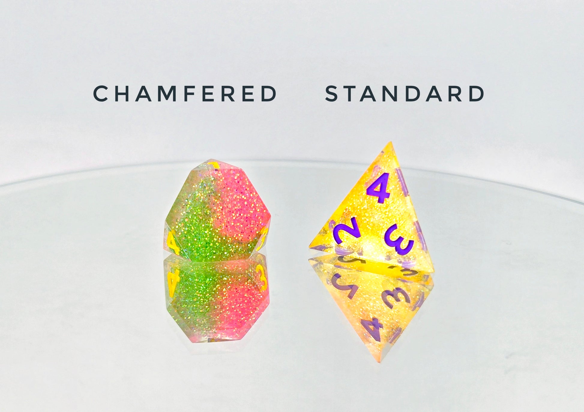 This set has a choice of d4 shape as shown in the photo. Leave a note at checkout (or email after placing the order!) which shape you would prefer. You will receive the standard caltrop by default if no choice is specified.