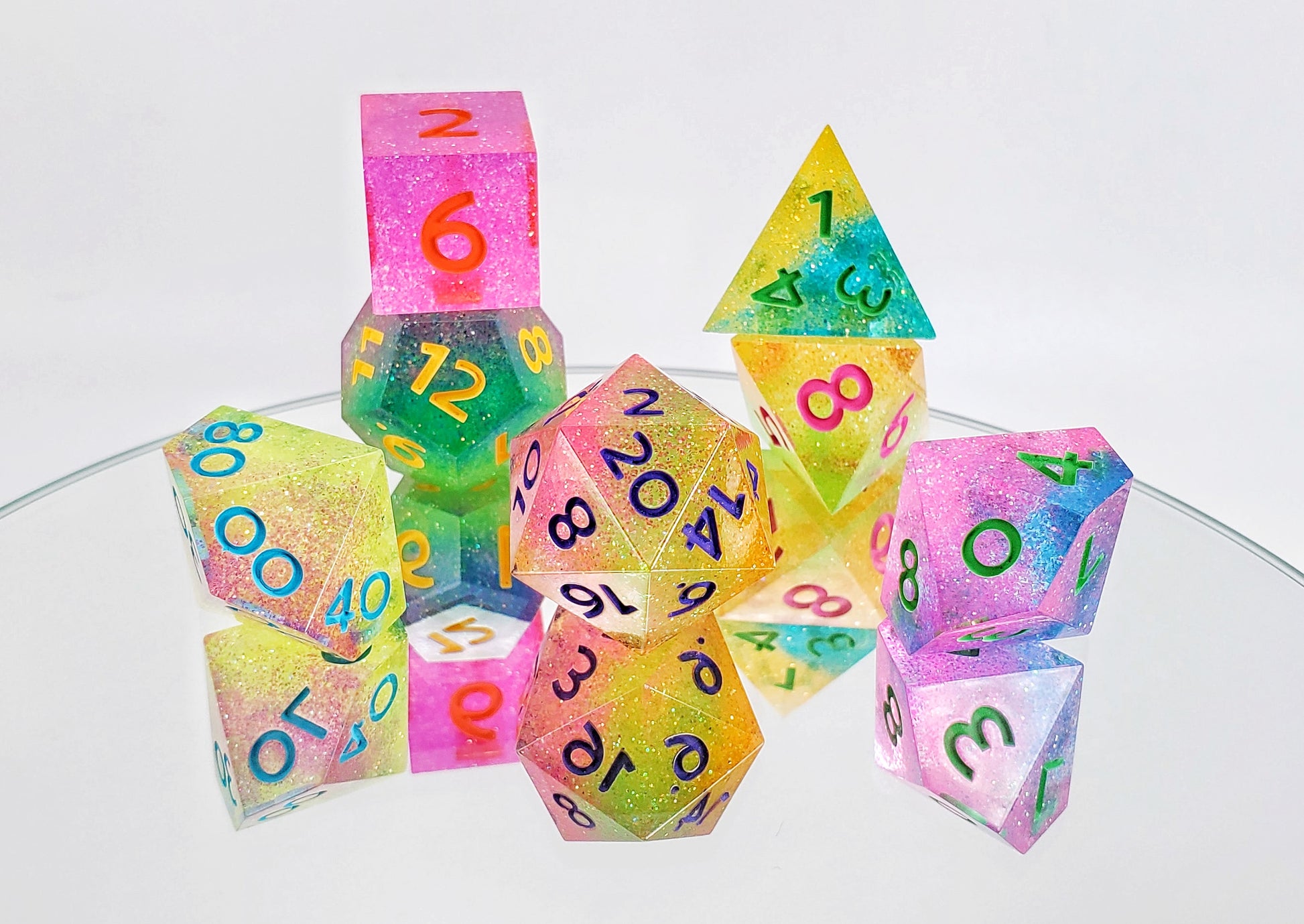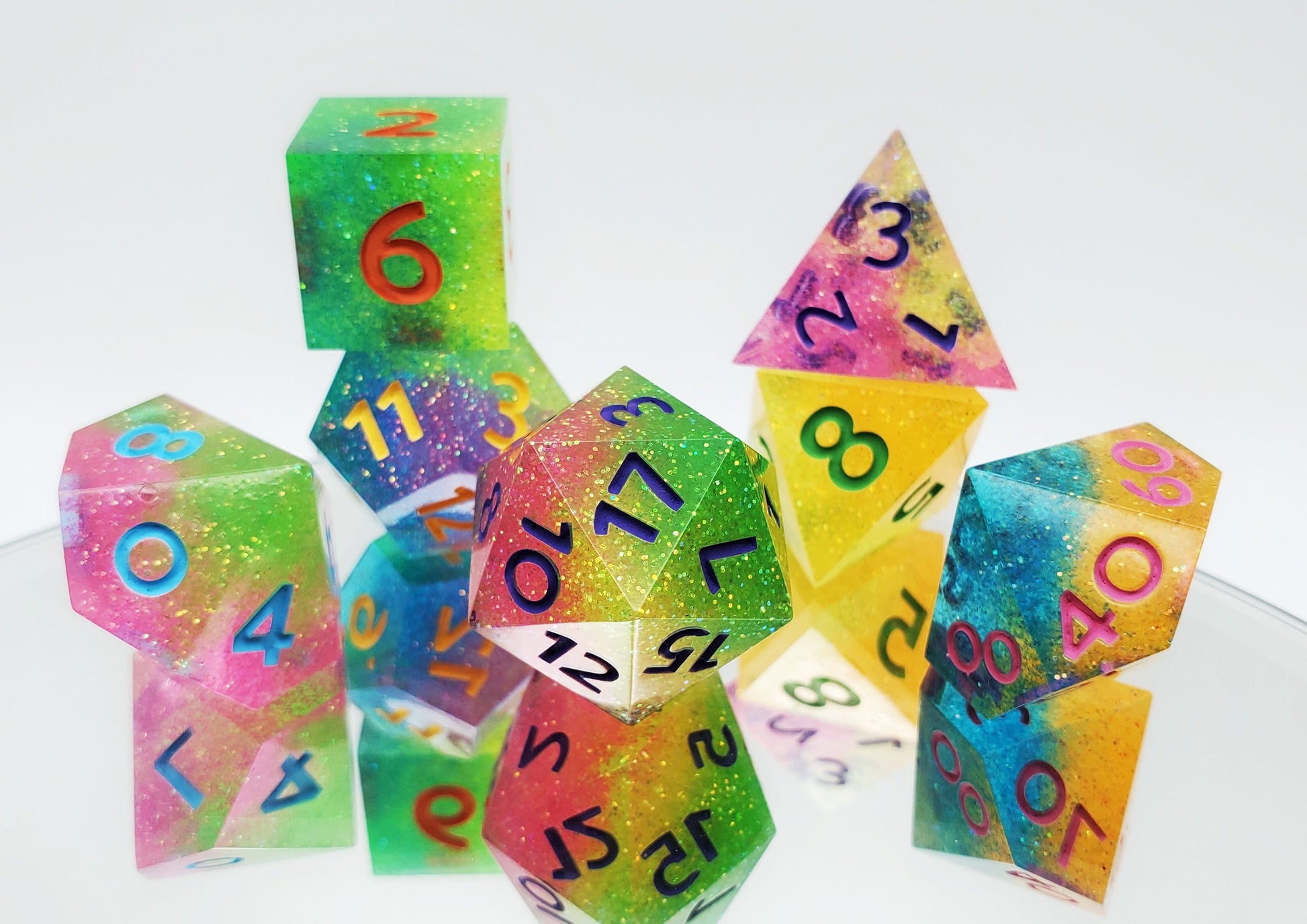 Note: every set is made with equal amounts of each color, but due to the nature of the set the exact look and combination of colors within each die is random. Photos are representative of past versions to demonstrate the variability possible. We are unable to honor specific requests for how colors mix. If you would like something more specific, please consider utilizing our commission request form to discuss options.