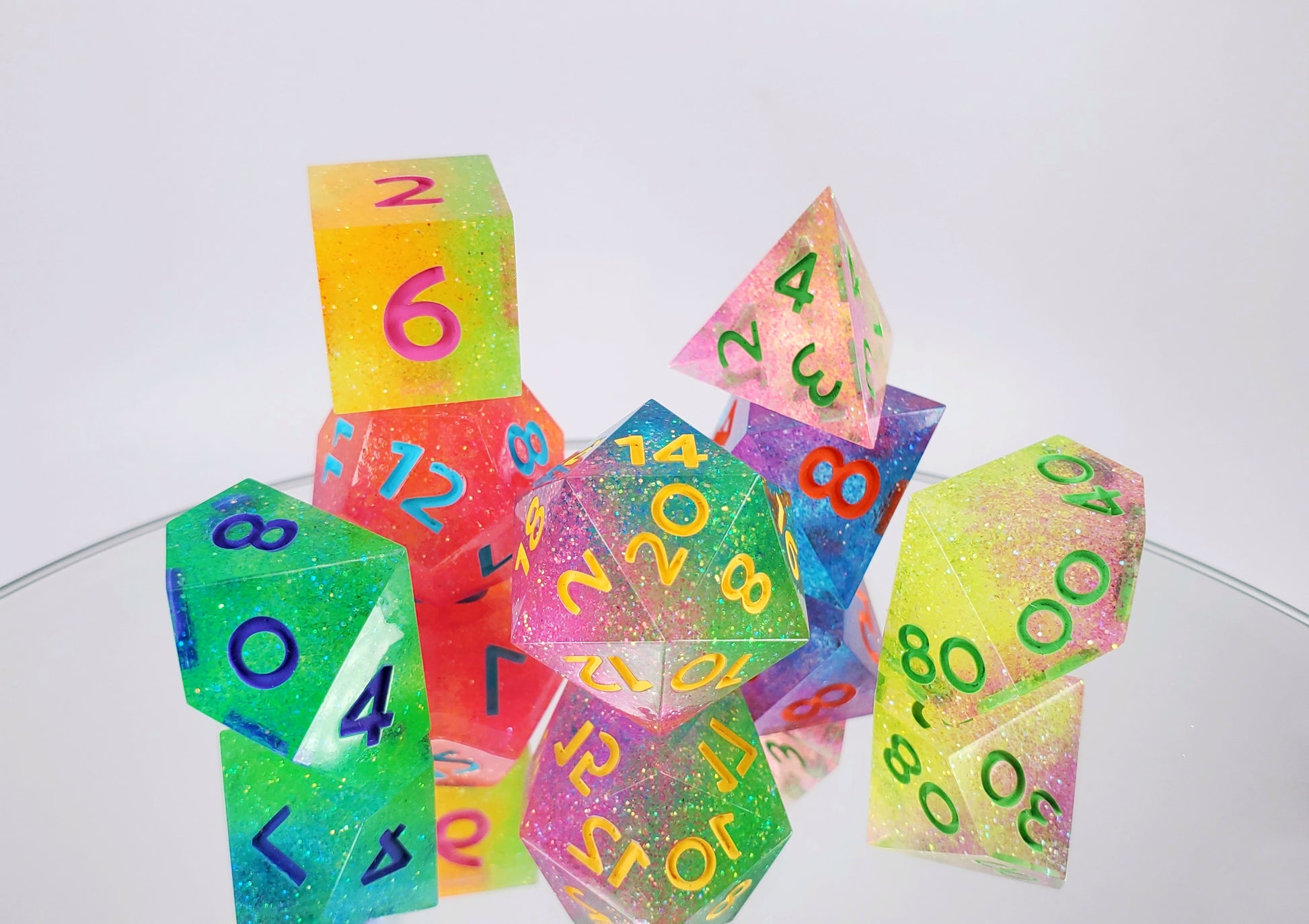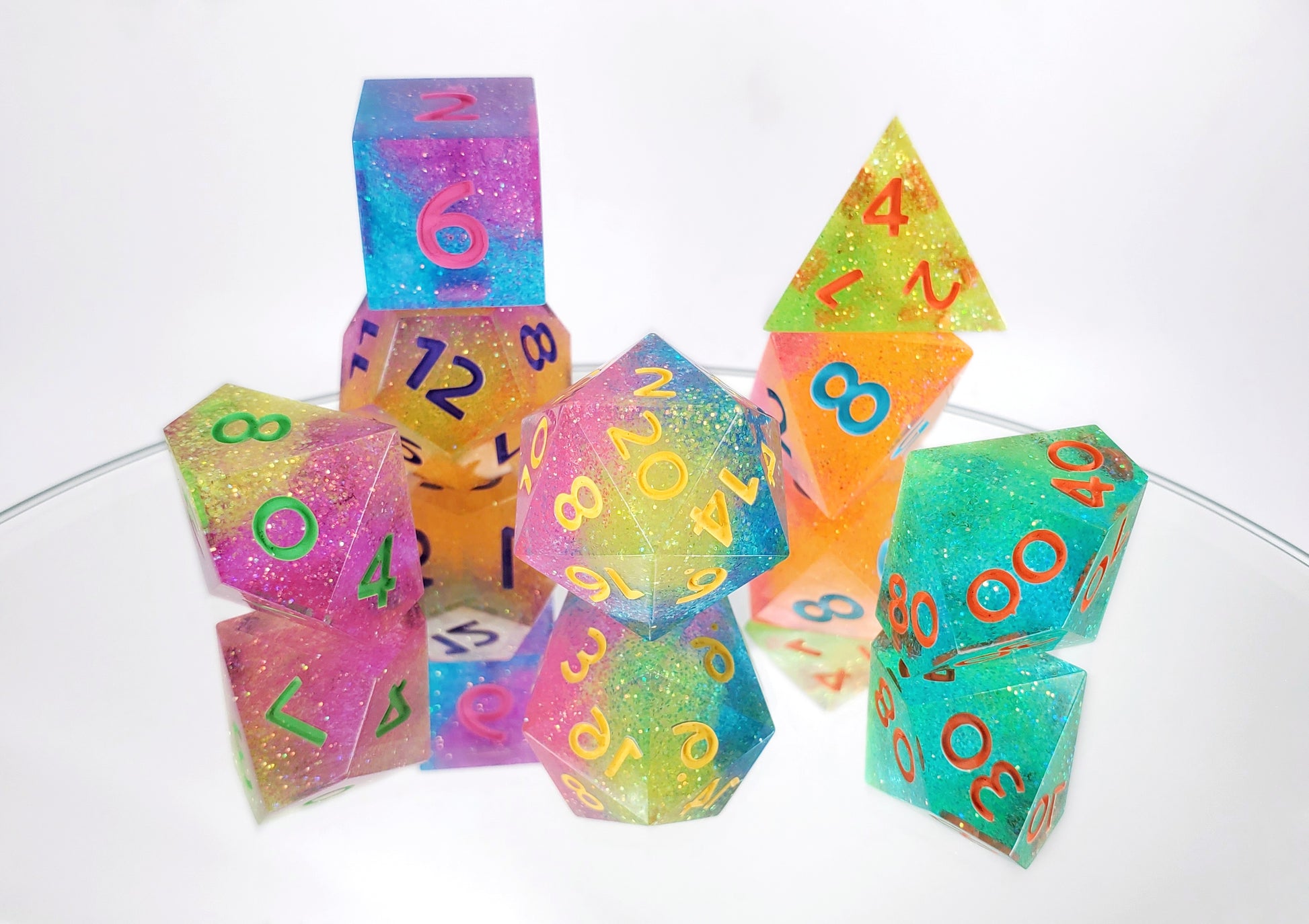 Your choice of 6d6, 5d10, or full standard 7 piece polyhedral set (d20, d12, d%, d10, d8, d6, and d4) of neon glitter dice with bright numbering. Every set is unique and no color combination is the same. Select your preferred set type to see more options to customize it!