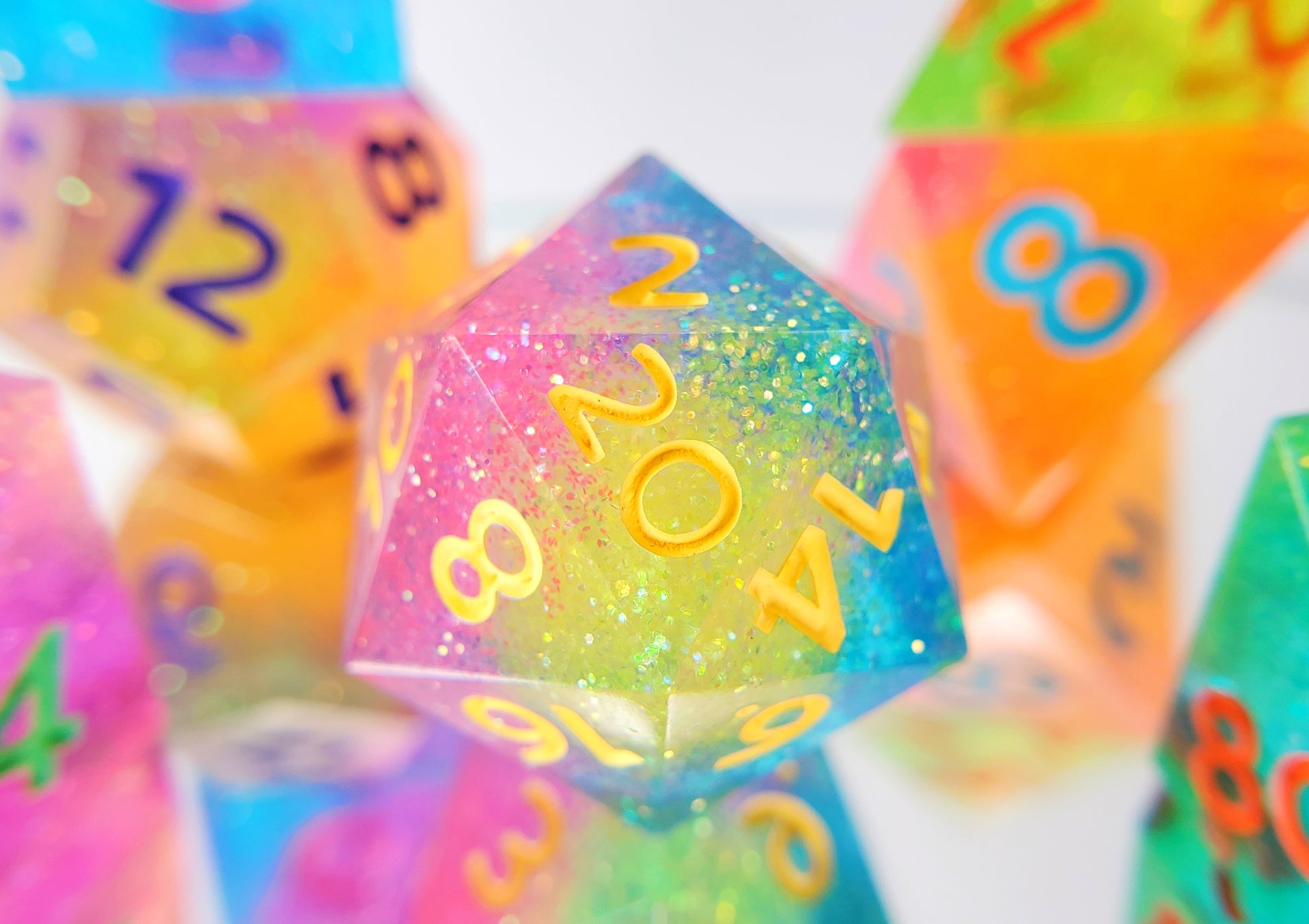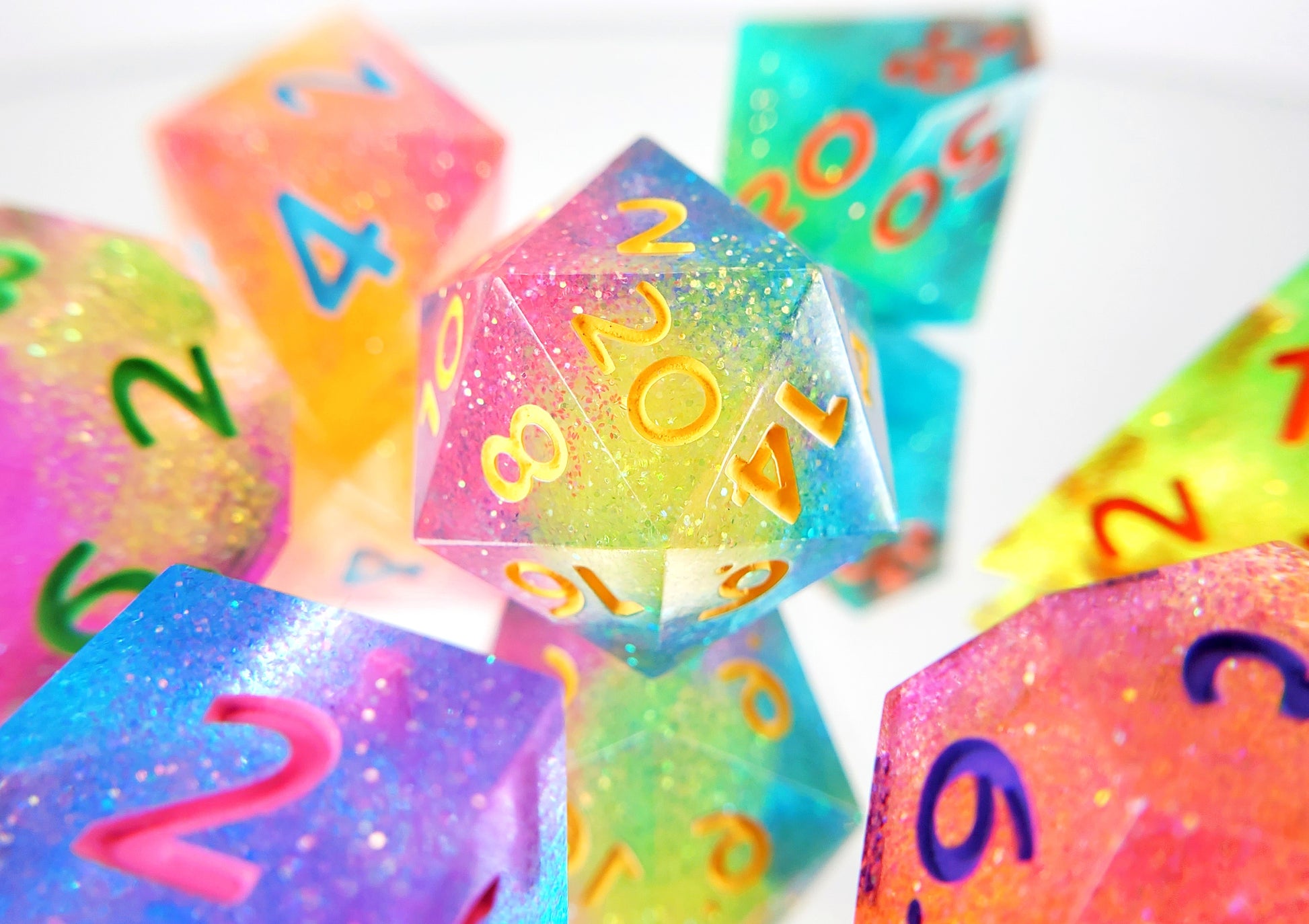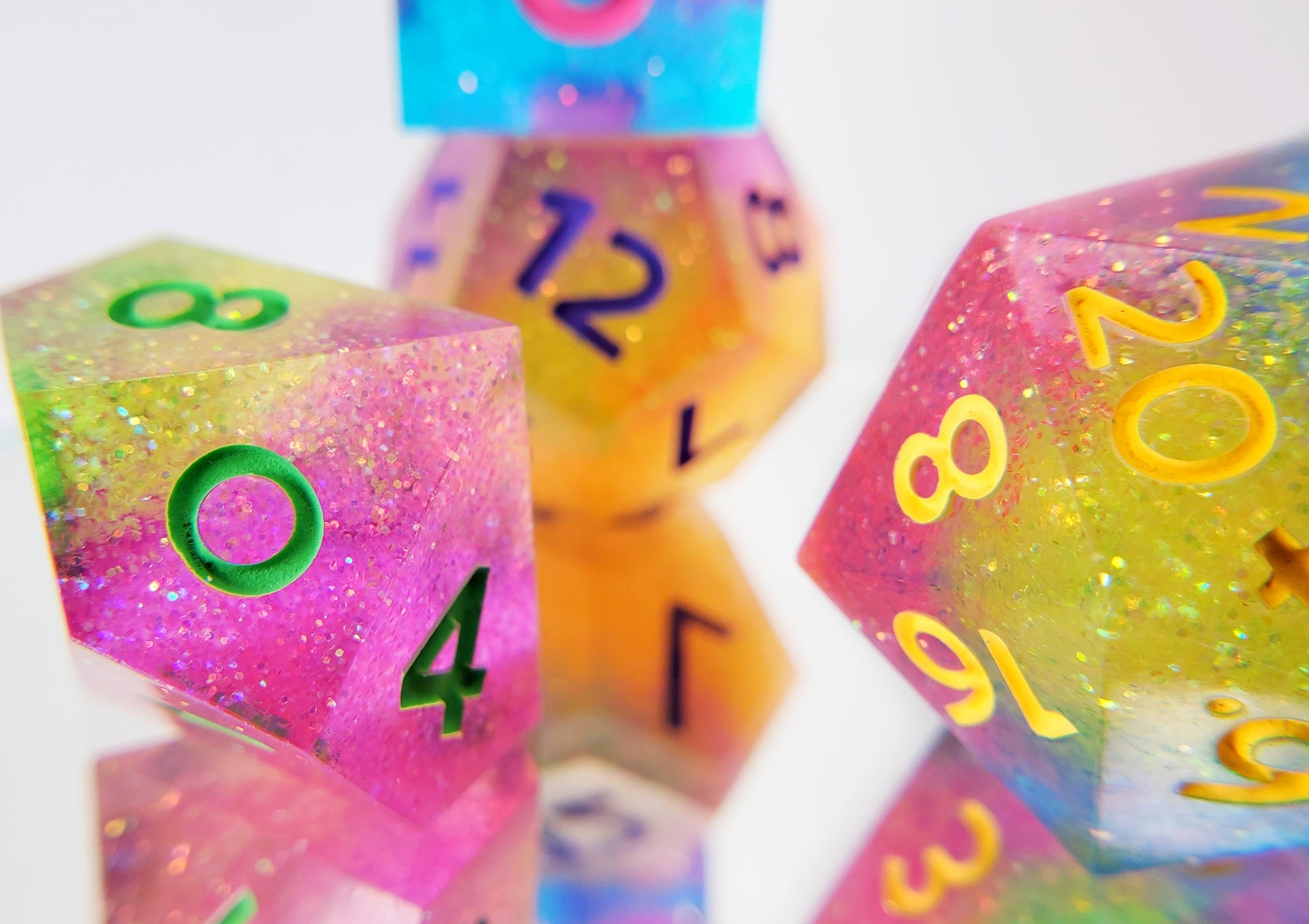 A full standard 7 piece polyhedral set (d20, d12, d%, d10, d8, d6, and d4) of neon glitter dice with bright numbering. Every set is unique and no color combination is the same.
