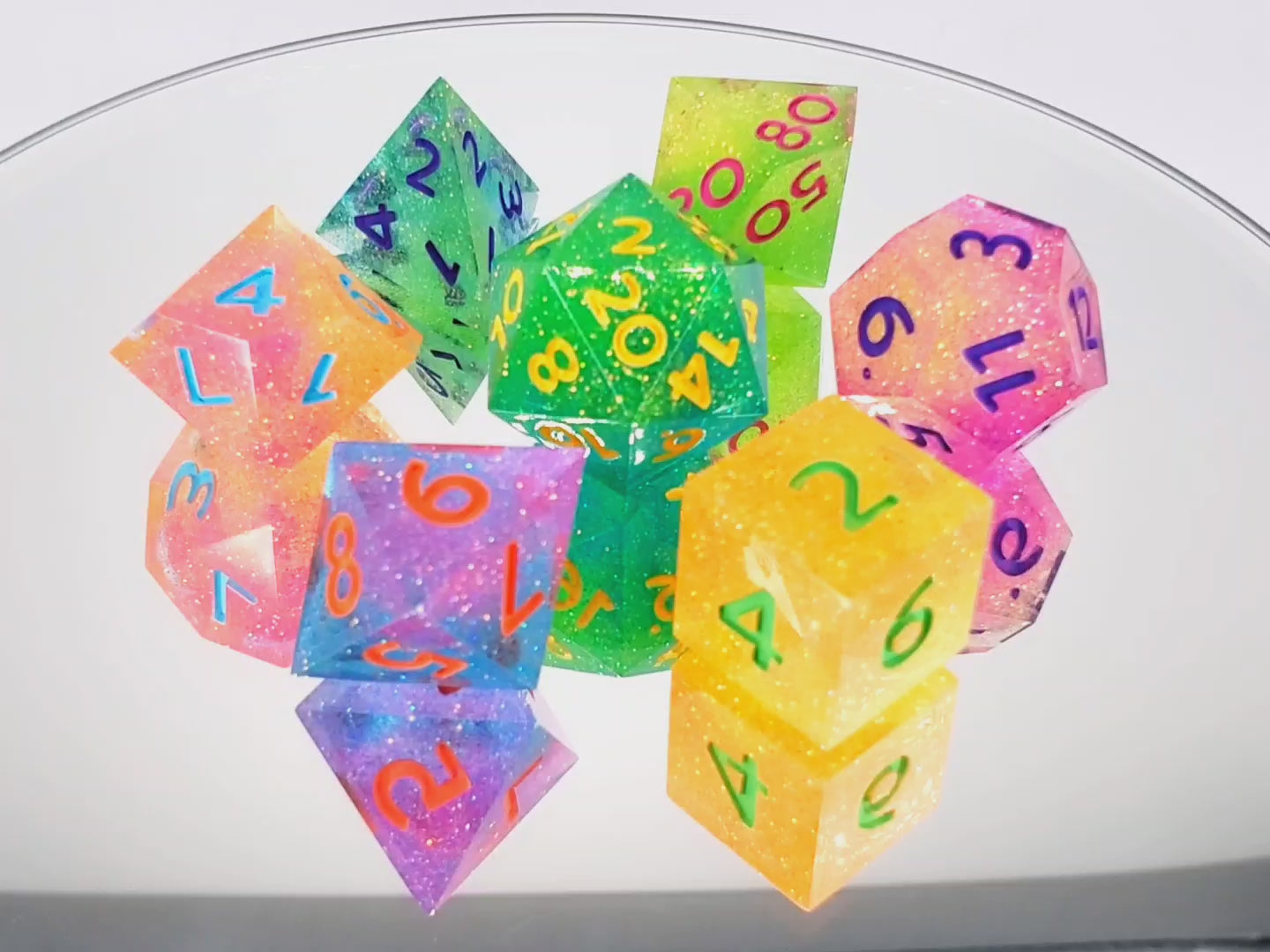A full standard 7 piece polyhedral set (d20, d12, d%, d10, d8, d6, and d4) of neon glitter dice with bright numbering. Every set is unique and no color combination is the same.