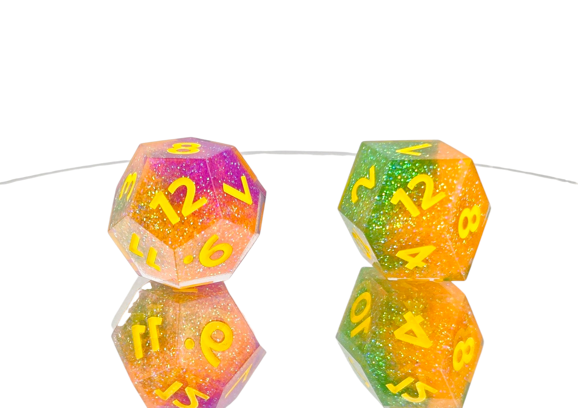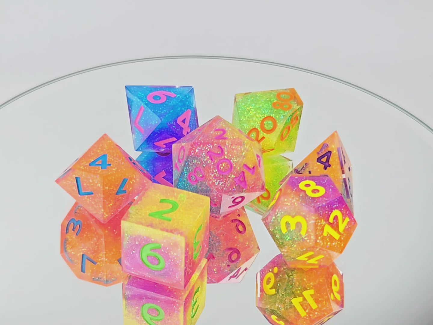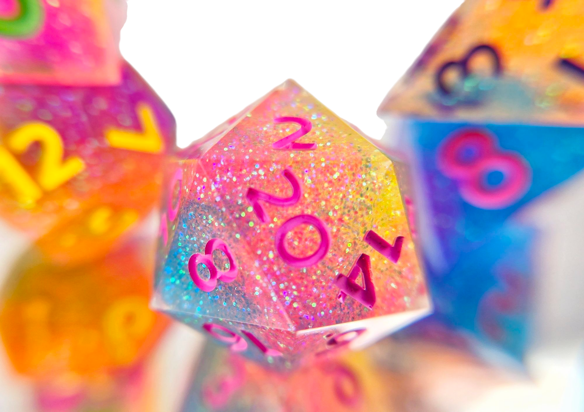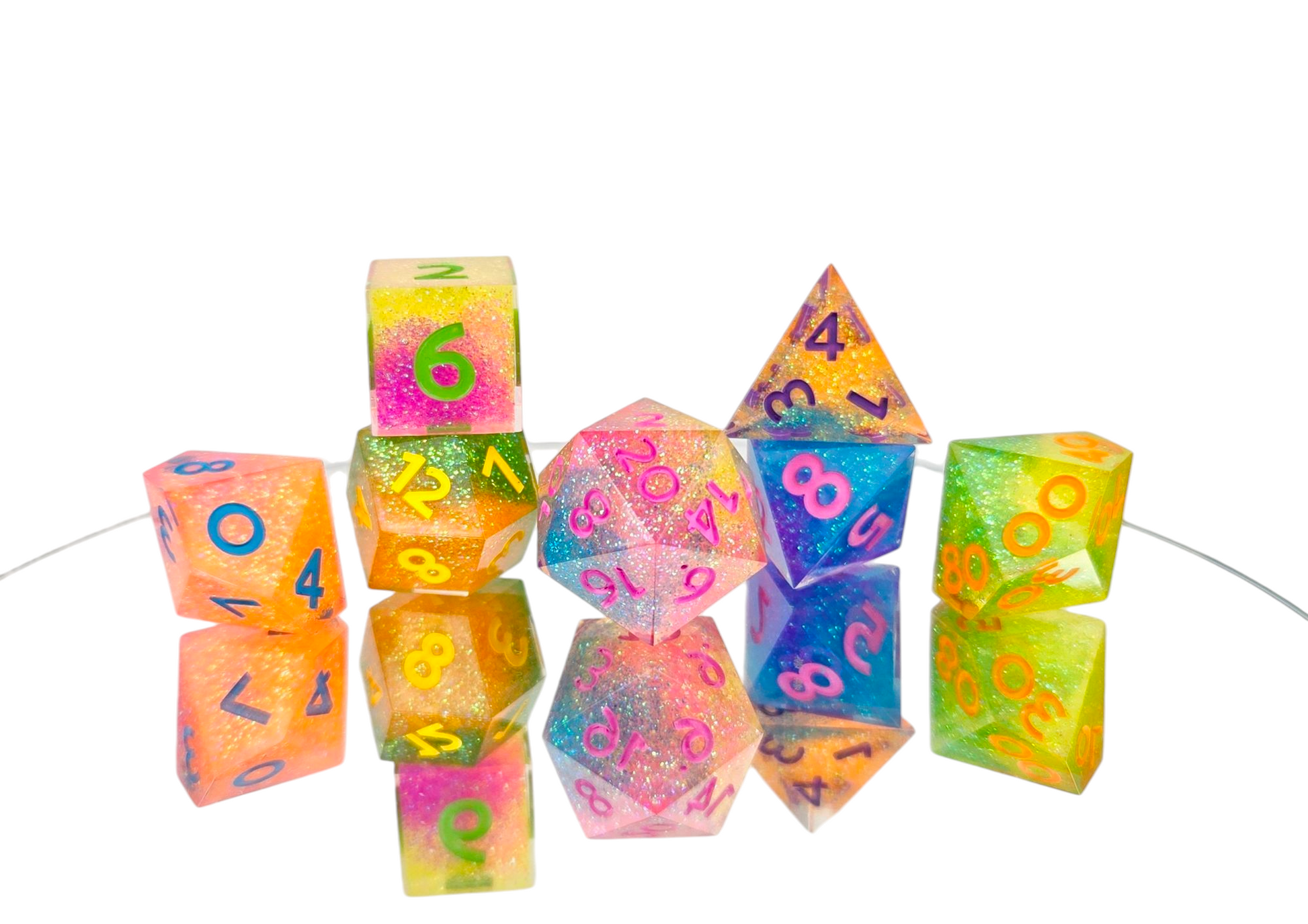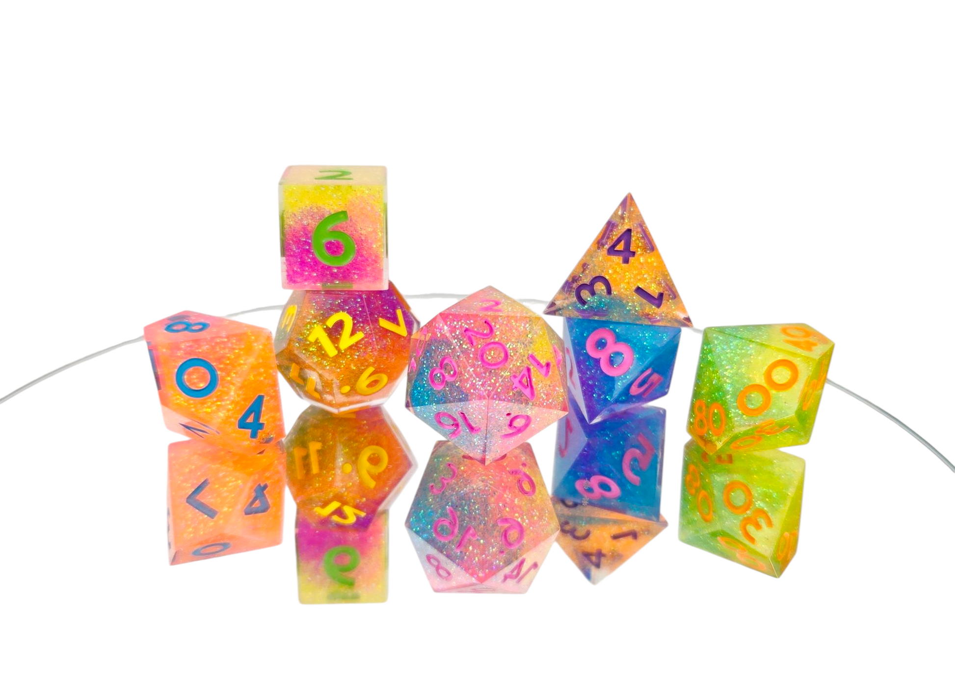 A full standard 7 piece polyhedral set (d20, d12, d%, d10, d8, d6, and d4) of neon glitter dice with bright numbering. Every set is unique and no color combination is the same.