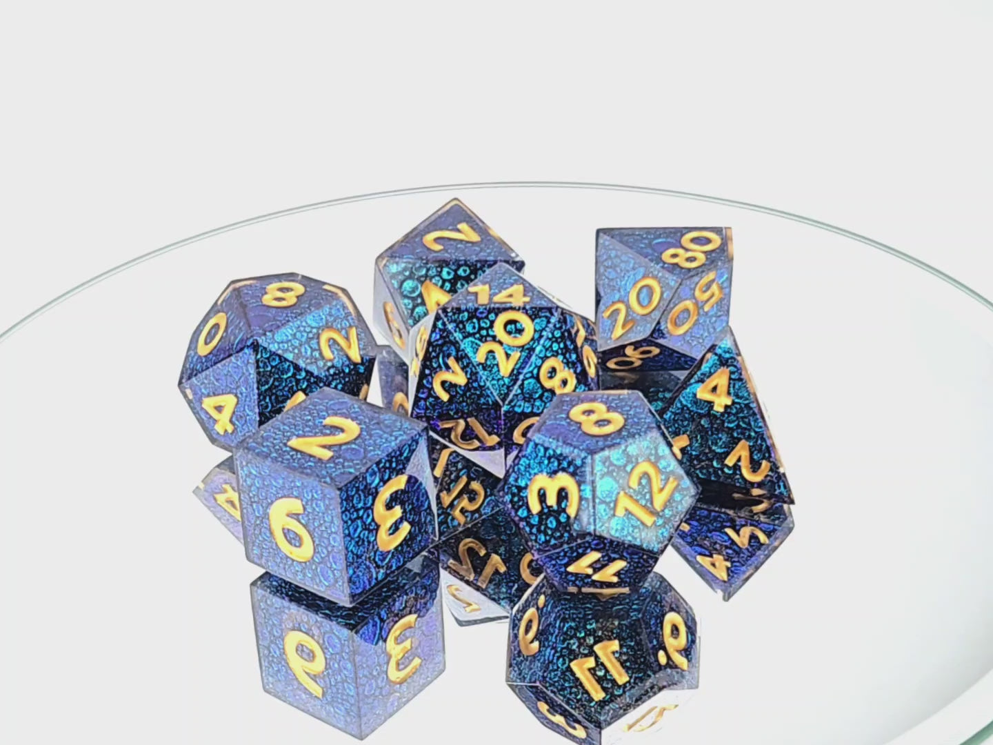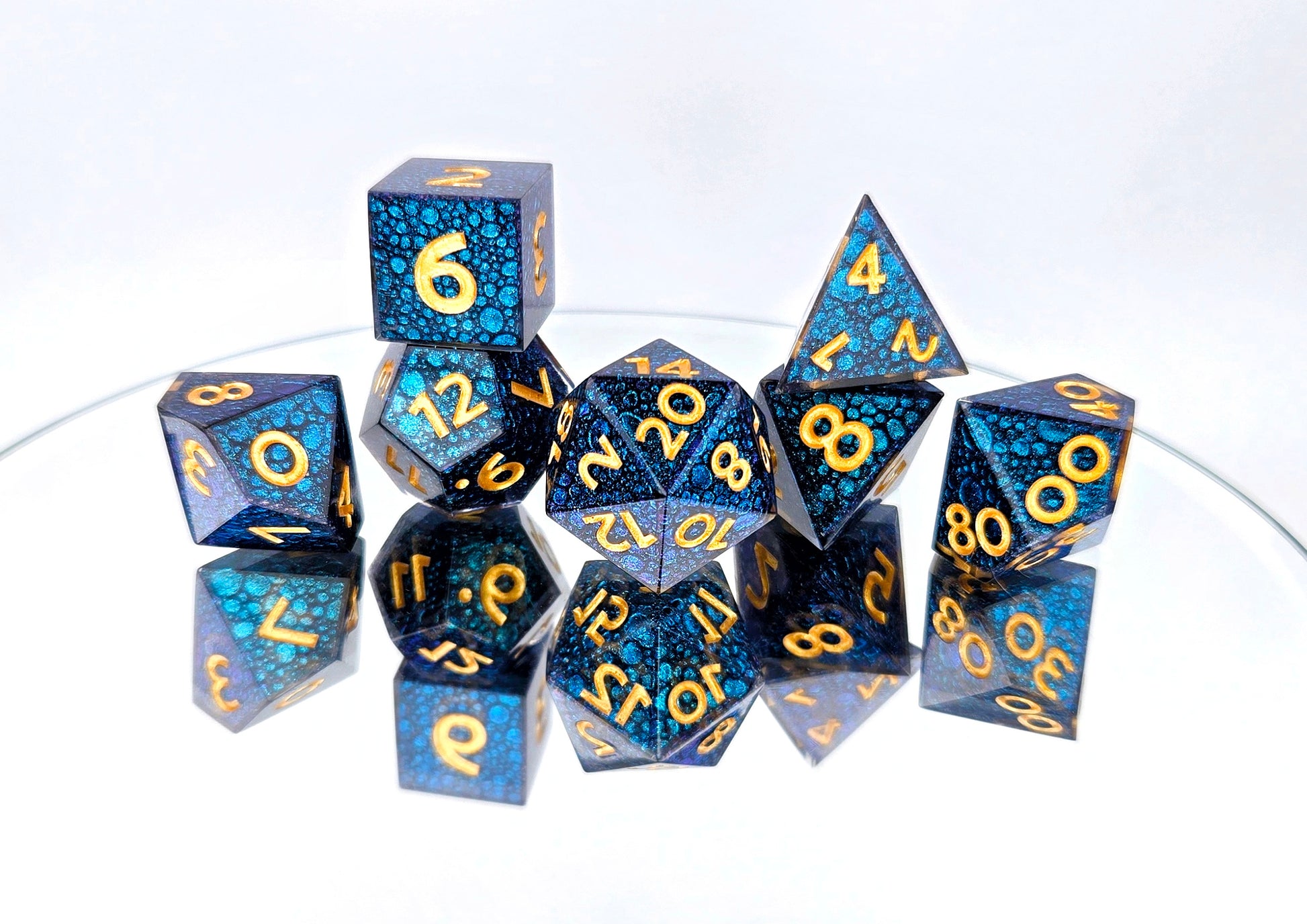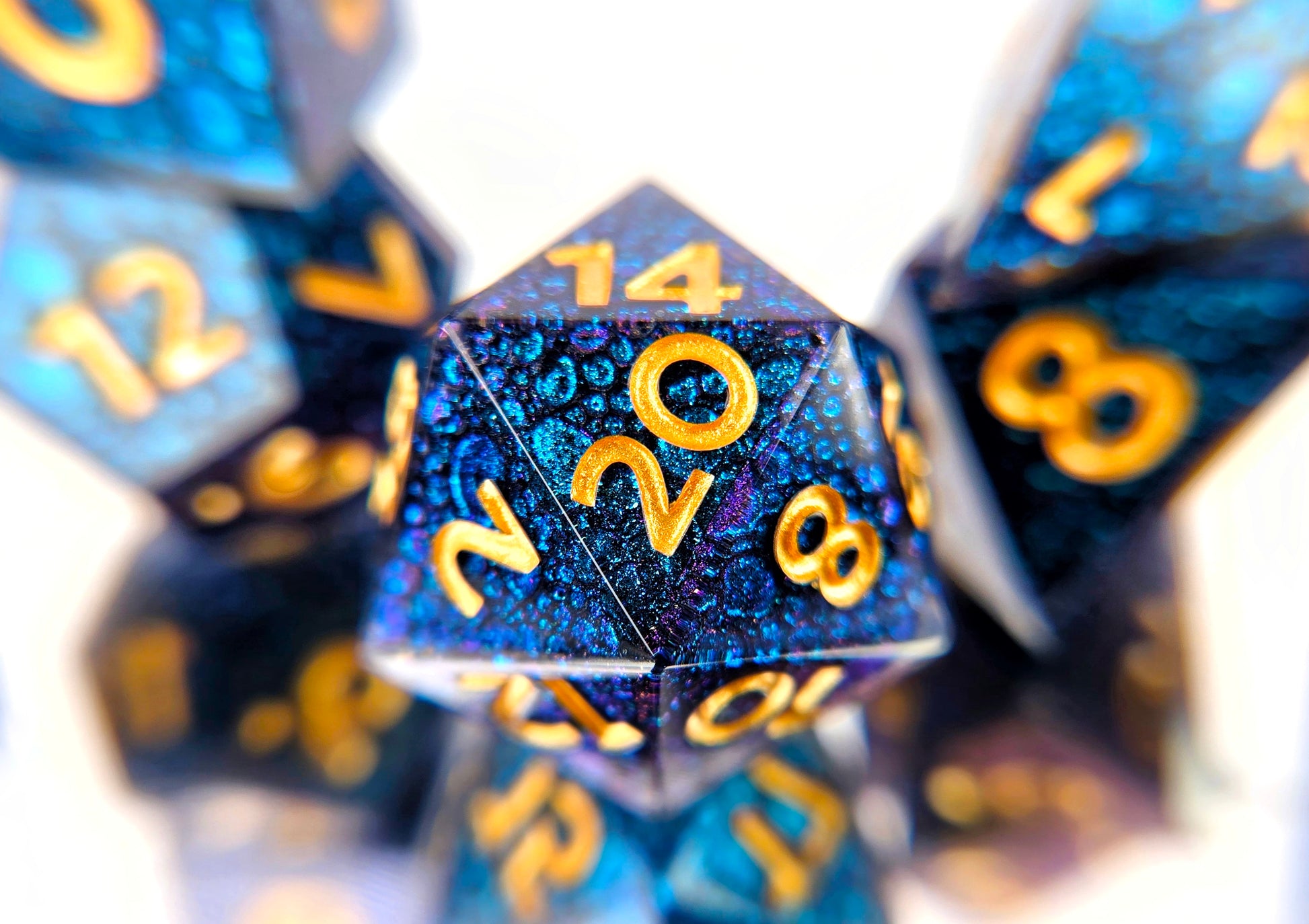 A full standard 7 piece polyhedral resin dice set (d20, d12, d%, d10, d8, d6, and d4) with a blue dragonskin style effect with a slight colorshift quality and gold numbering. The effect is a visual texture only and is fully encased in smooth resin.
