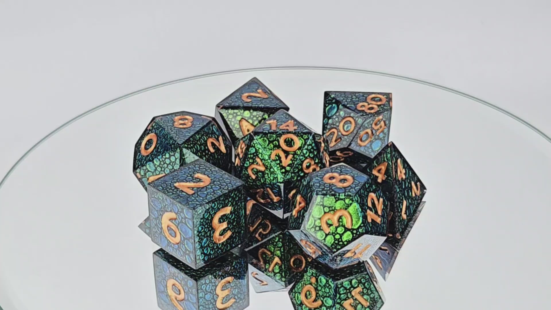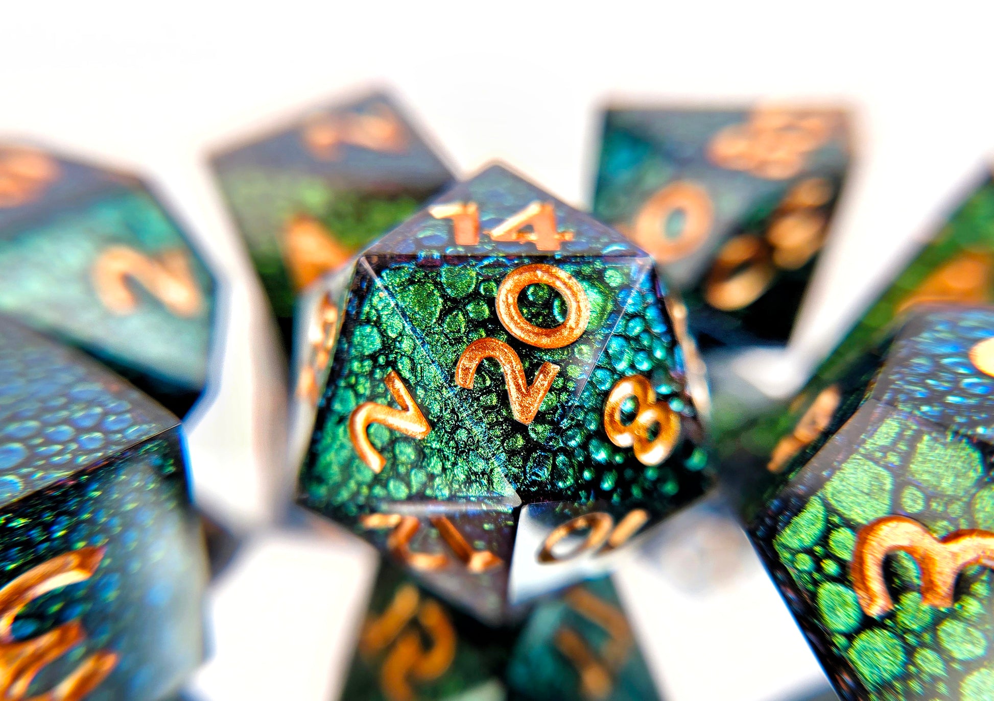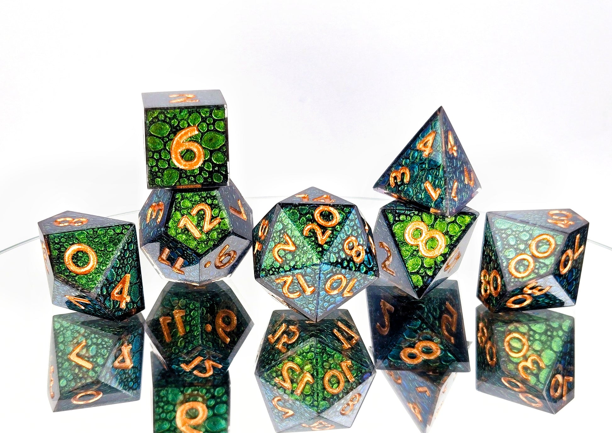 A full standard 7 piece polyhedral resin dice set (d20, d12, d%, d10, d8, d6, and d4) with a green dragonskin style effect with a slight colorshift quality and copper numbering. The effect is a visual texture only and is fully encased in smooth resin.