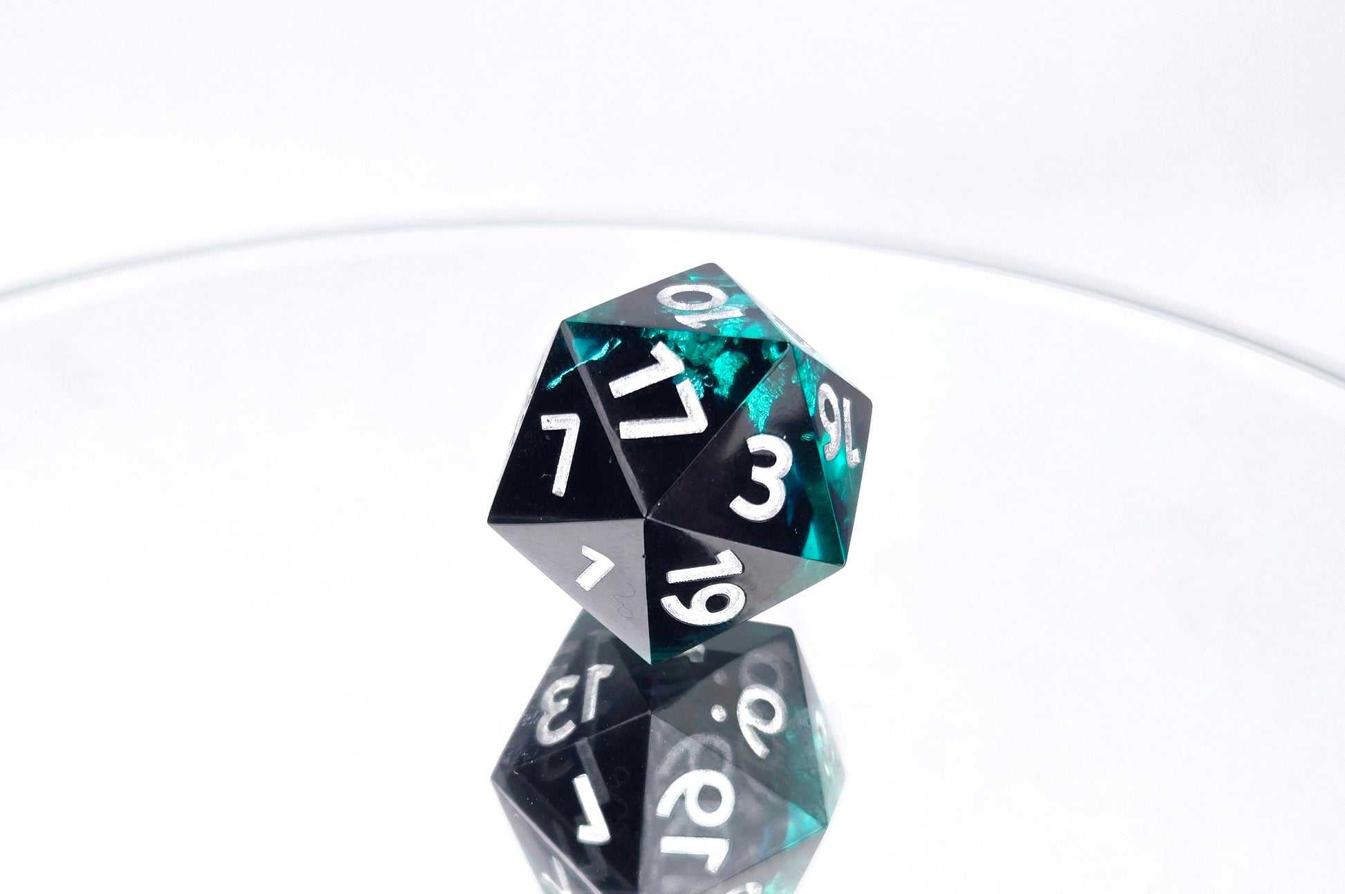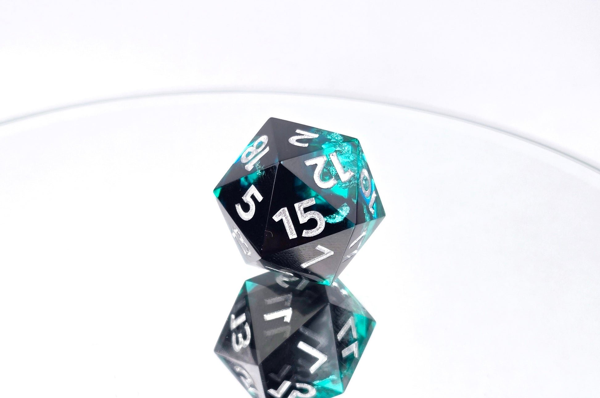 A standard sized d20 of transparent teal resin with black smoke and silver flake throughout and silver numbers.