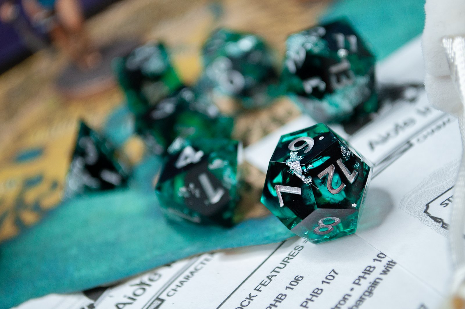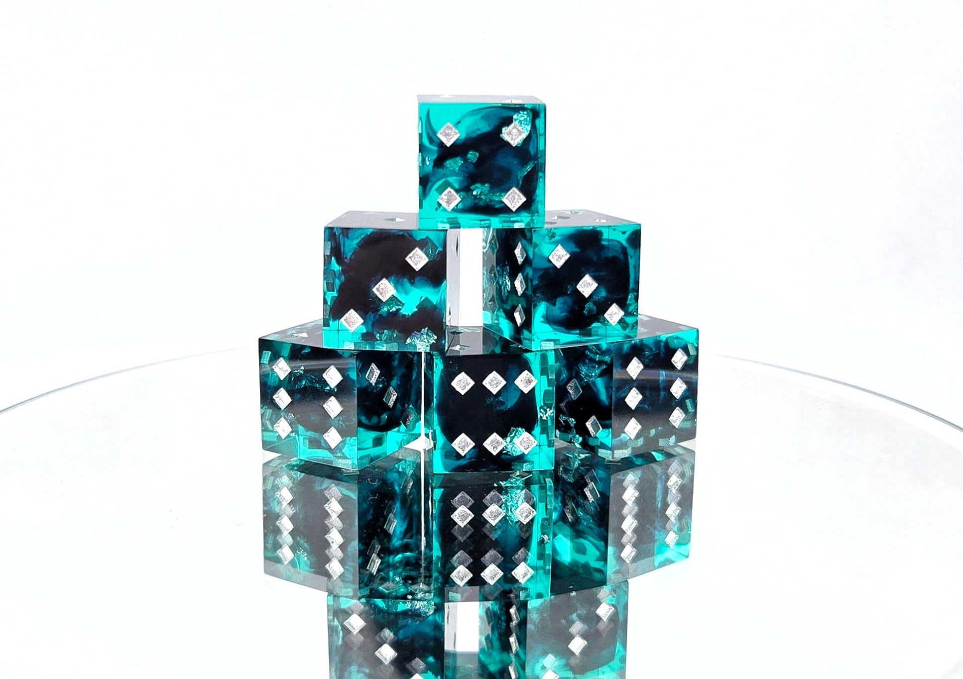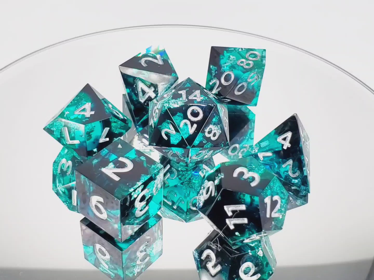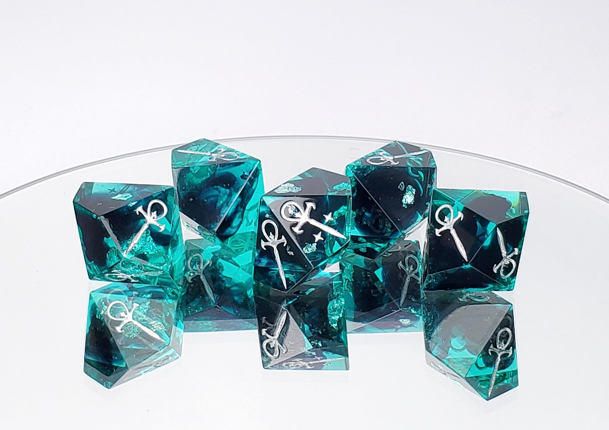 Your choice of a single d20, 6d6, 5d10, or full standard 7 piece polyhedral set (d20, d12, d%, d10, d8, d6, and d4) of transparent teal resin with black smoke and silver flake throughout and silver numbers. Select your preferred set type to see more options to customize it!