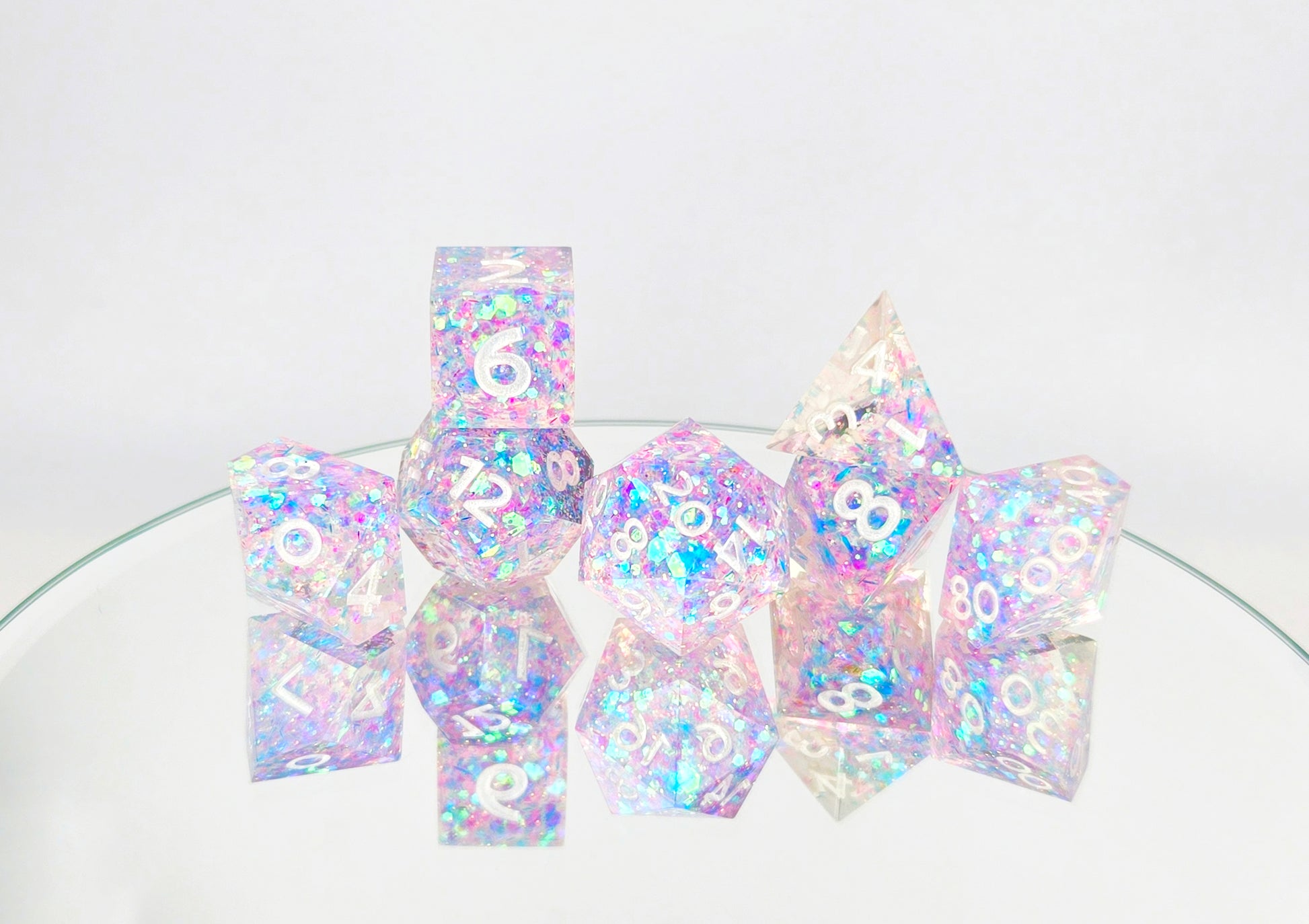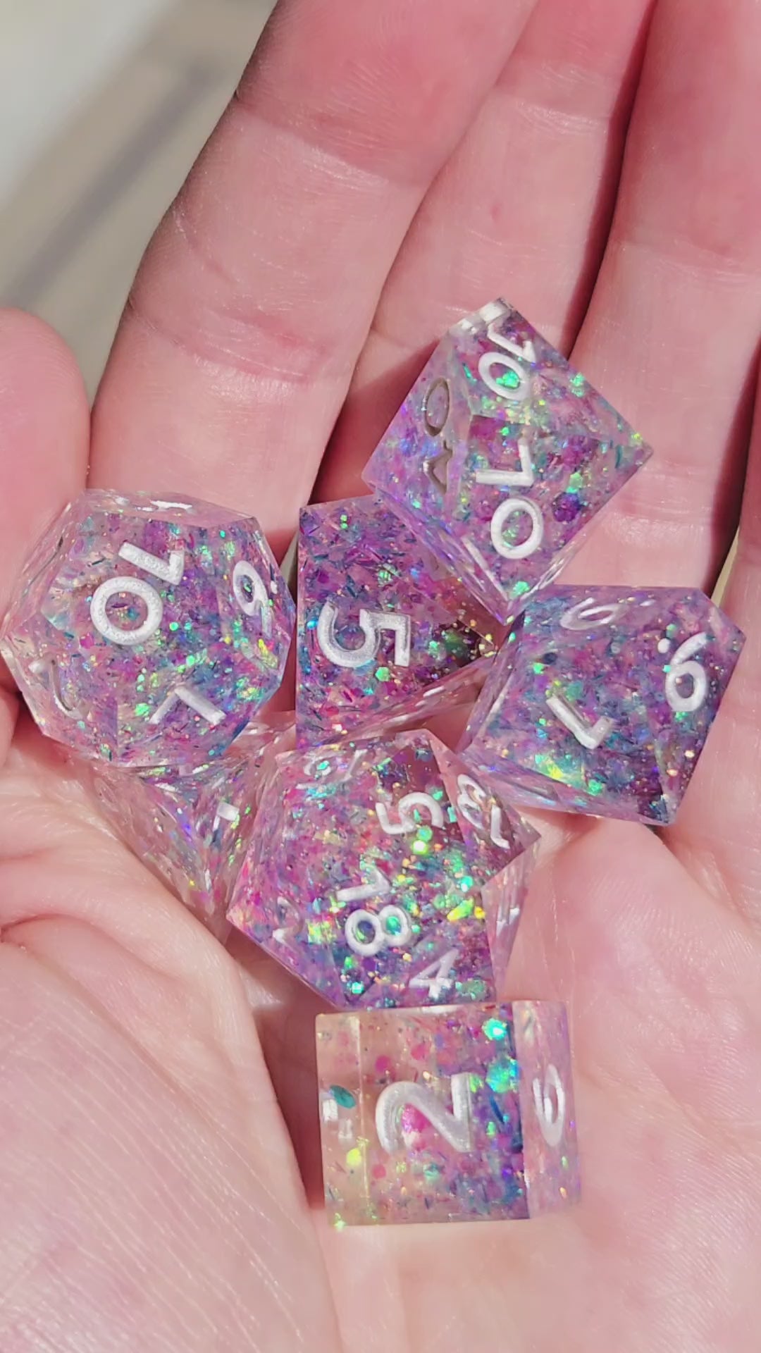 A full standard 7 piece polyhedral set (d20, d12, d%, d10, d8, d6, and d4) with soft pink and purple chunky glitter and pearl white numbers.