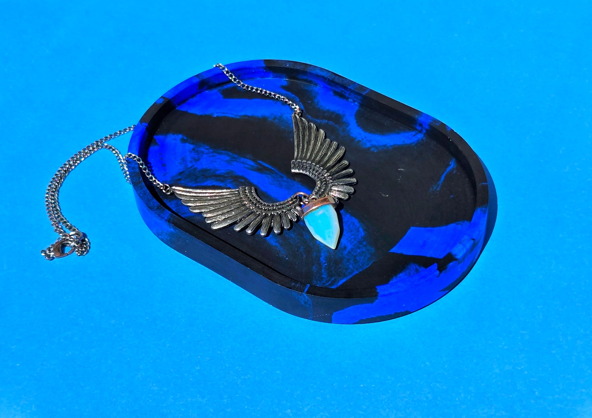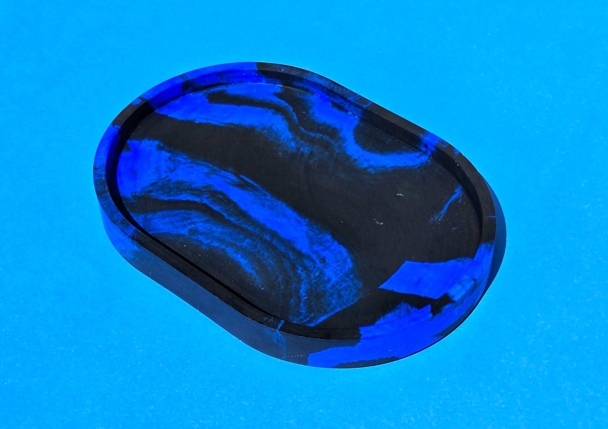 Need a special place for your keys? A pretty spot for your jewelry? This black and blue swirled tray looks like stone while actually being an incredible resin mixture. The tray measures approximately 4 x 6 inches and comes with clear rubber bumper feet to protect the surface you place it on and keep it from sliding around.