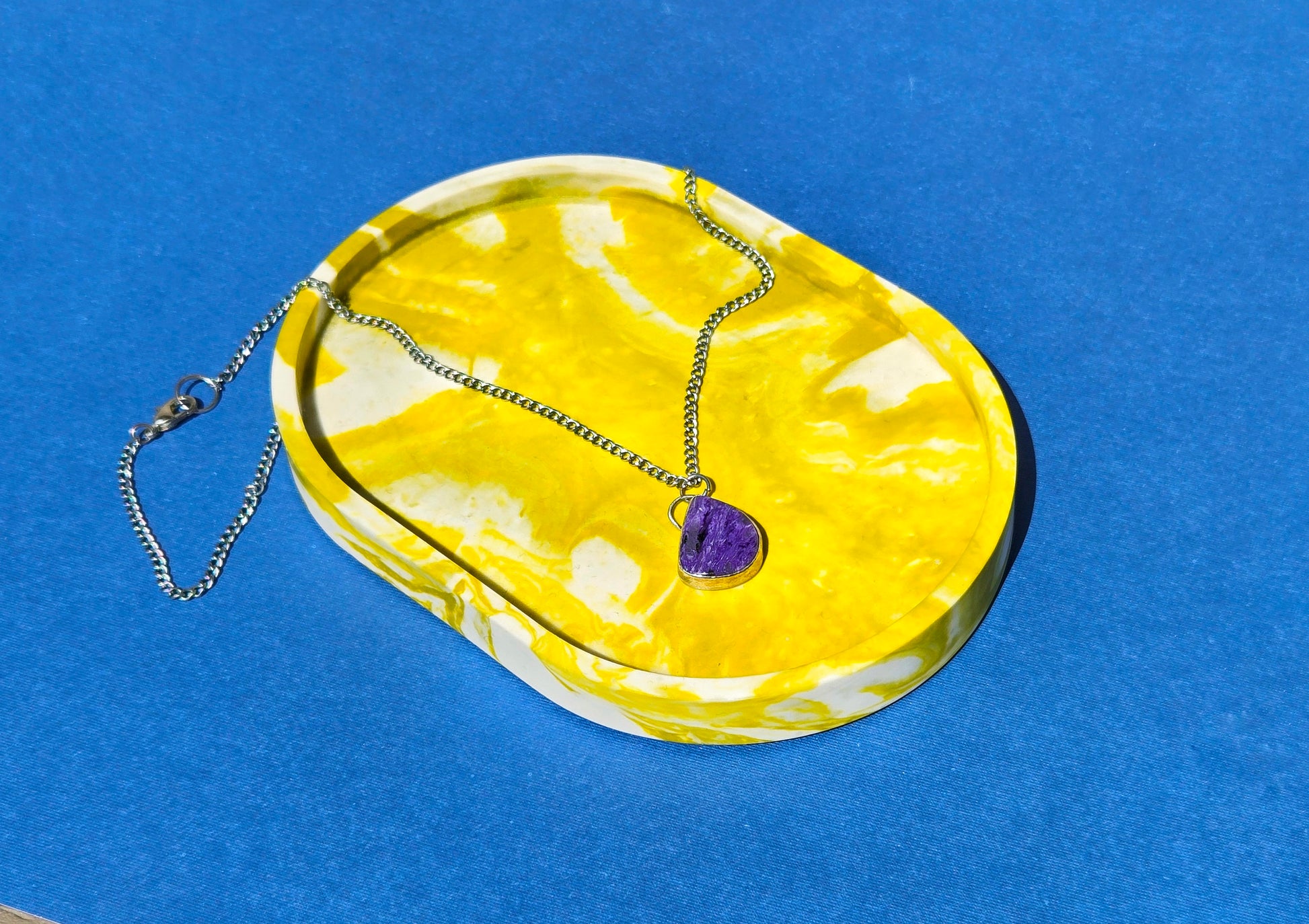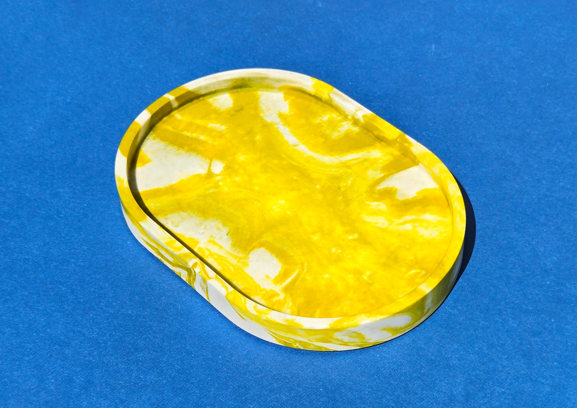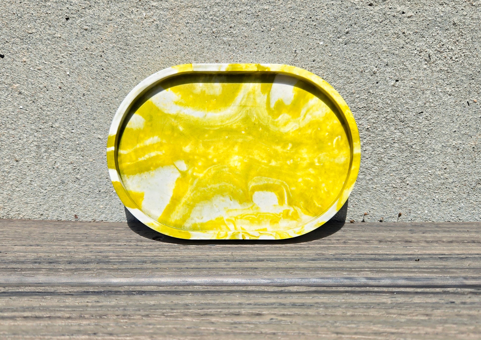 Need a special place for your keys? A pretty spot for your jewelry? This white and pea green swirled tray looks like stone while actually being an incredible resin mixture. The tray measures approximately 4 x 6 inches and comes with clear rubber bumper feet to protect the surface you place it on and keep it from sliding around.