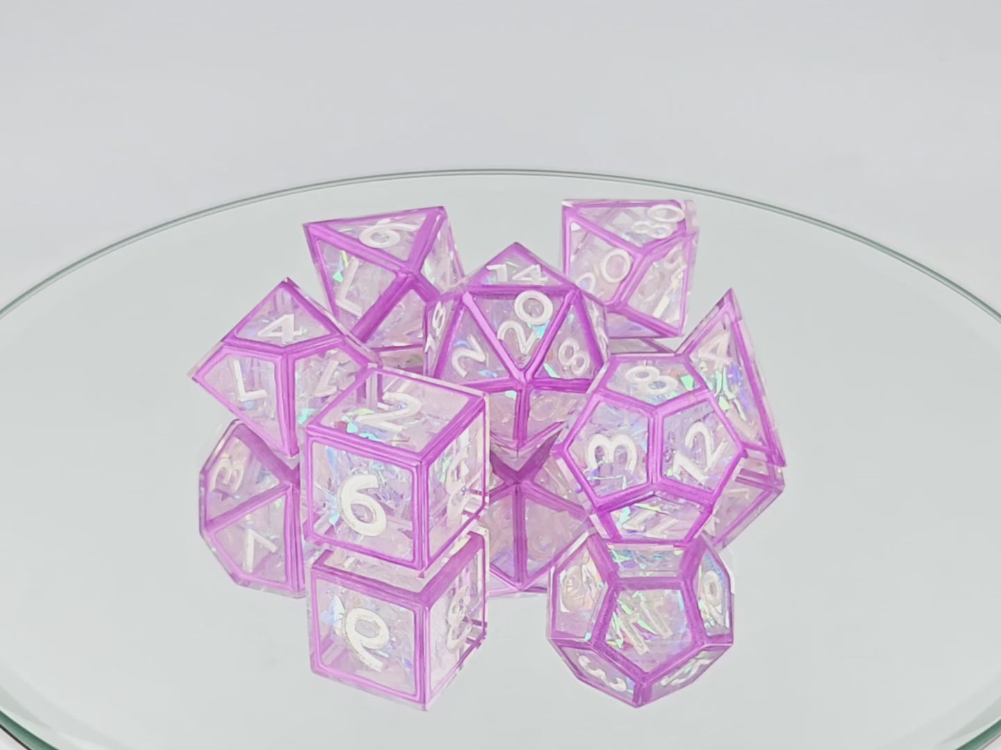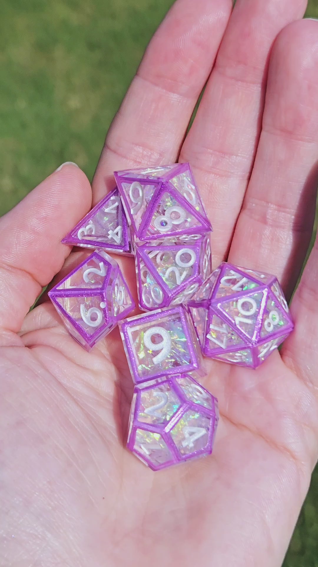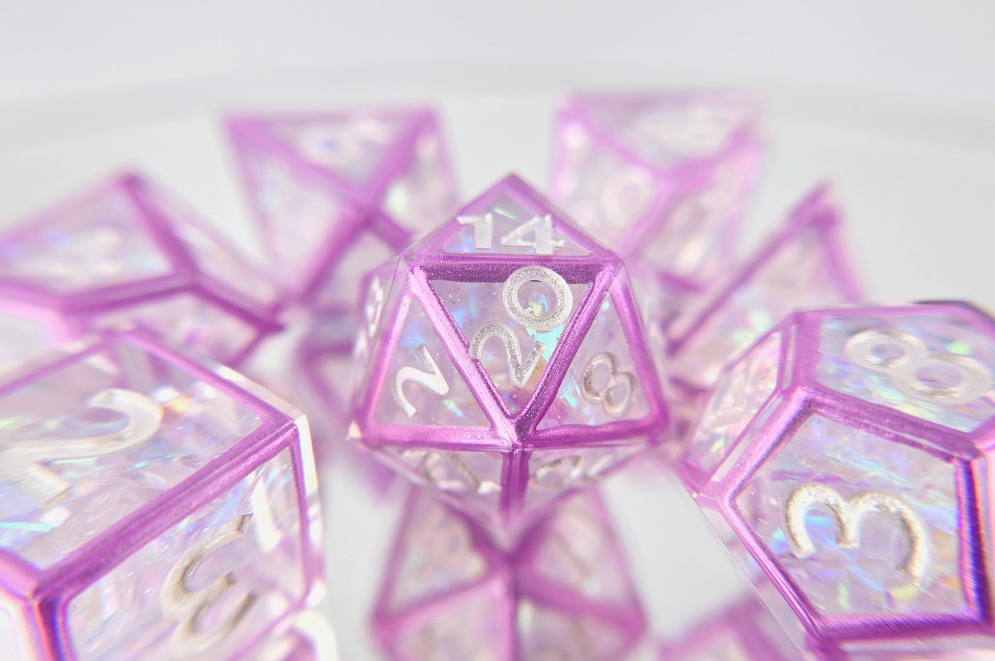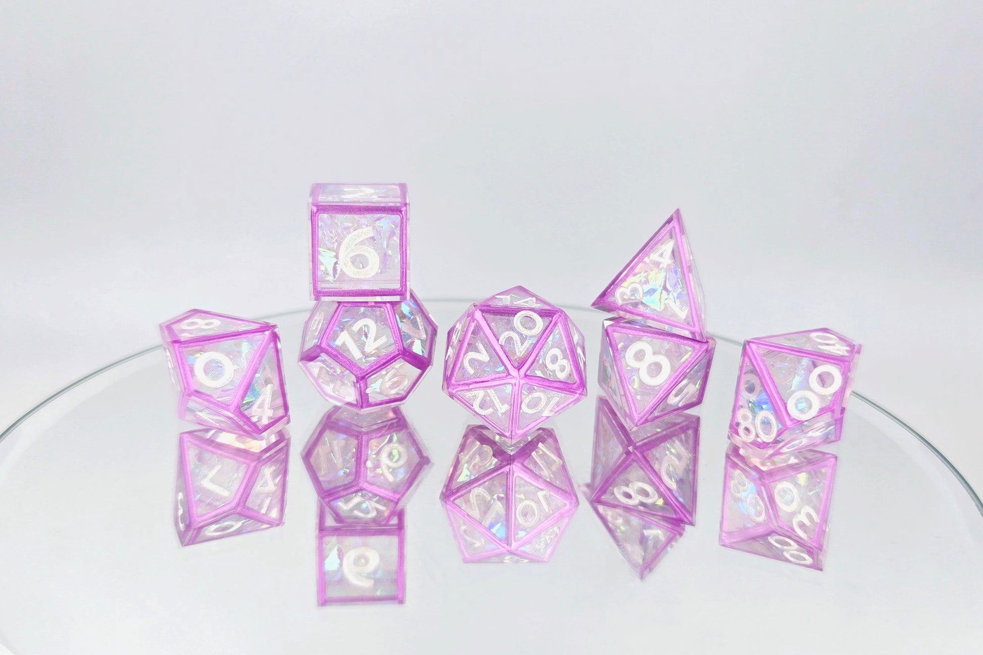 A full standard 7 piece polyhedral dice set (d20, d12, d%, d10, d8, d6, and d4) of clear resin with reflective mylar inside and a framed effect along each edge done in metallic purple. The effect is a visual texture only and is fully encased in smooth resin. The numbers are inked in a pearl white.