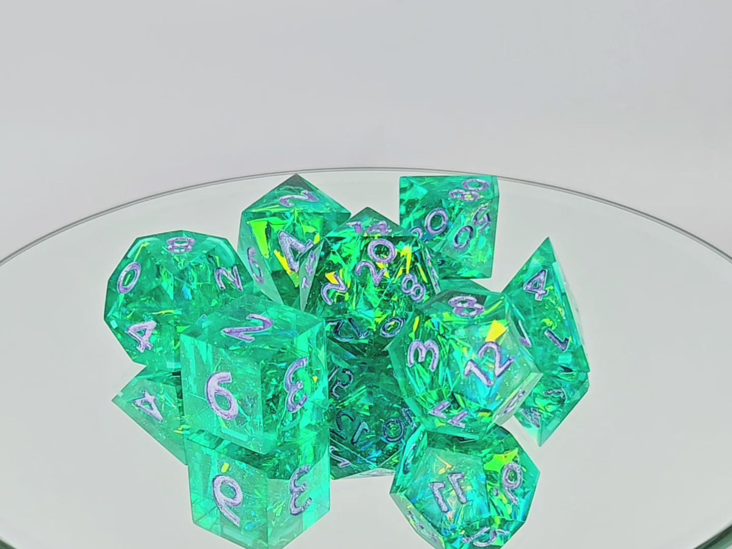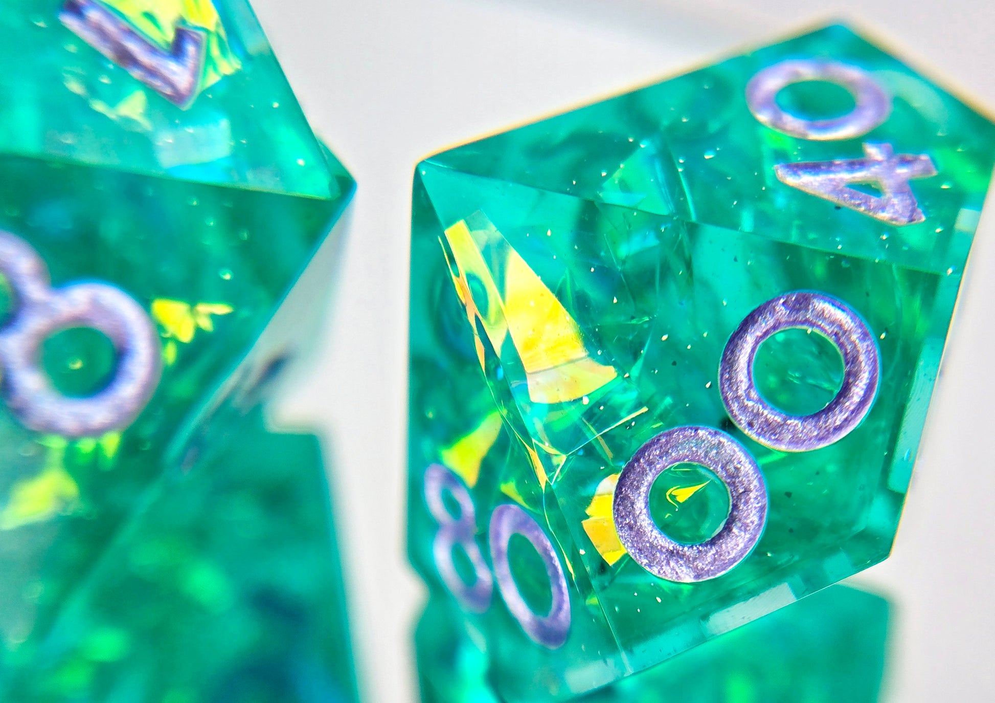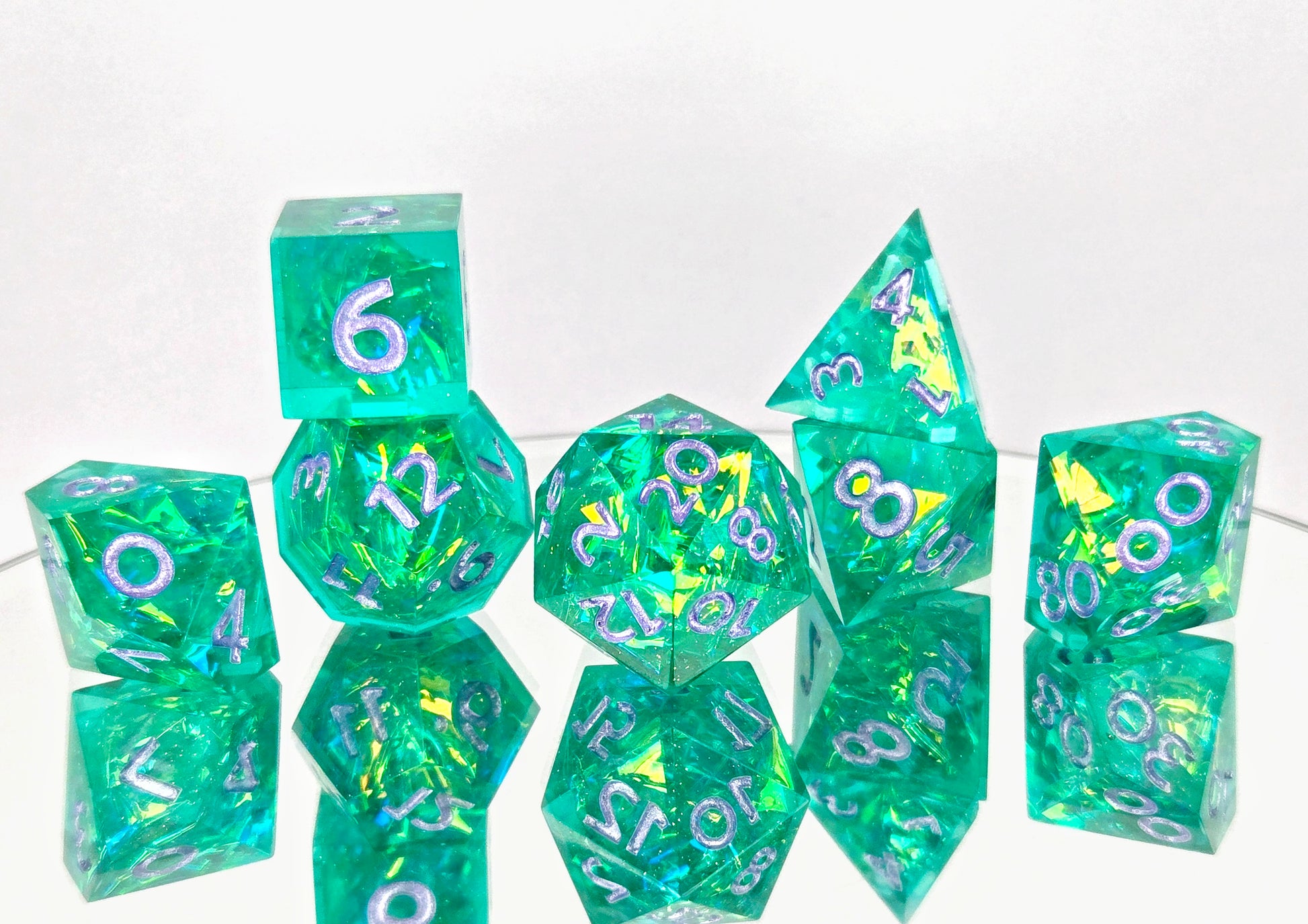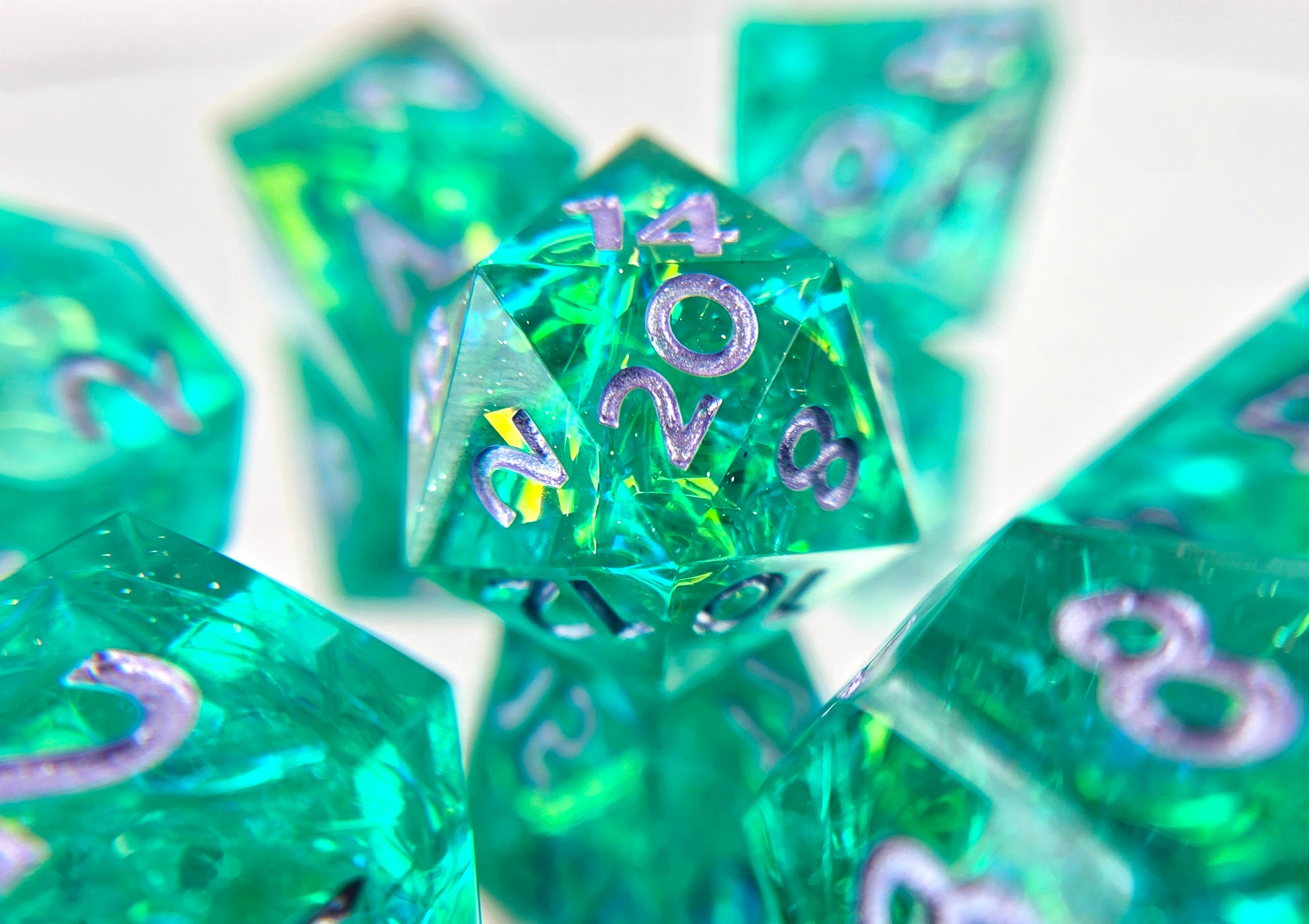 A full standard 7 piece polyhedral dice set (d20, d12, d%, d10, d8, d6, and d4) of transparent green resin loaded with reflective mylar and a subtle glitter. The numbers are inked in a metallic lilac purple.