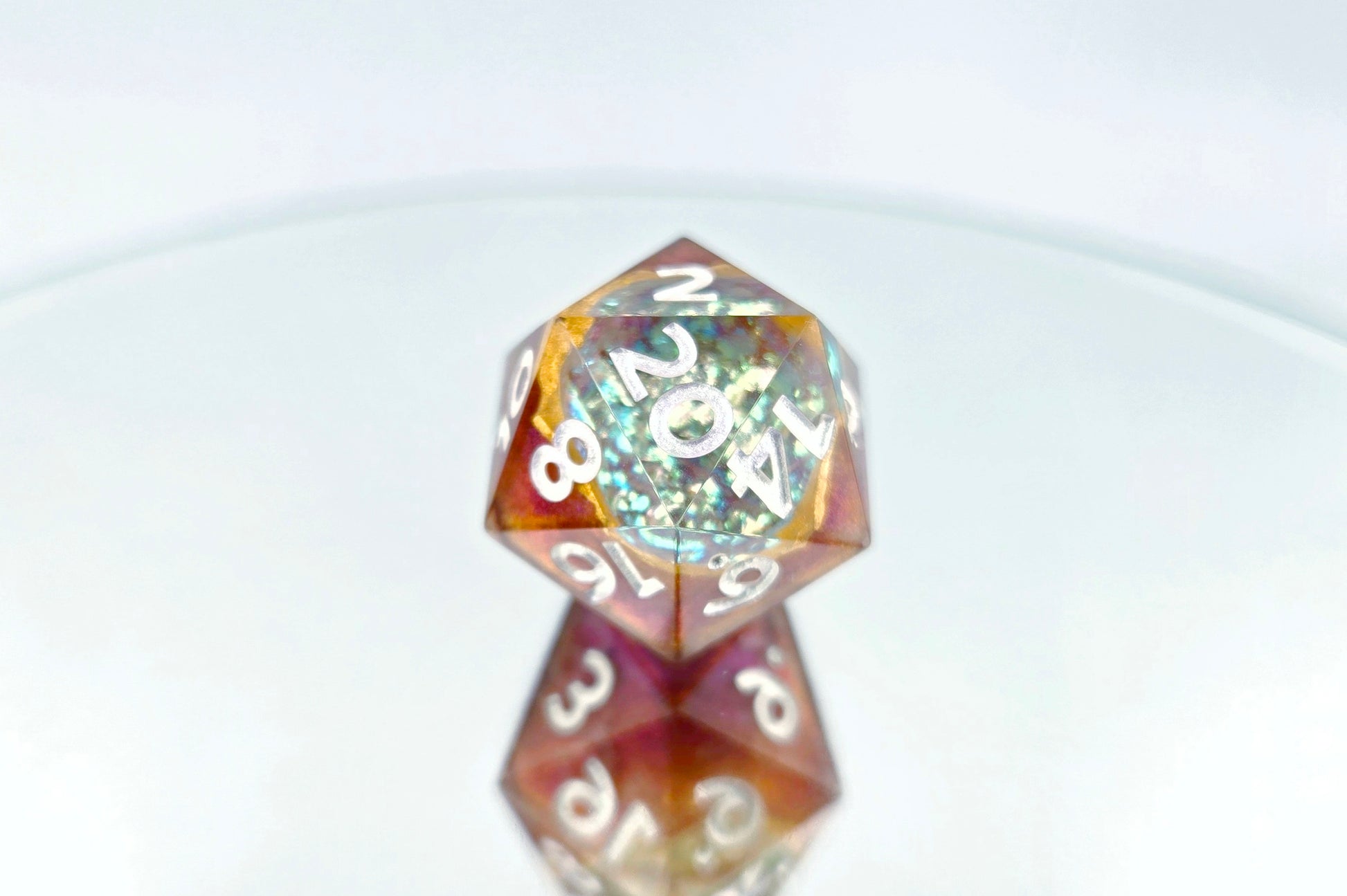A standard sized d20 designed to resemble a broken open geode. The body is a purple-ish red colorshifting shimmer while the inner cavity is a light blue to silver foil. The numbers are inked in a pearl white.
