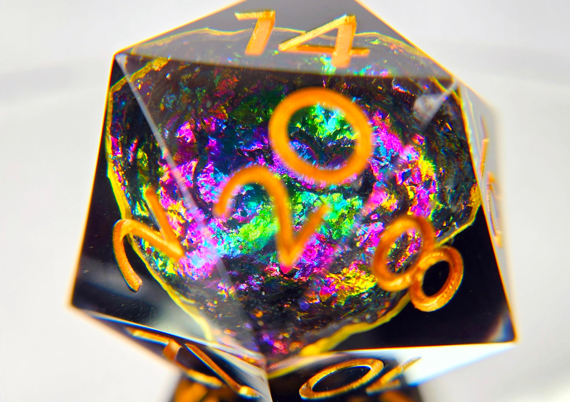 *Dice are entirely handmade from start to finish and therefore may have minor imperfections or color variations. Pictures are representative of the color and style but your exact set may vary. Please note color calibration of your screen may also vary. While they are just as balanced as commercially produced dice, it is recommended handmade dice be used for casual play only.