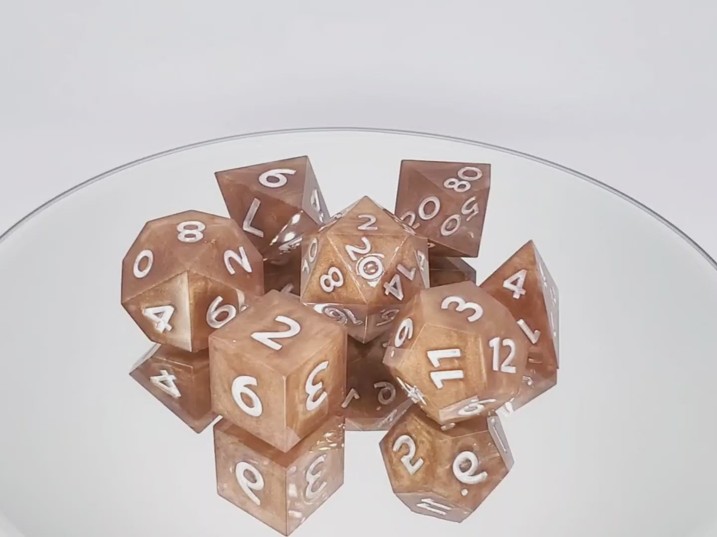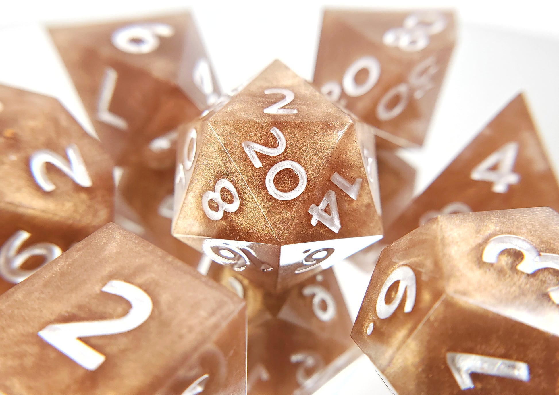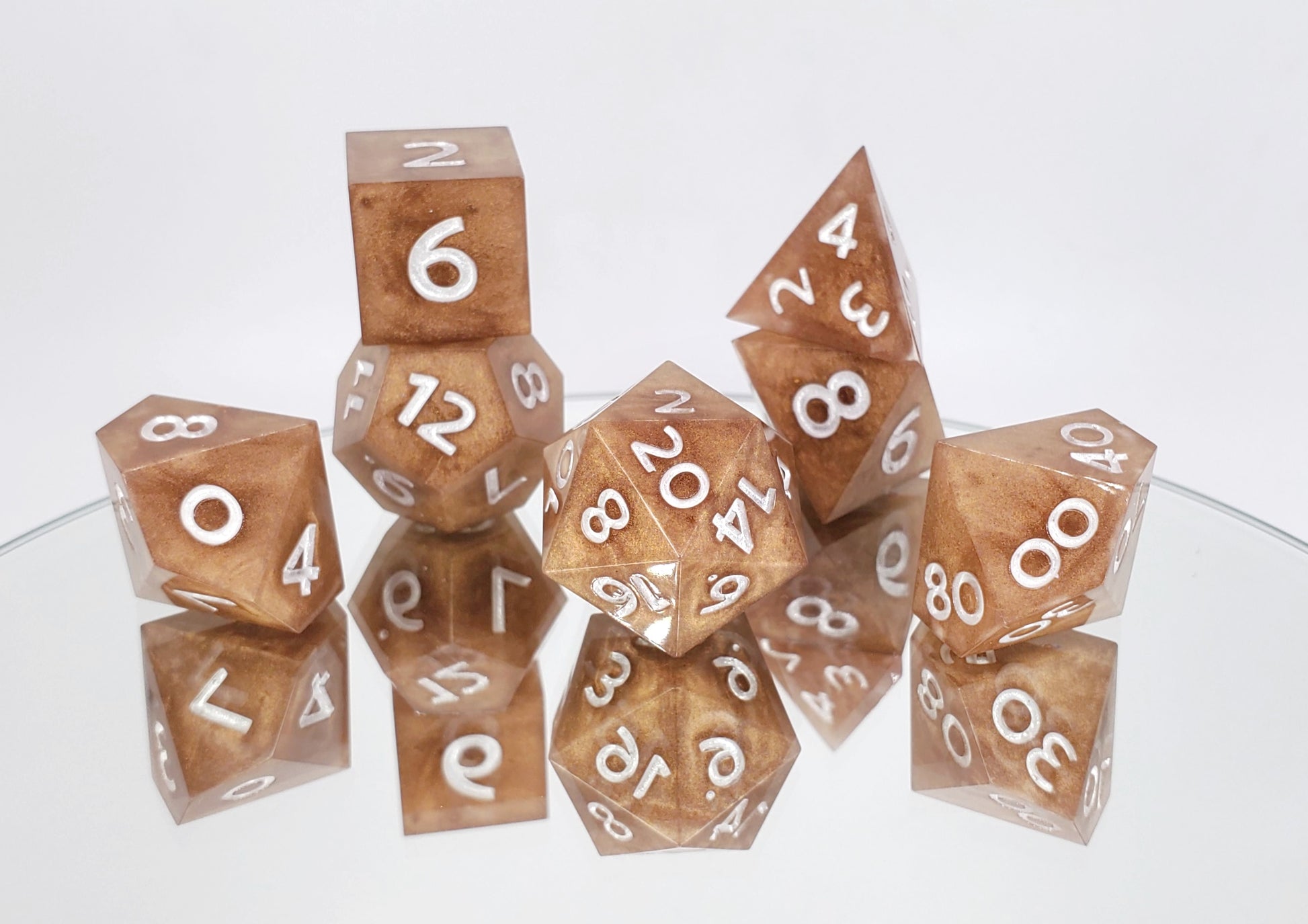 A full standard 7 piece polyhedral set (d20, d12, d%, d10, d8, d6, and d4) of shimmery light brown with pearl white numbers.