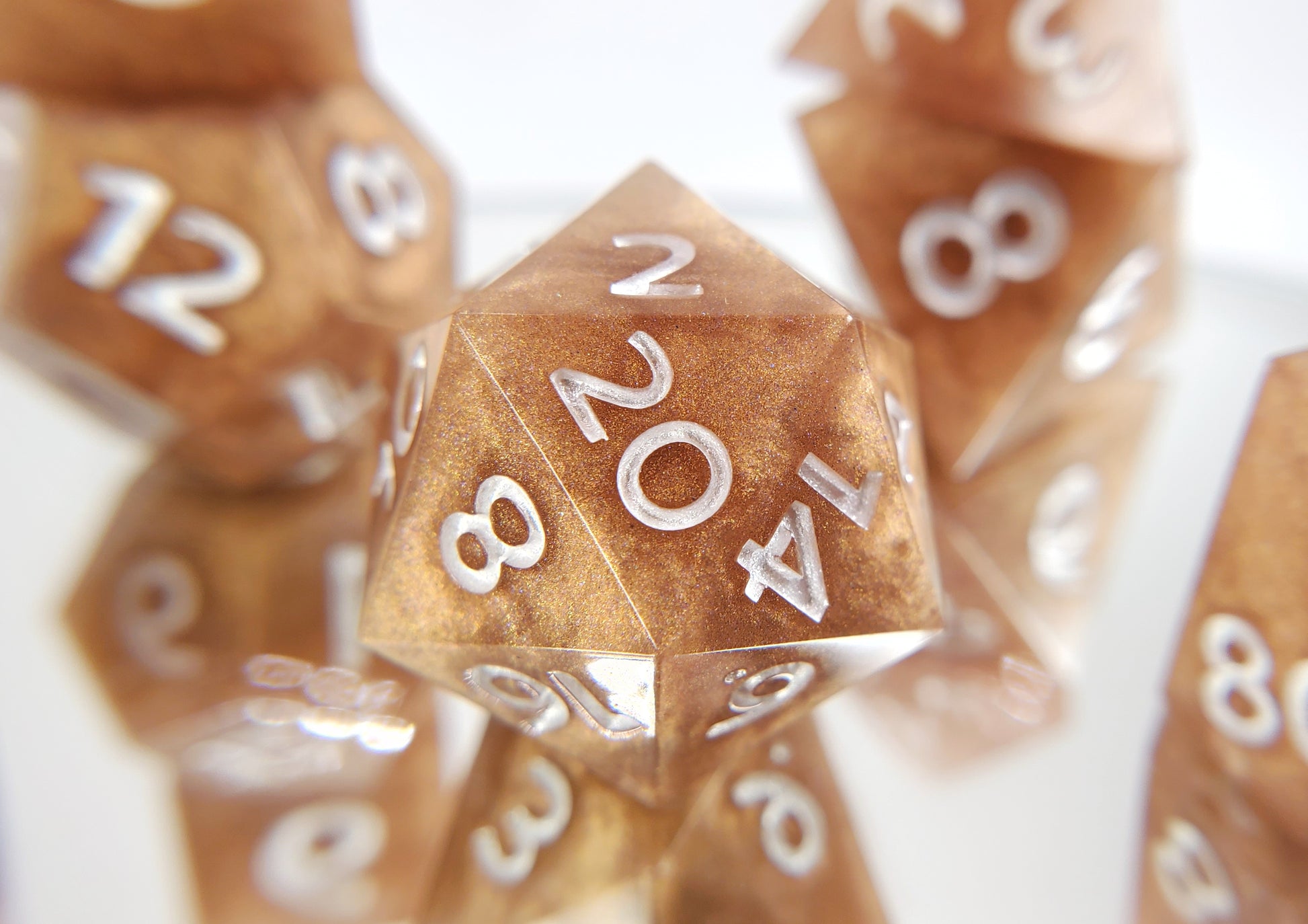 *Dice are entirely handmade from start to finish and therefore may have minor imperfections or color variations. Pictures are representative of the color and style but your exact set may vary. Please note color calibration of your screen may also vary. While they are just as balanced as commercially produced dice, it is recommended handmade dice be used for casual play only.