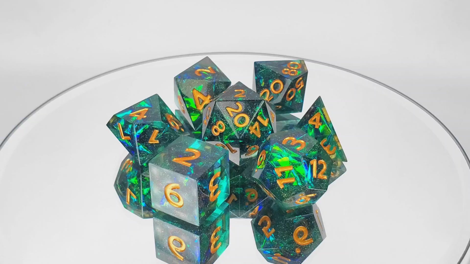 A full standard 7 piece polyhedral set (d20, d12, d%, d10, d8, d6, and d4) of green resin with green colorshift sparkles and blue/green mylar inside and gold numbers. This set comes with your choice of d4 shape and d12 shape.