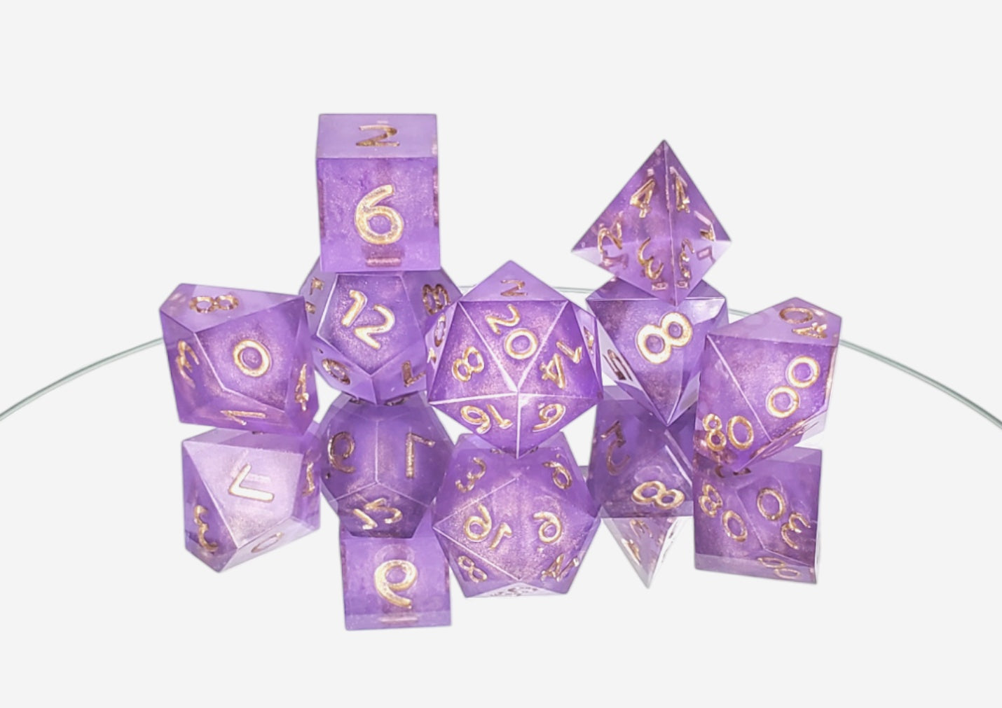 *Dice are entirely handmade from start to finish and therefore may have minor imperfections or color variations. Pictures are representative of the color and style but your exact set may vary. Please note color calibration of your screen may also vary. While they are just as balanced as commercially produced dice, it is recommended handmade dice be used for casual play only.