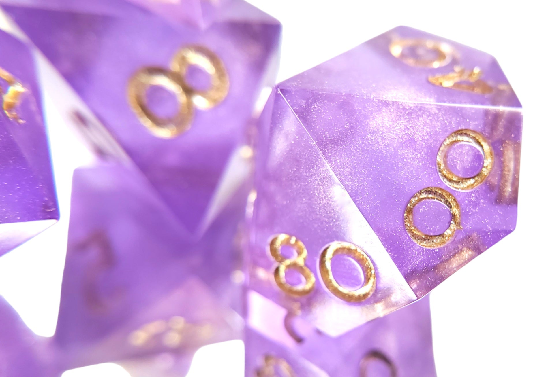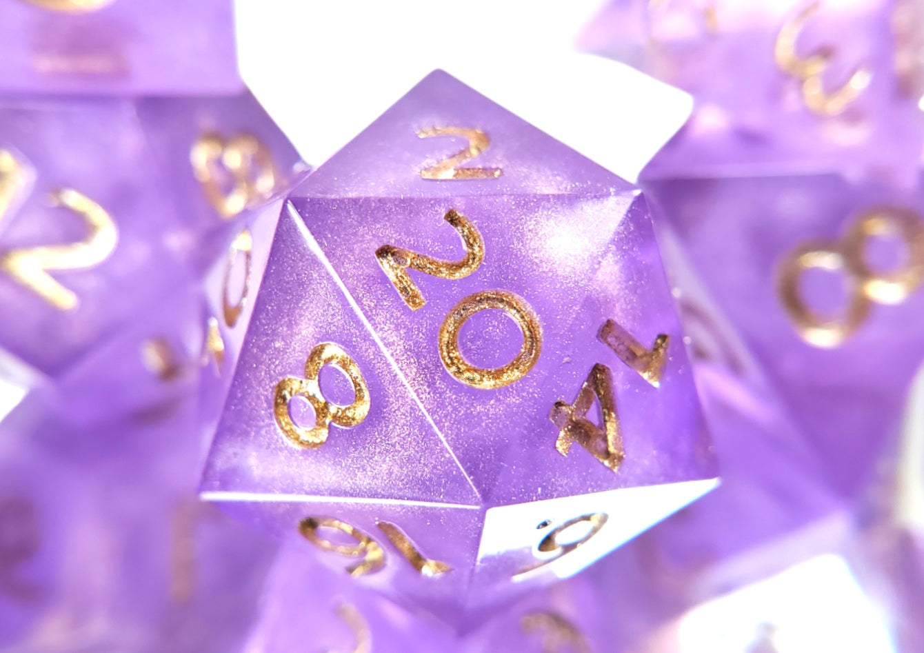 A full standard 7 piece polyhedral set (d20, d12, d%, d10, d8, d6, and d4) of light purple resin with gold shimmer and gold numbering.