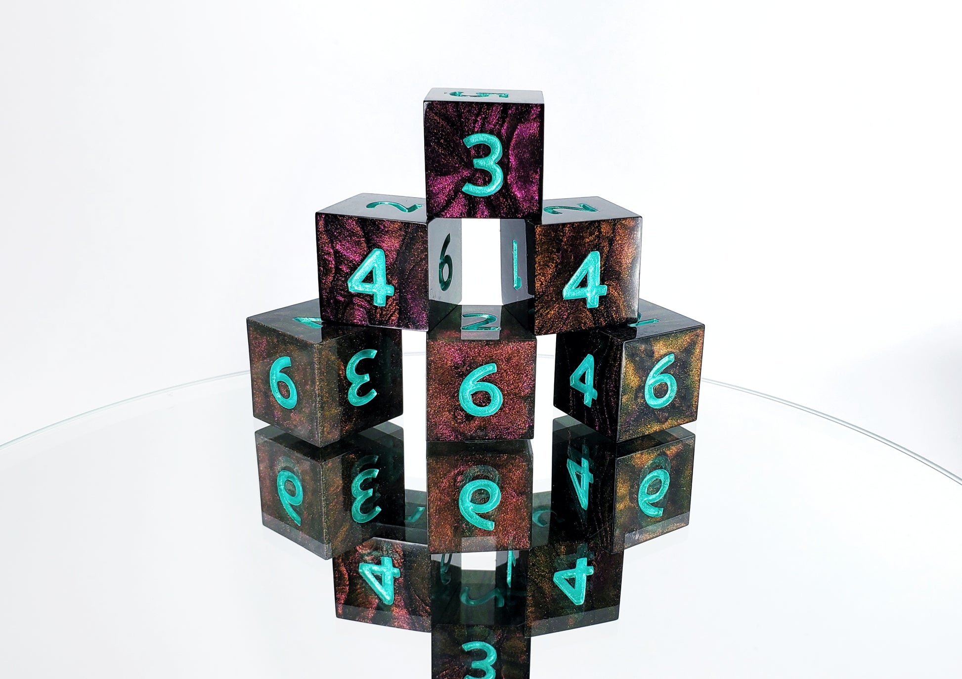 A set of 6 (six) d6 of purple/yellow/green colorshift shimmer with metallic cool green numbering. If you're looking for a full 7-piece standard rpg set in this color, you can find that here.