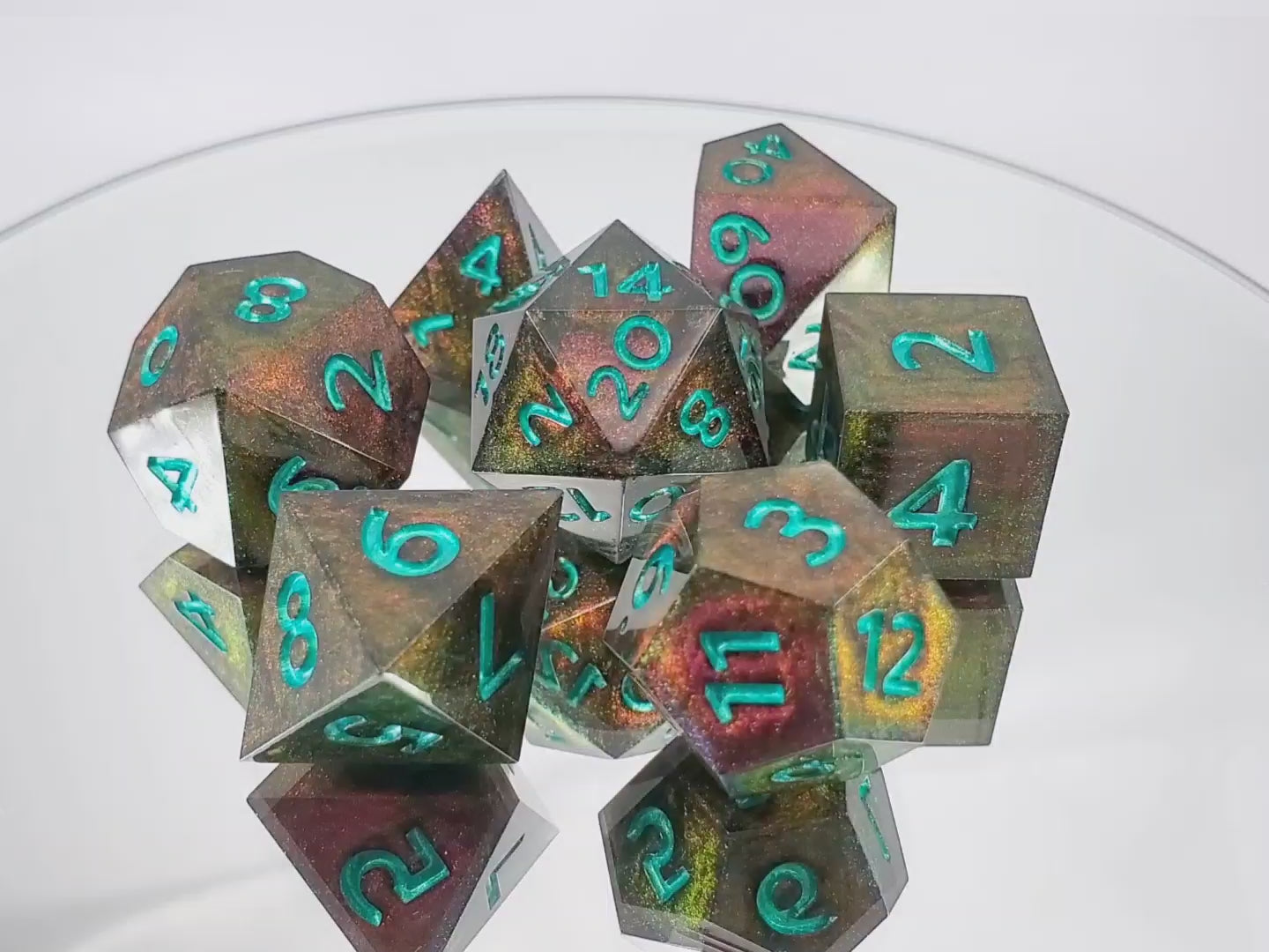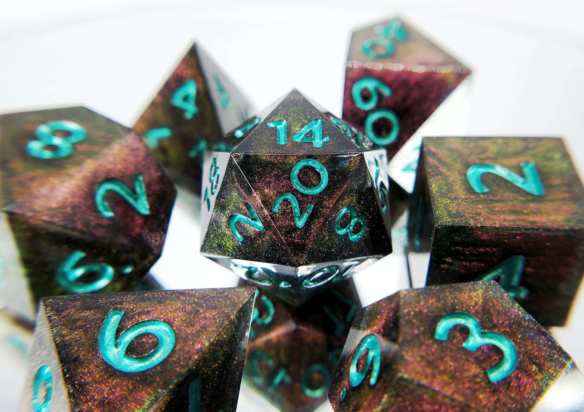 *Dice are entirely handmade from start to finish and therefore may have minor imperfections or color variations. Pictures are representative of the color and style but your exact set may vary. Please note color calibration of your screen may also vary. While they are just as balanced as commercially produced dice, it is recommended handmade dice be used for casual play only.