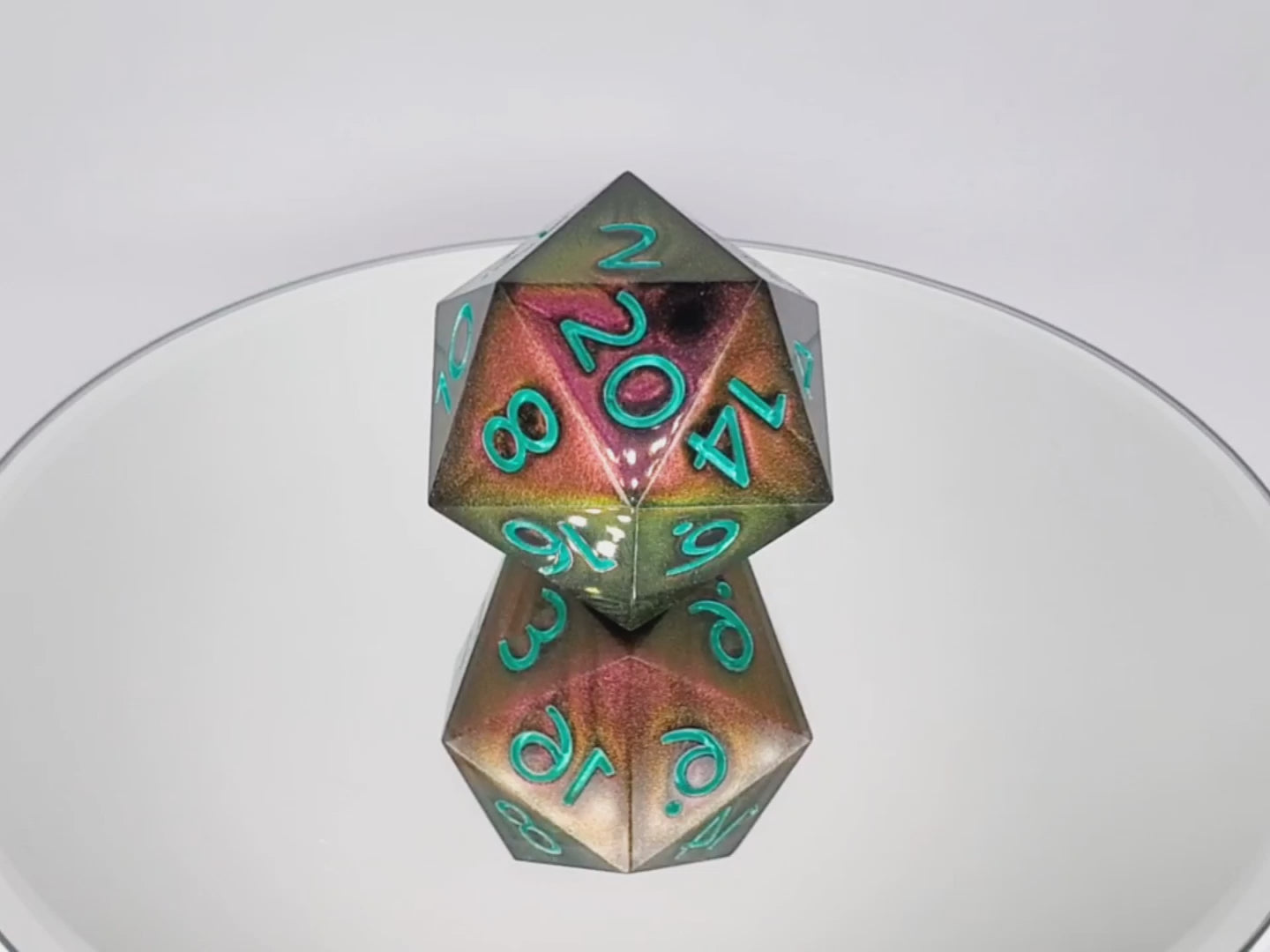 A large 35mm d20 of red/purple/yellow/green colorshift shimmer with metallic cool green numbering.
