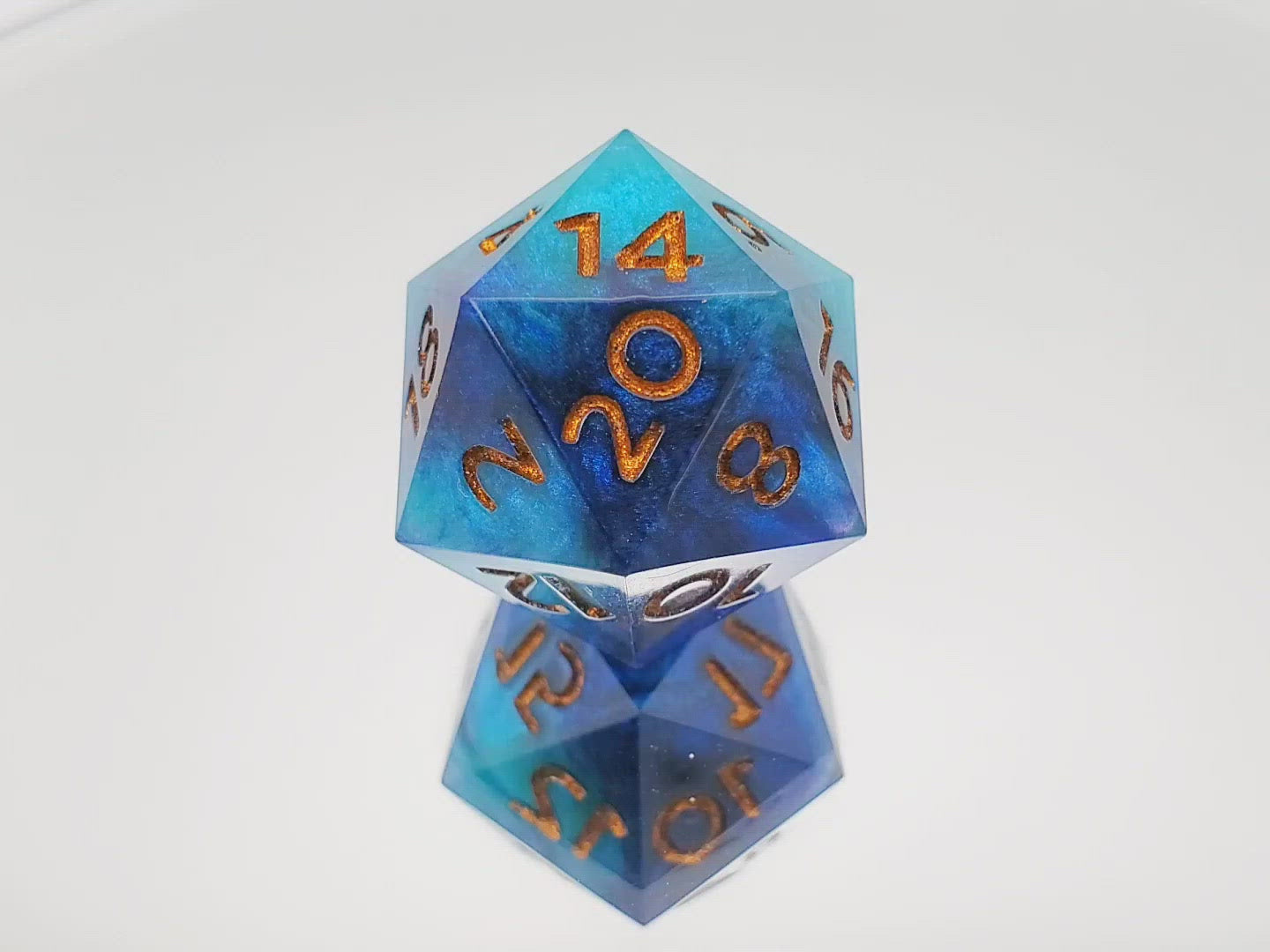 A standard sized d20 of blue shimmer swirls and and copper numbering.