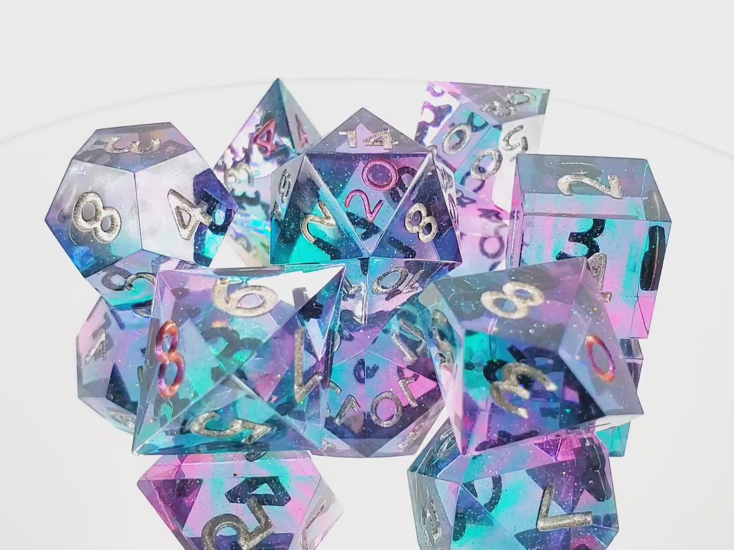 A full standard 7 piece polyhedral set (d20, d12, d%, d10, d8, d6, and d4) of pink and teal swirls create illusions of blue and purple amid sparkling silver and deep purple-pink numbering.