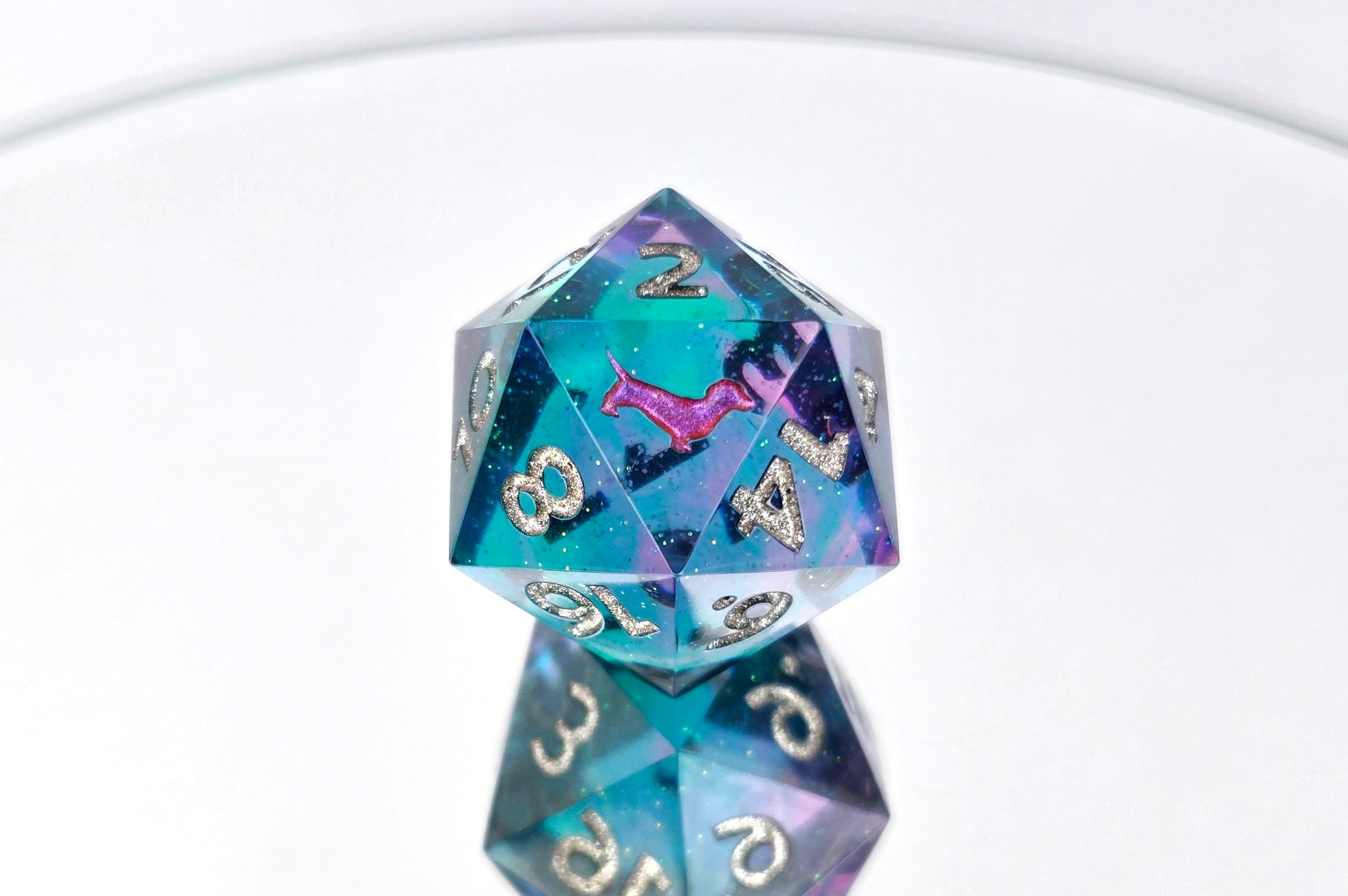 Your choice of a single d20, 6d6, 5d10, or full standard 7 piece polyhedral set (d20, d12, d%, d10, d8, d6, and d4) of pink and teal swirls create illusions of blue and purple amid sparkling silver and deep purple-pink numbering. Select your preferred set type to see more options to customize it!