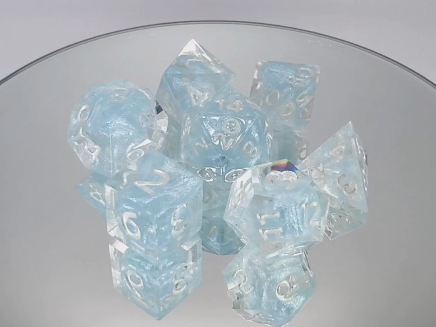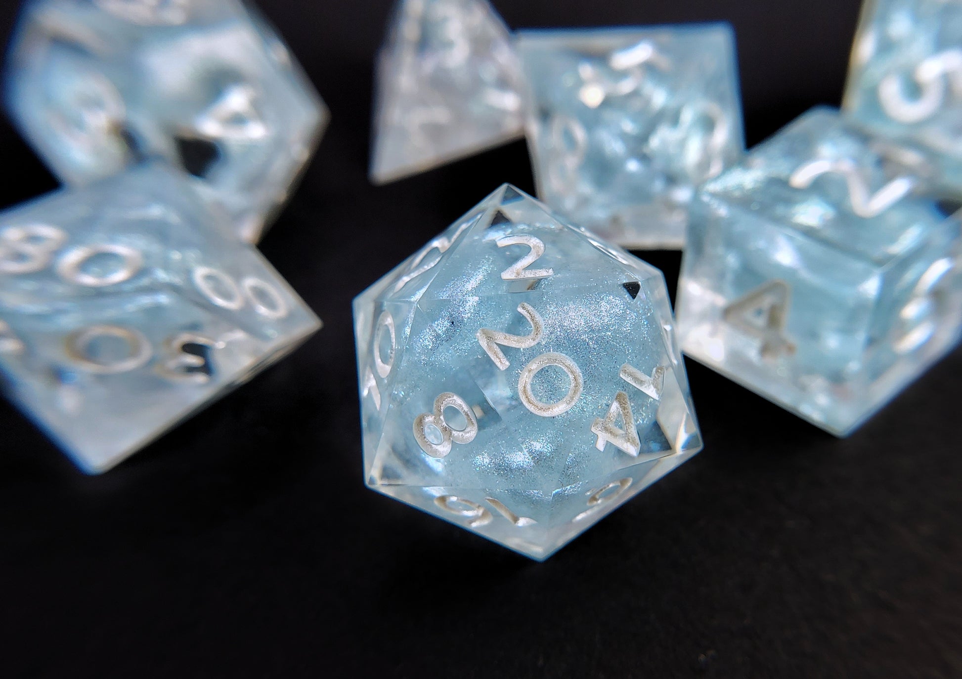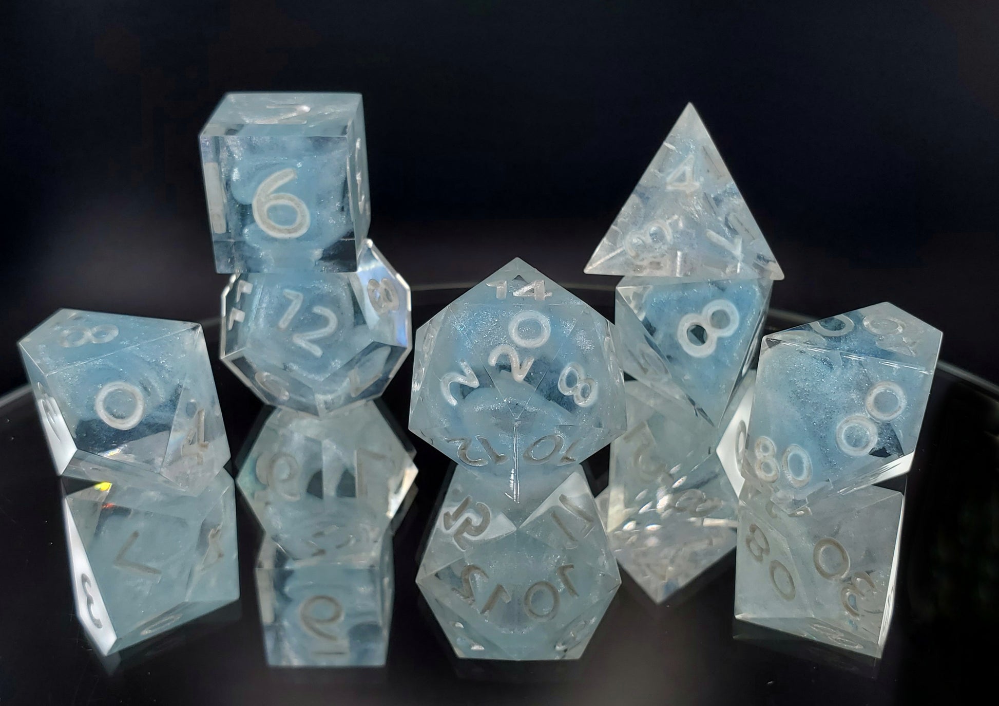 A full standard 7 piece polyhedral set (d20, d12, d%, d10, d8, d6, and d4) of clear resin with glittering light blue clouds and pearl white numbering.