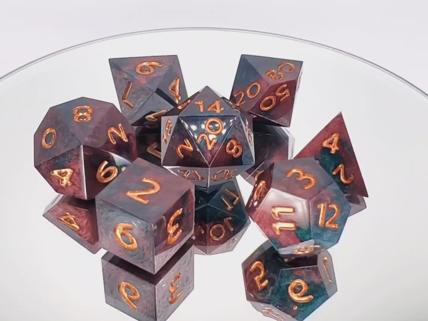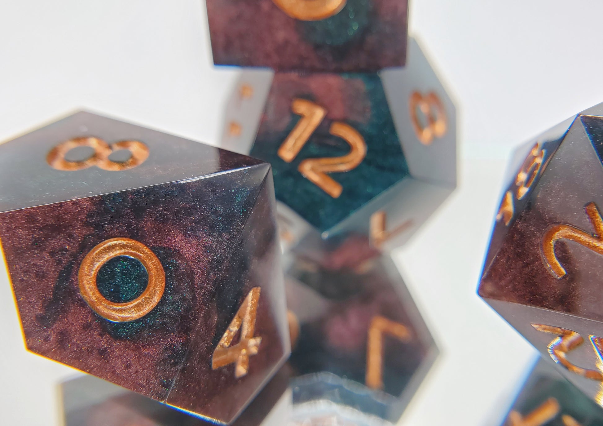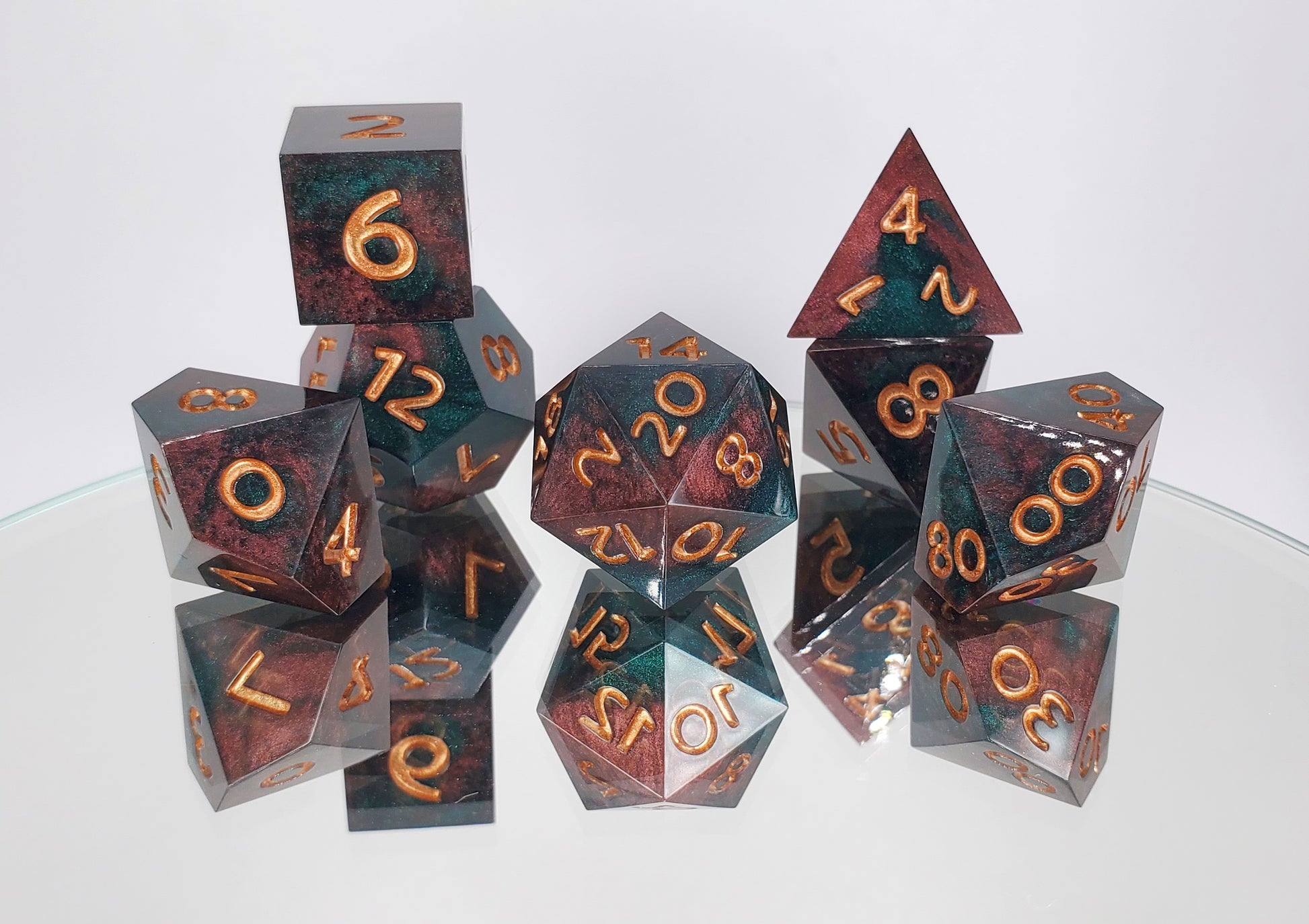 *Dice are entirely handmade from start to finish and therefore may have minor imperfections or color variations. Pictures are representative of the color and style but your exact set may vary. Please note color calibration of your screen may also vary. While they are just as balanced as commercially produced dice, it is recommended handmade dice be used for casual play only.
