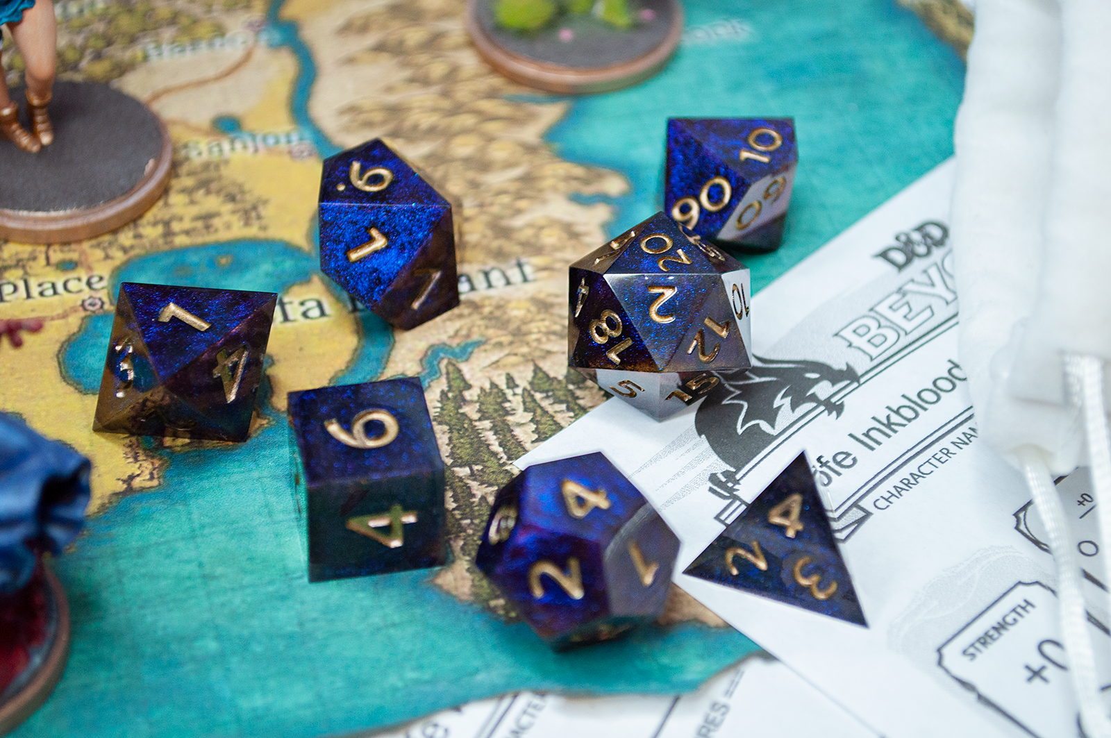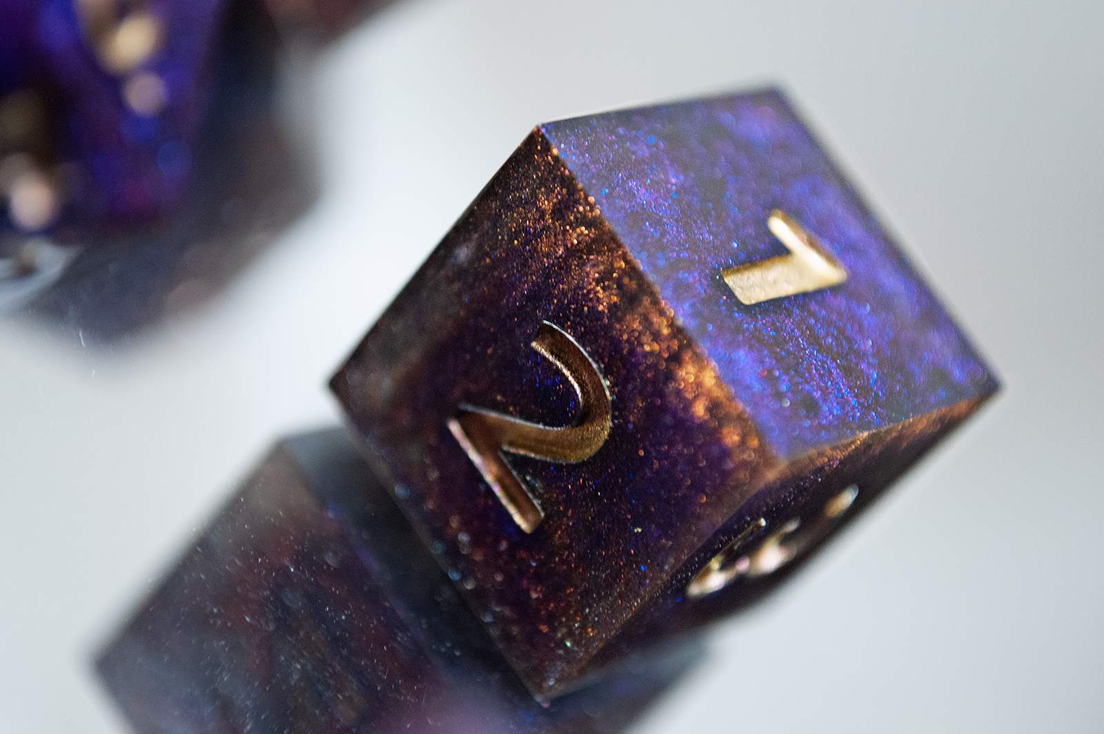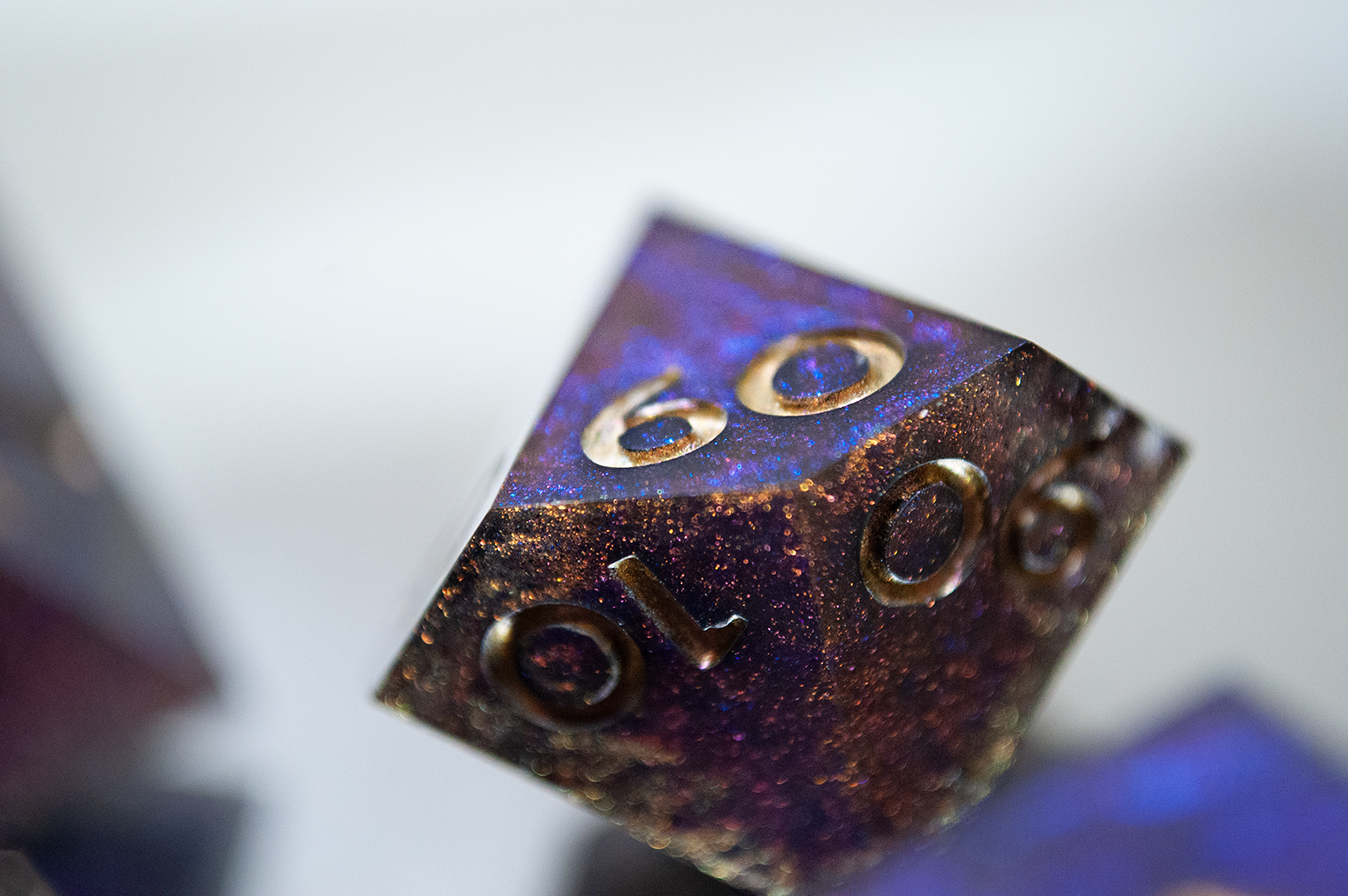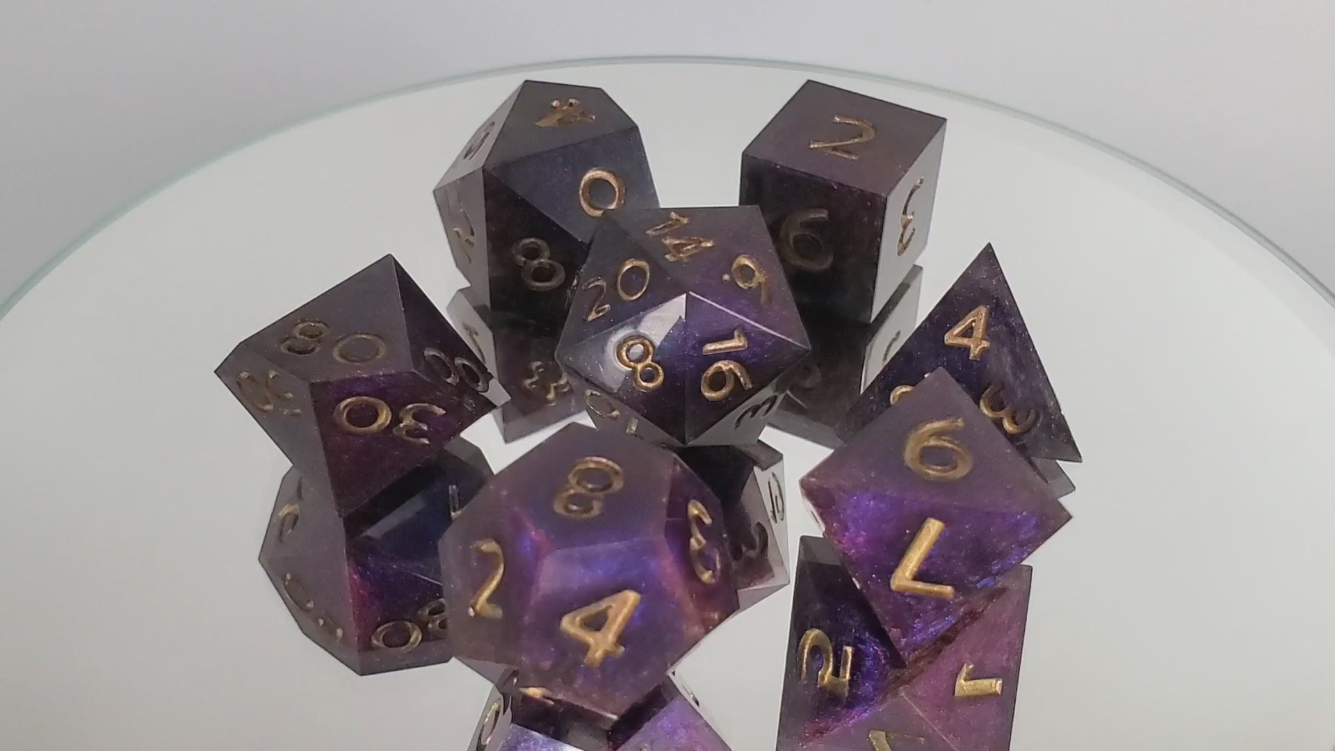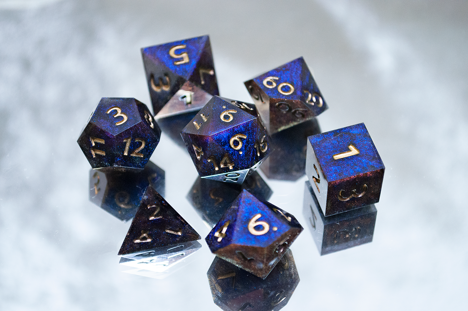 *Dice are entirely handmade from start to finish and therefore may have minor imperfections or color variations. Pictures are representative of the color and style but your exact set may vary. Please note color calibration of your screen may also vary. While they are just as balanced as commercially produced dice, it is recommended handmade dice be used for casual play only.