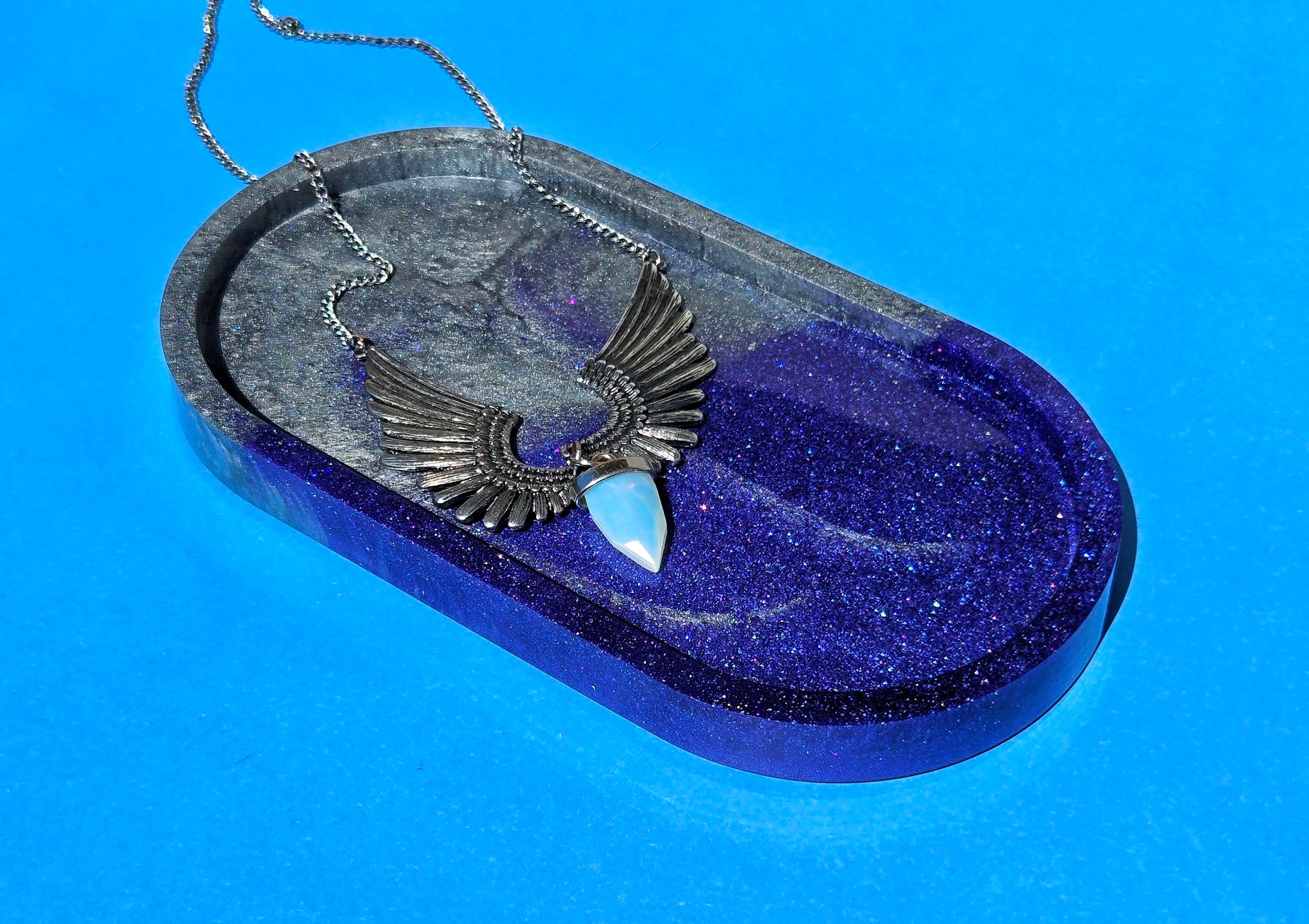 Need a special place for your keys? A pretty spot for your jewelry? This purple and silver resin tray is ready to hold all of your trinkets in one place! The tray measures approximately 3.75 x 7.25 inches and comes with clear rubber bumper feet to protect the surface you place it on and keep it from sliding around.