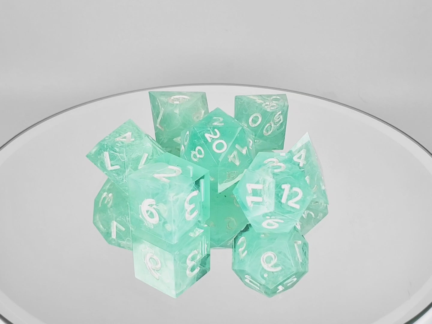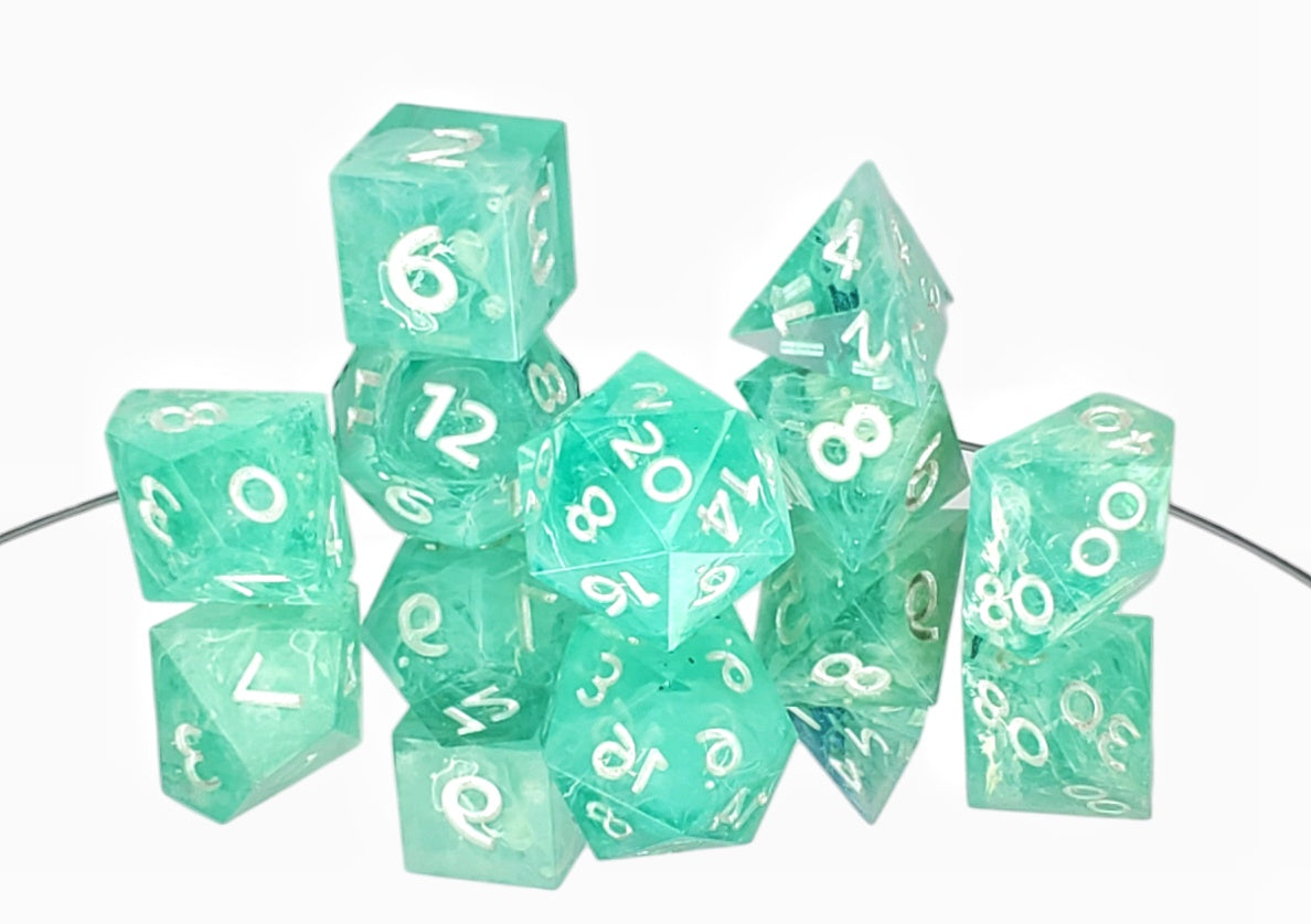 A full standard 7 piece polyhedral set (d20, d12, d%, d10, d8, d6, and d4) of light blue-green resin with white swirls and pearl white numbers.