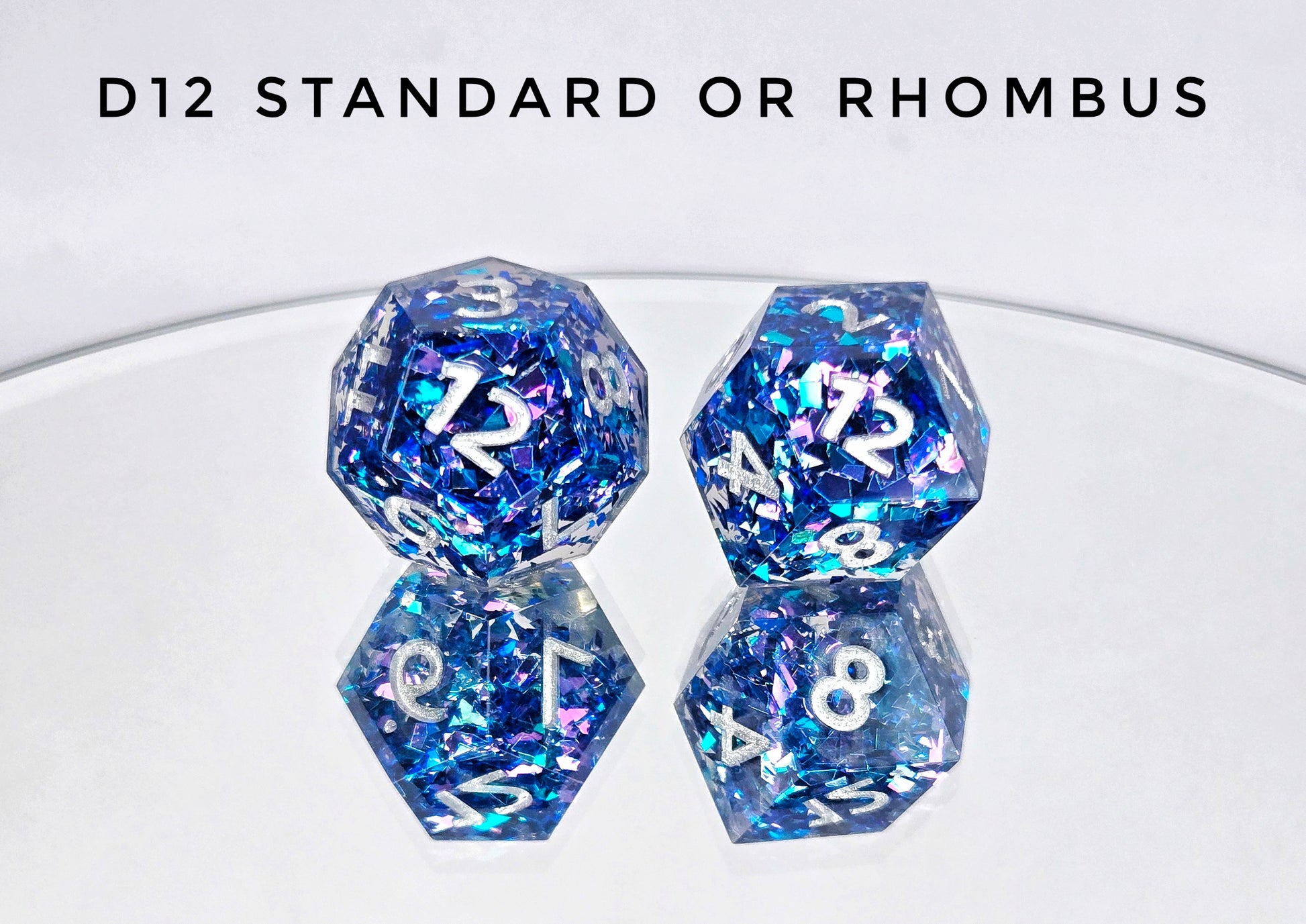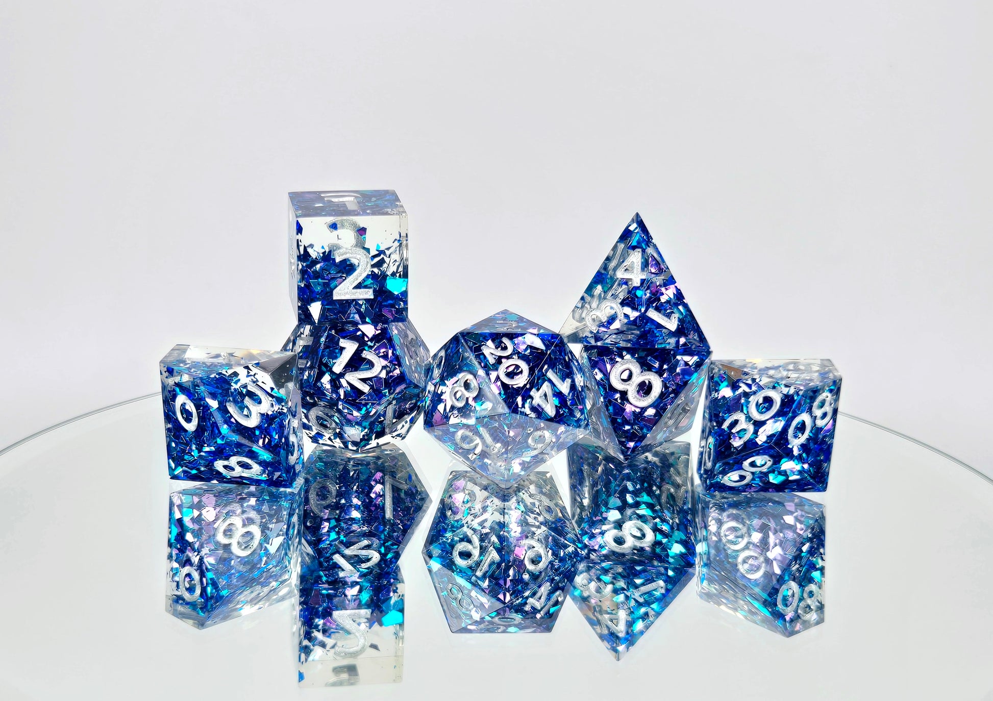 A full standard 7 piece polyhedral set (d20, d12, d%, d10, d8, d6, and d4) of clear dice with blue and purple colorshifting glitter shards that break up across the die with silver numbering.