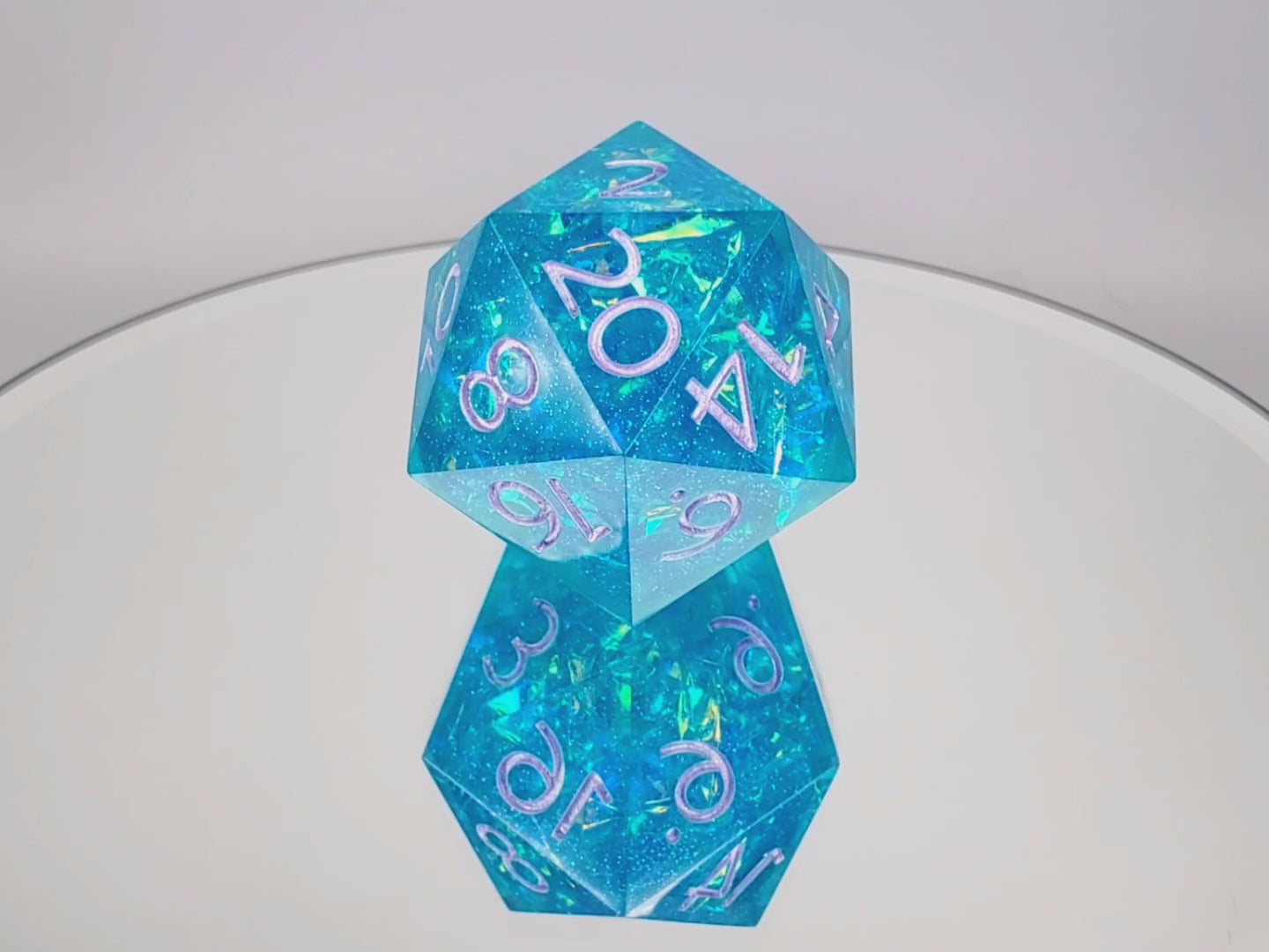 A large 35mm d20 of light blue resin with blue sparkles and opal mylar inside. Numbers are inked in metallic light purple.