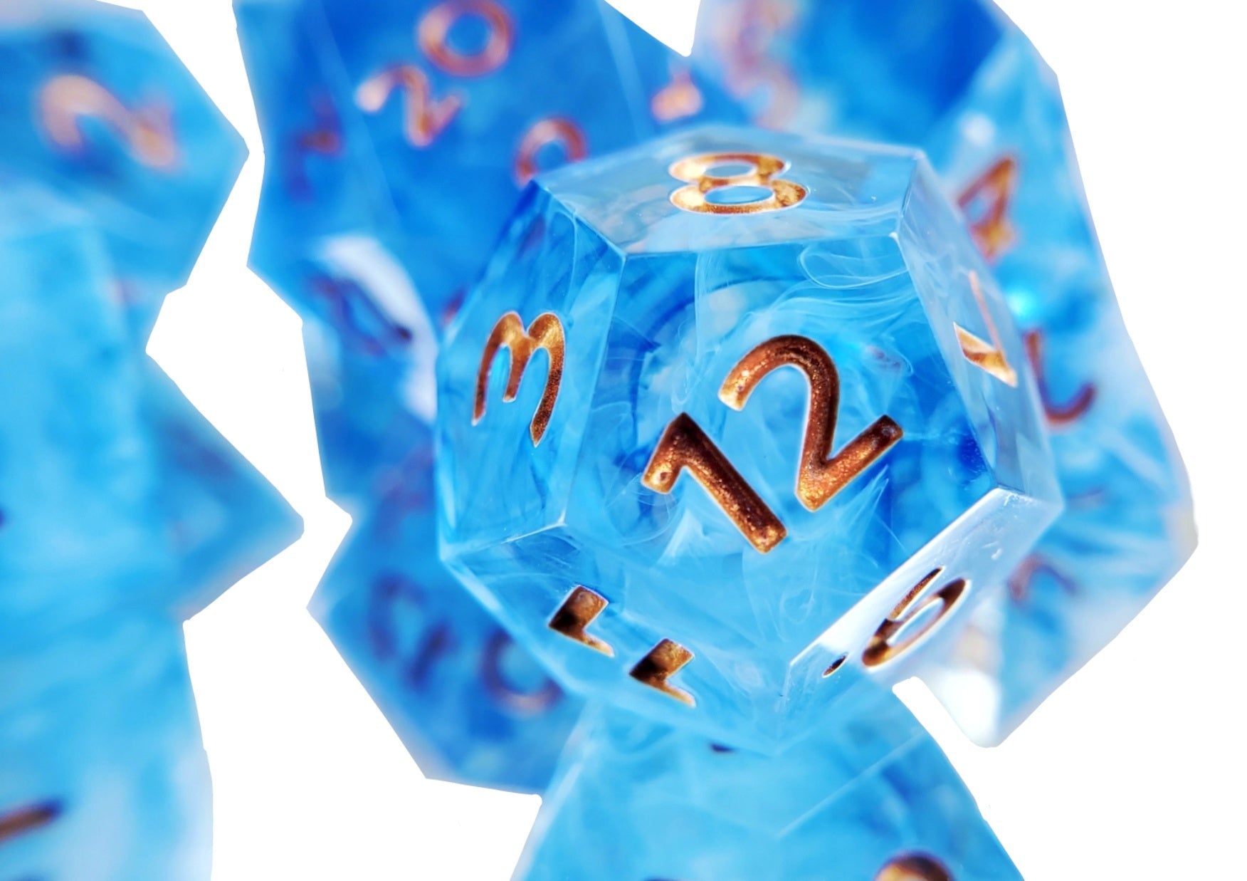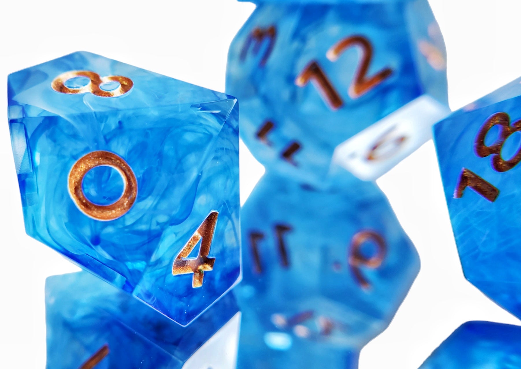 A full standard 7 piece polyhedral set (d20, d12, d%, d10, d8, d6, and d4) of blue resin with white swirls and gold numbers.