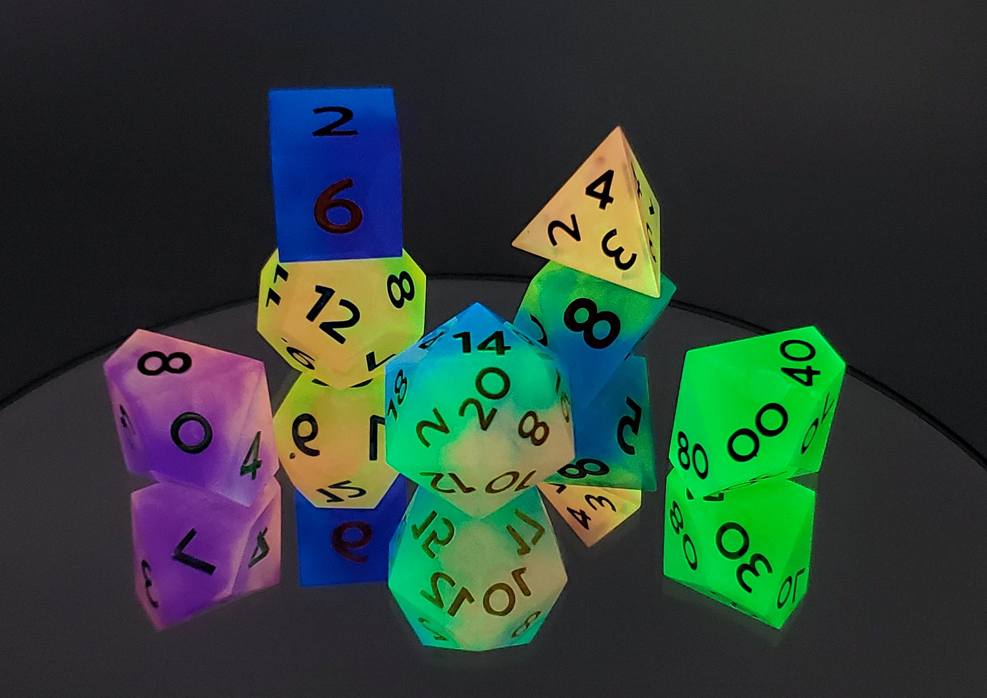 A full standard 7 piece polyhedral set (d20, d12, d%, d10, d8, d6, and d4) of neon glow-in-the-dark dice with bright numbering. Every set is unique and no color combination is the same.