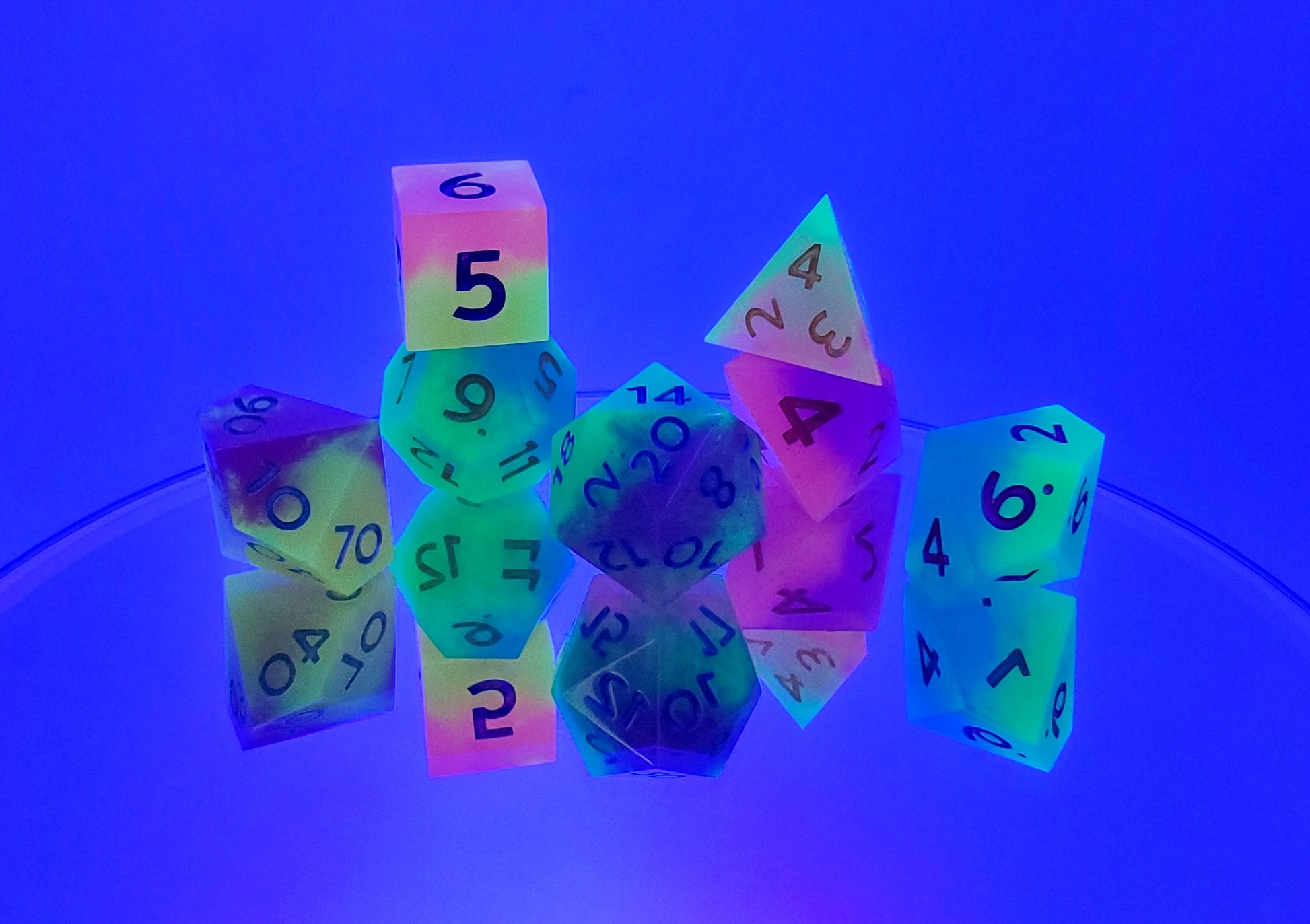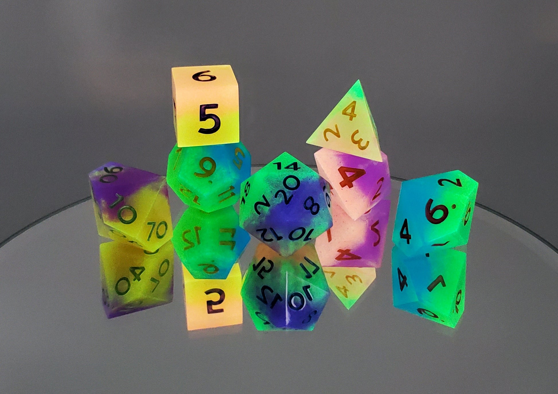 A full standard 7 piece polyhedral set (d20, d12, d%, d10, d8, d6, and d4) of neon glow-in-the-dark dice with bright numbering. Every set is unique and no color combination is the same.