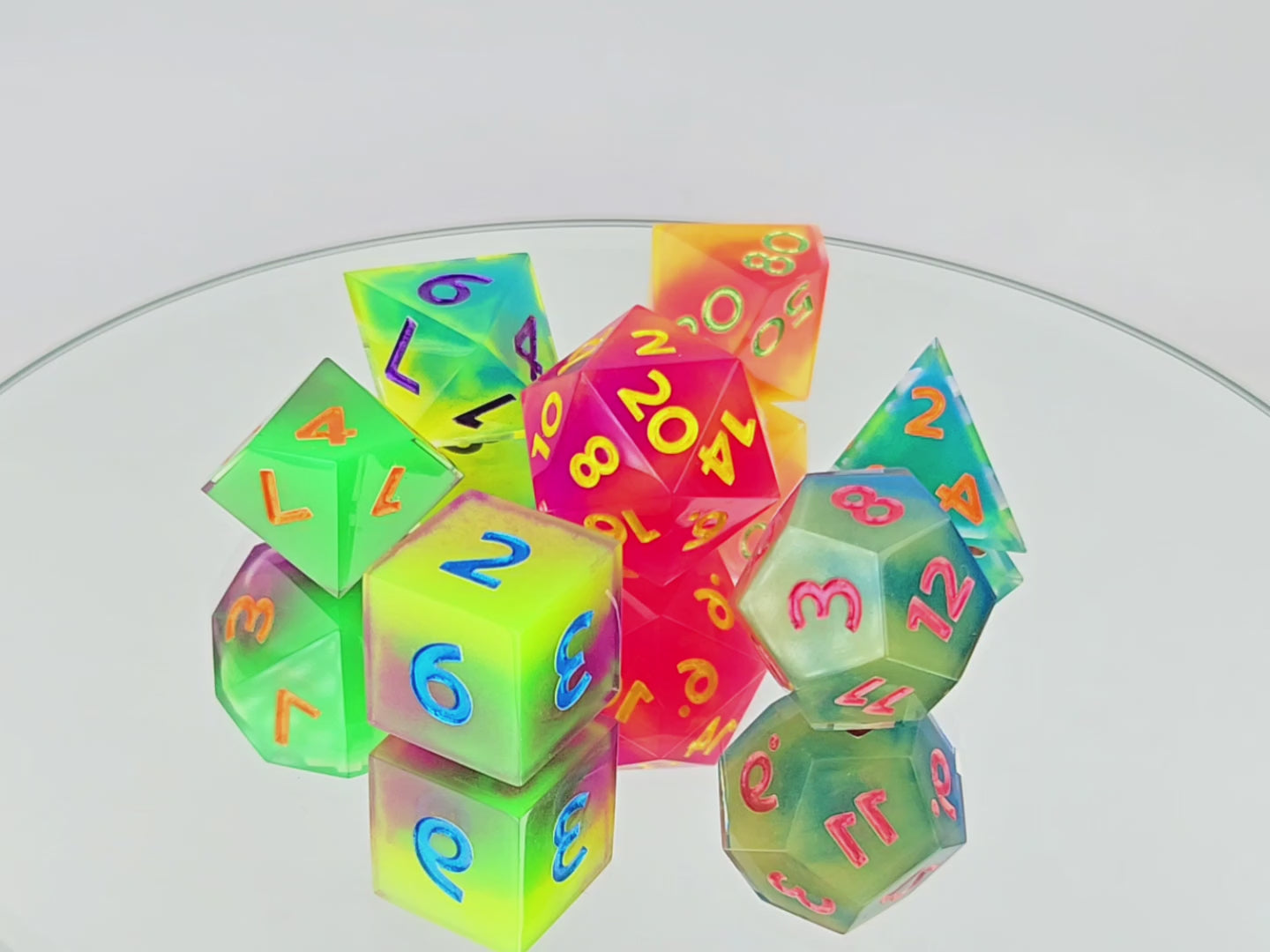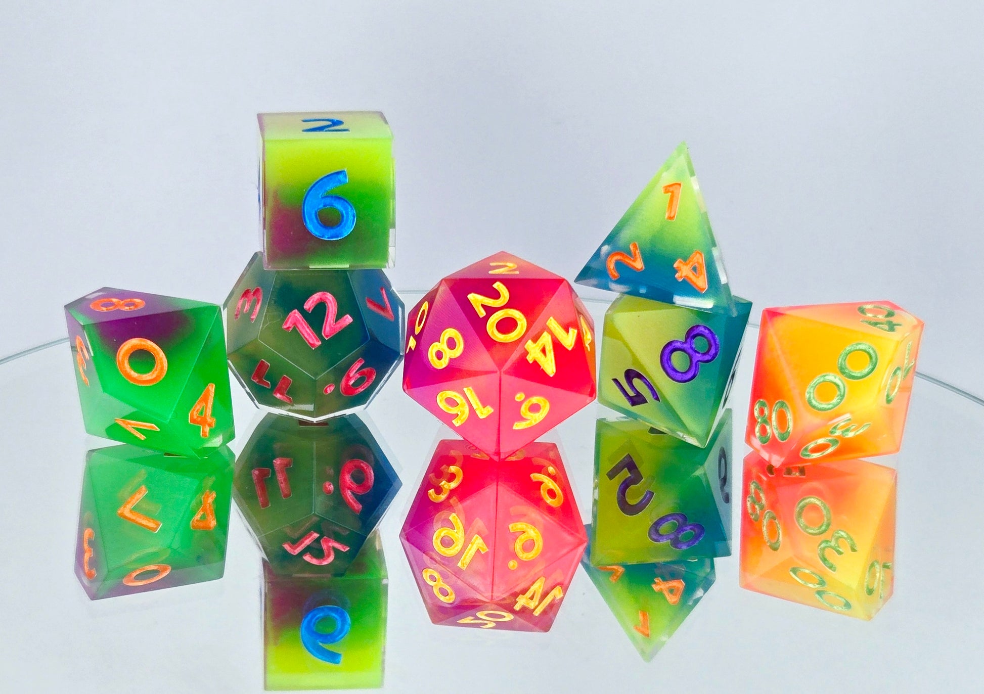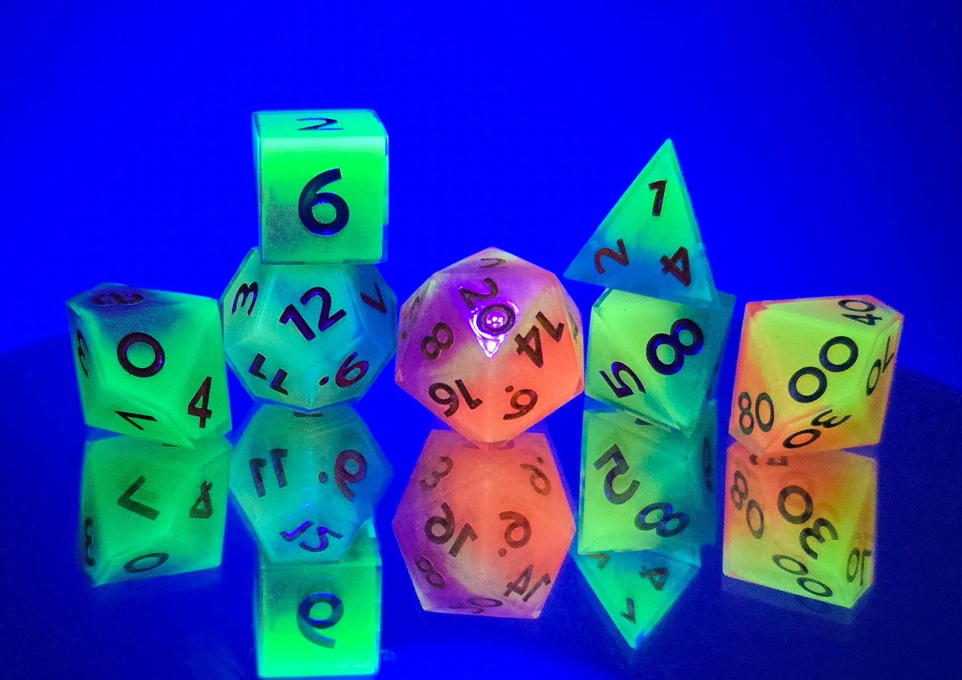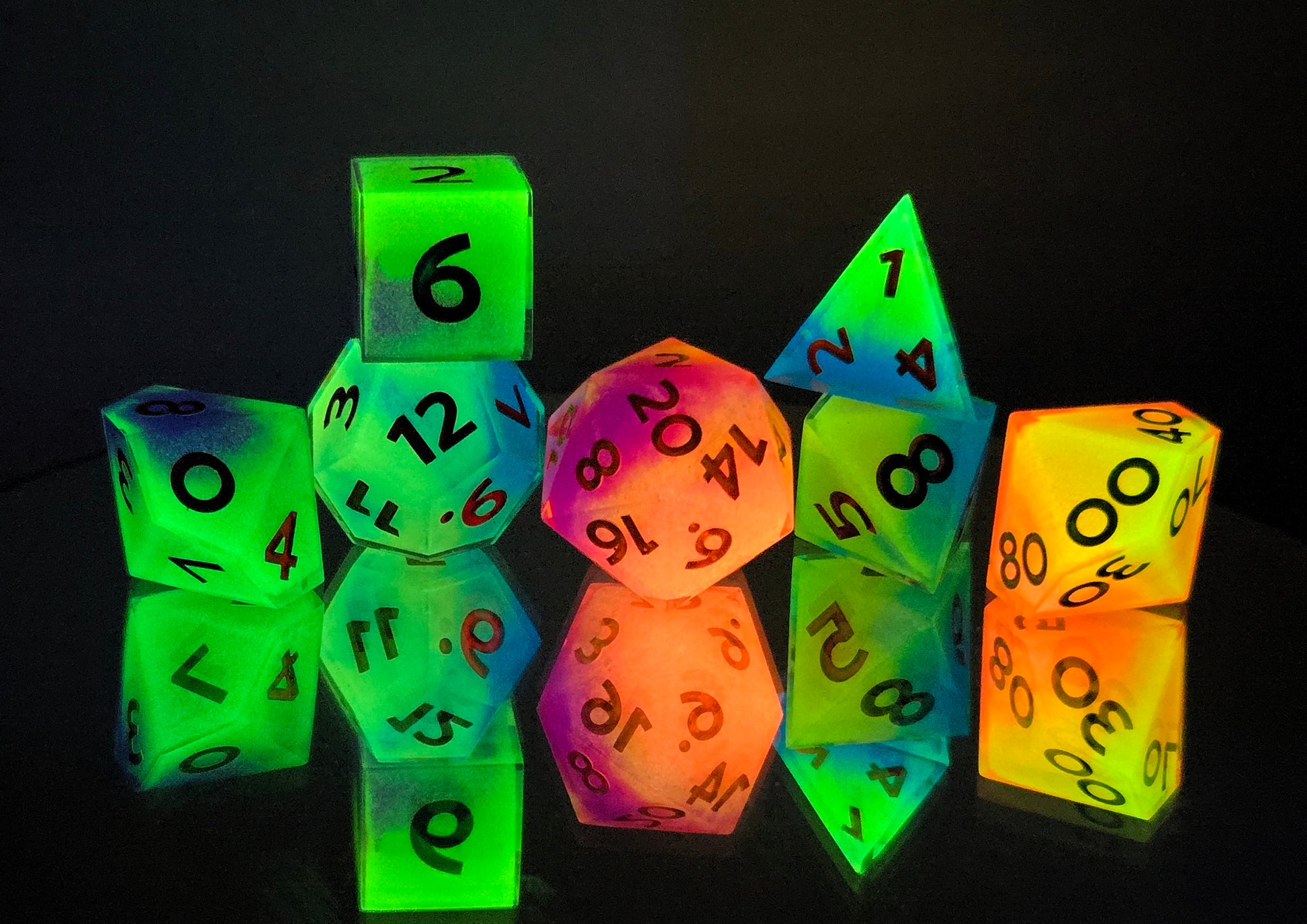 A full standard 7 piece polyhedral set (d20, d12, d%, d10, d8, d6, and d4) of neon glow-in-the-dark dice with bright numbering. Every set is unique and no color combination is the same.