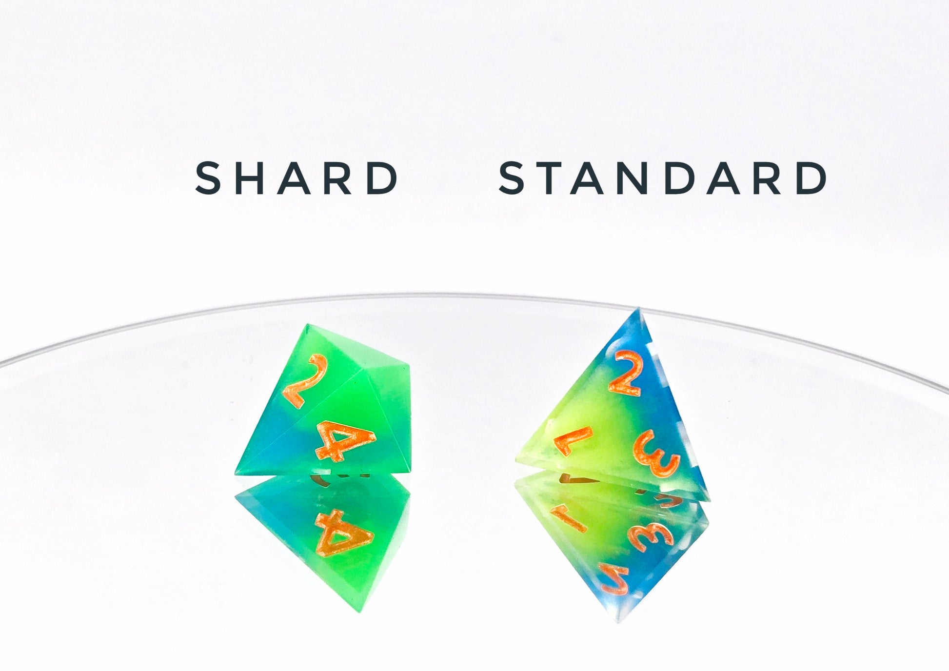 This set comes with a choice of d4 shape as shown in the photo. Please leave a note at checkout (or email after placing the order!) which you would prefer. The standard caltrop will be sent if no preference is given.