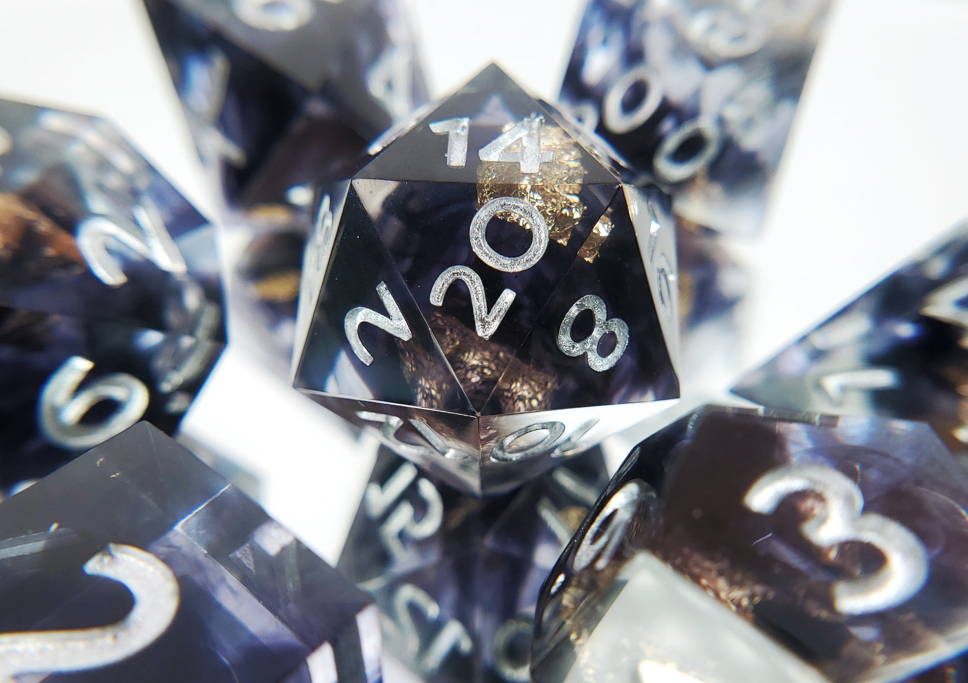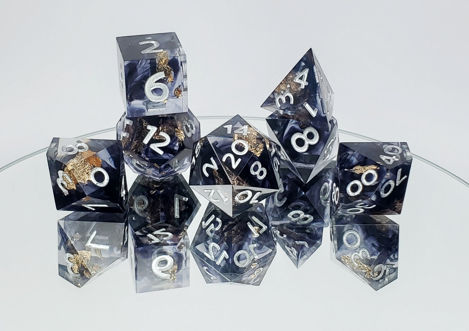 A full standard 7 piece polyhedral set (d20, d12, d%, d10, d8, d6, and d4) of transparent grey with black smoke and gold flakes inside and dark silver numbering.