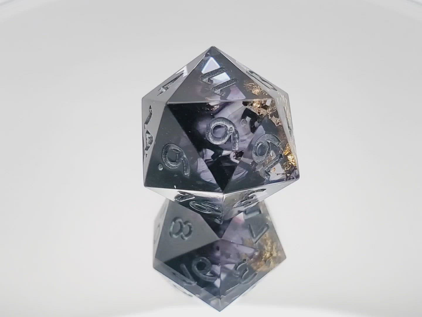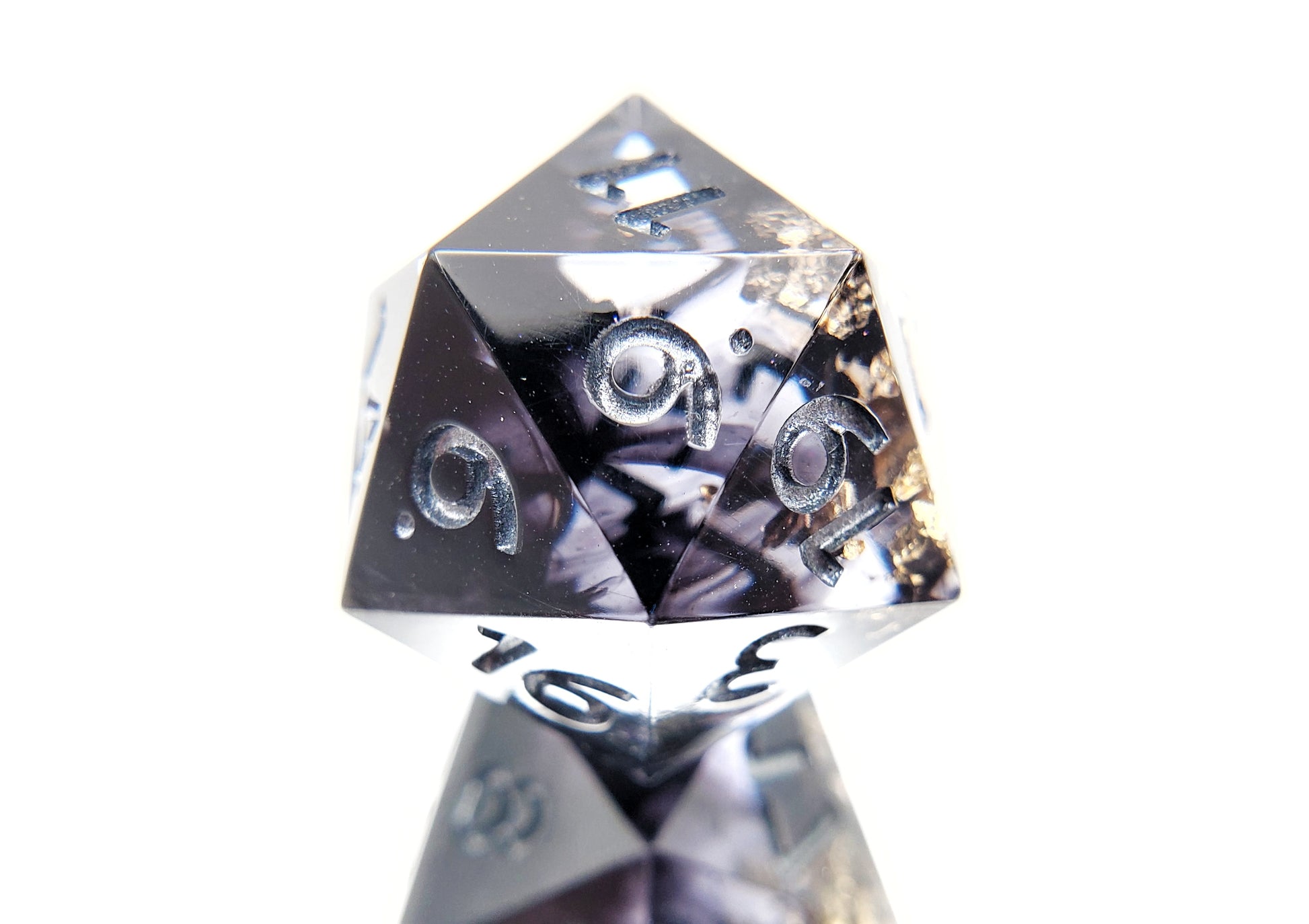 A standard sized d20 of transparent grey with black smoke and gold flakes inside and dark silver numbering.