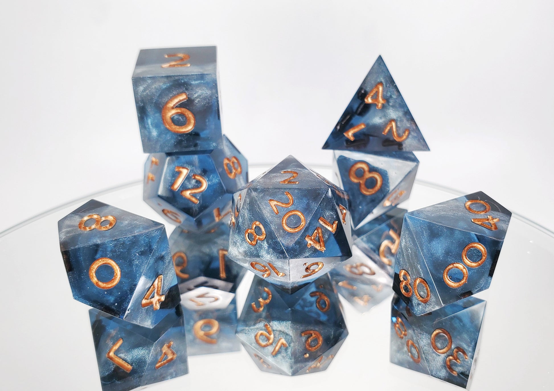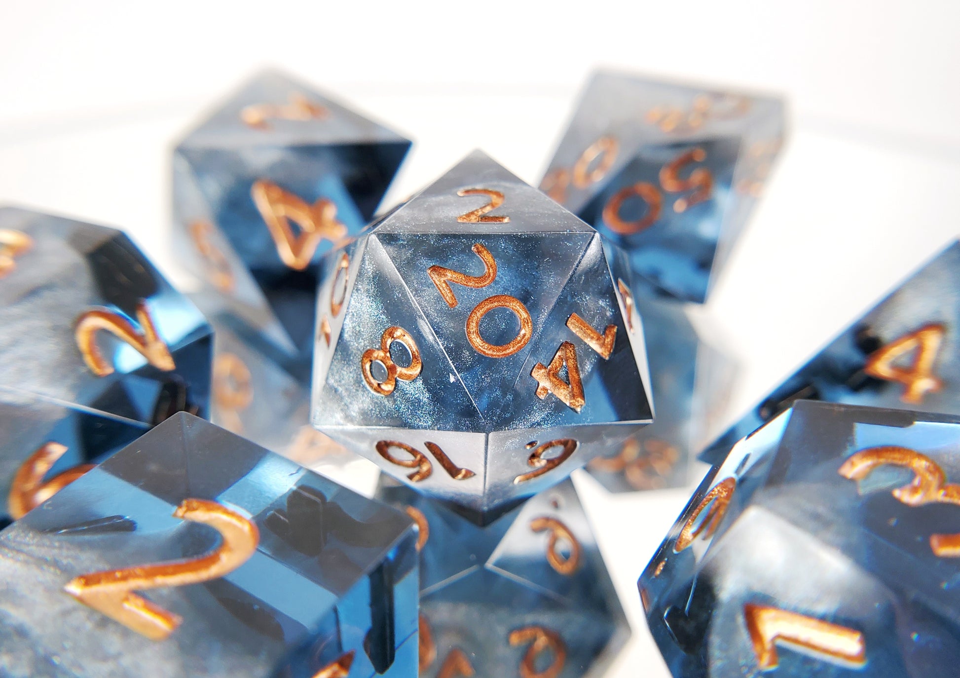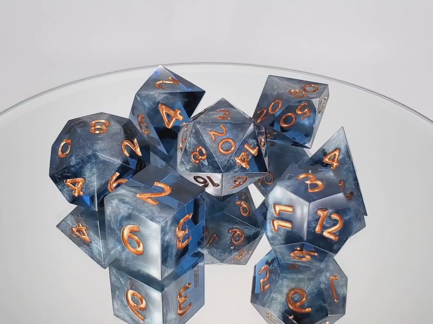 A full standard 7 piece polyhedral set (d20, d12, d%, d10, d8, d6, and d4) of grey-blue transparent resin with swirls of opaque silver and copper numbering.