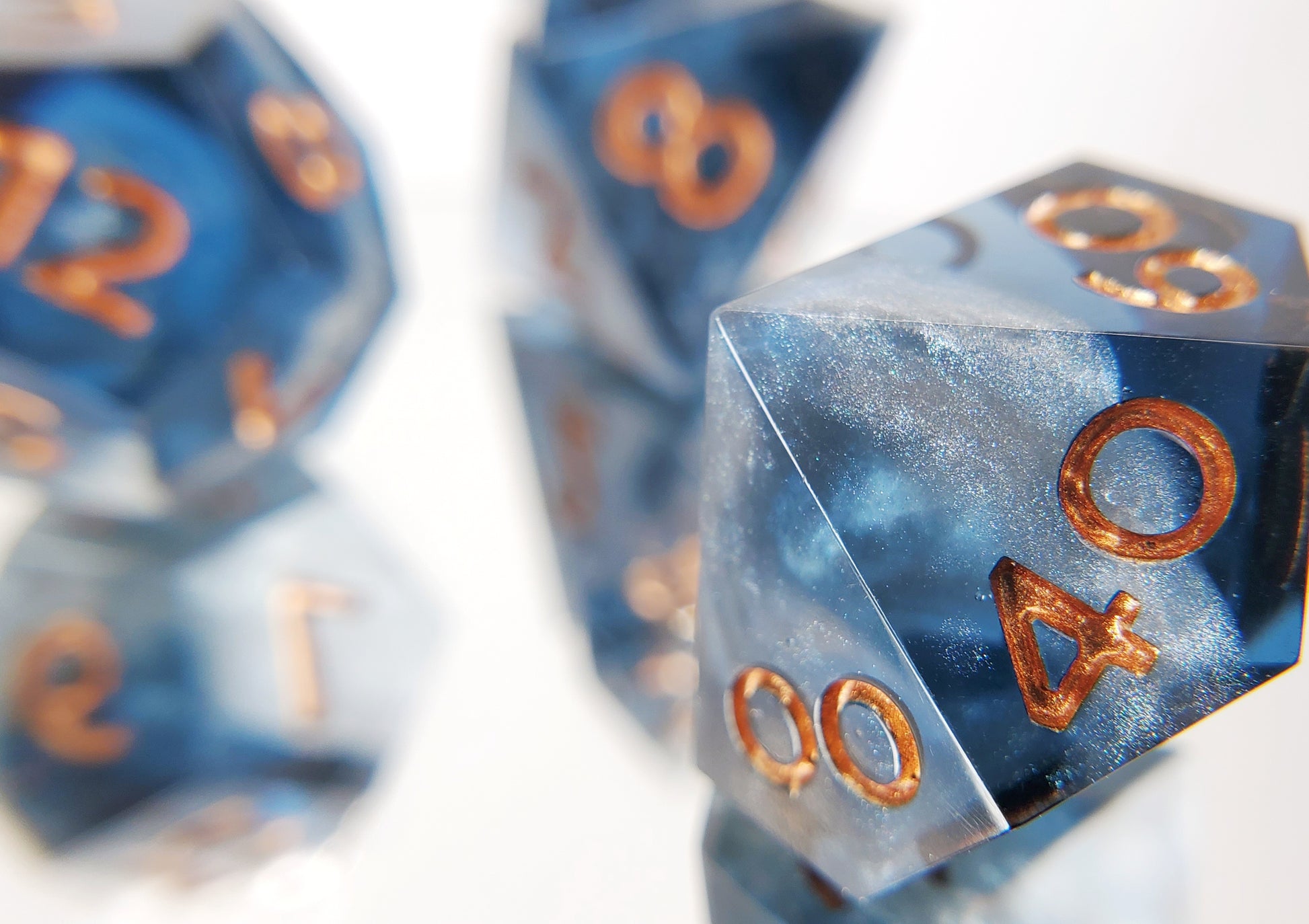 *Dice are entirely handmade from start to finish and therefore may have minor imperfections or color variations. Pictures are representative of the color and style but your exact set may vary. Please note color calibration of your screen may also vary. While they are just as balanced as commercially produced dice, it is recommended handmade dice be used for casual play only.