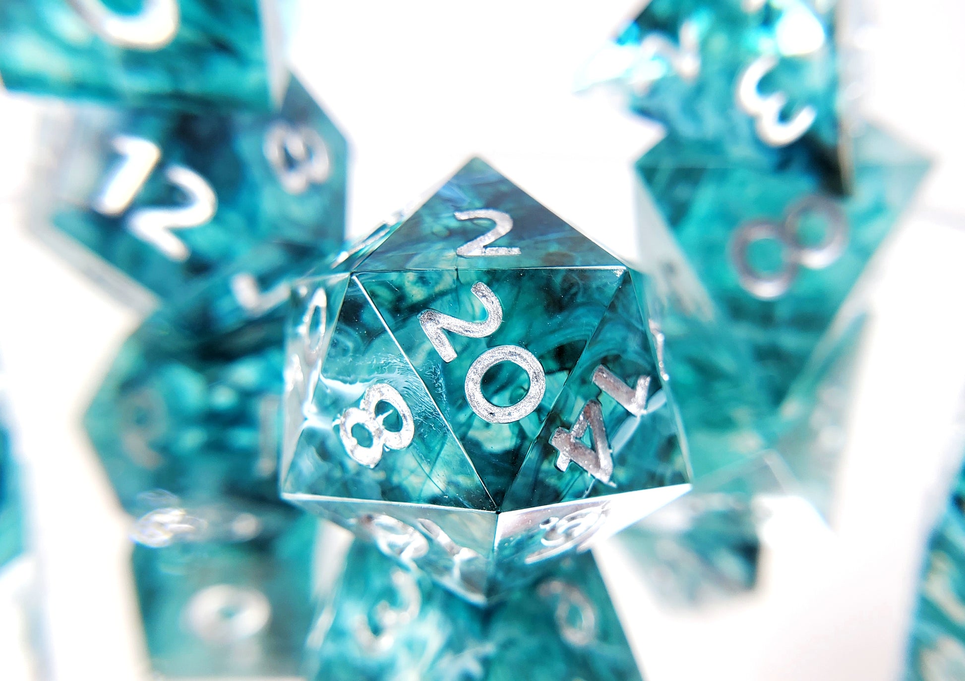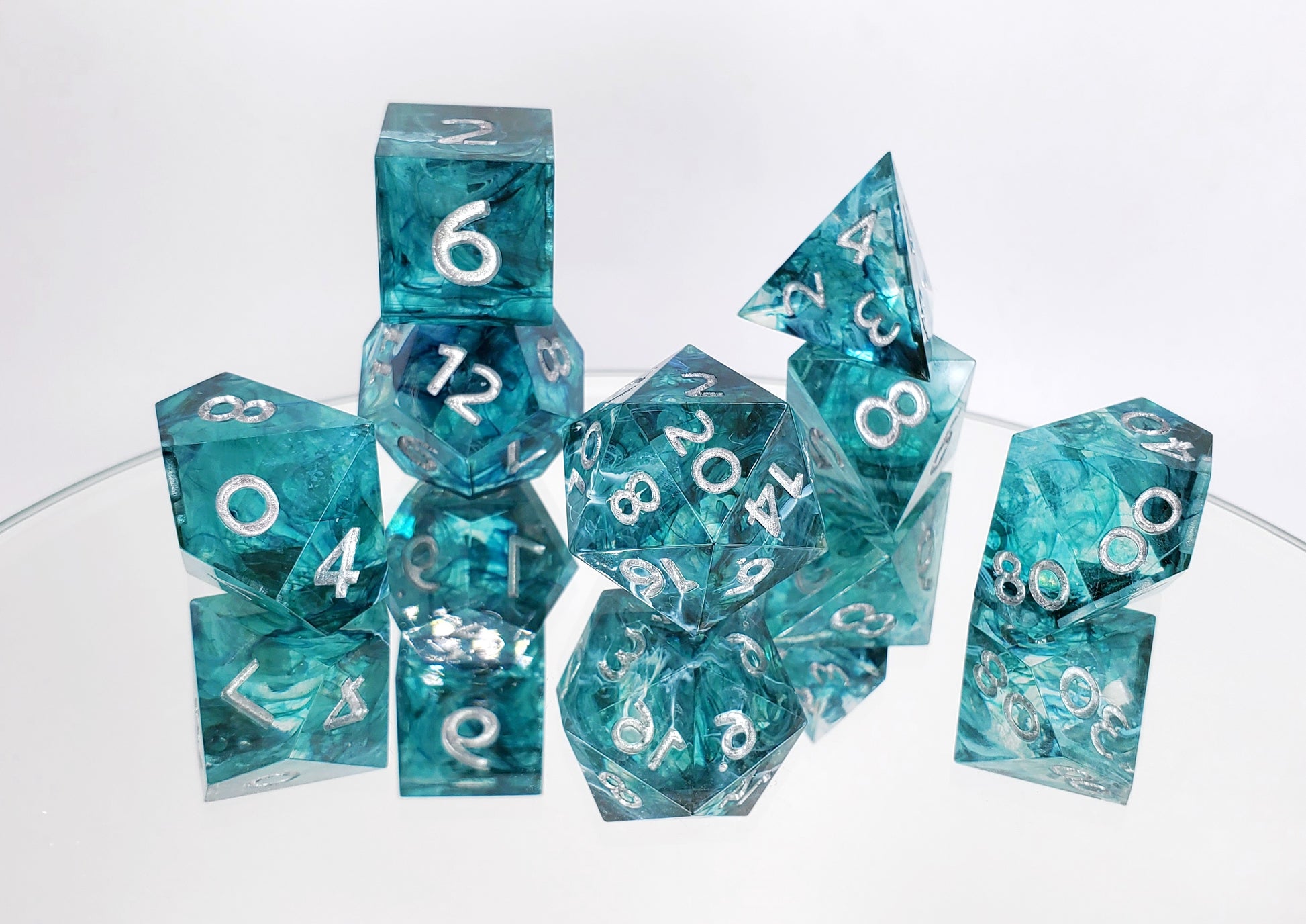 A full standard 7 piece polyhedral set (d20, d12, d%, d10, d8, d6, and d4) of transparent muddled blue-green and white swirls with silver numbers.